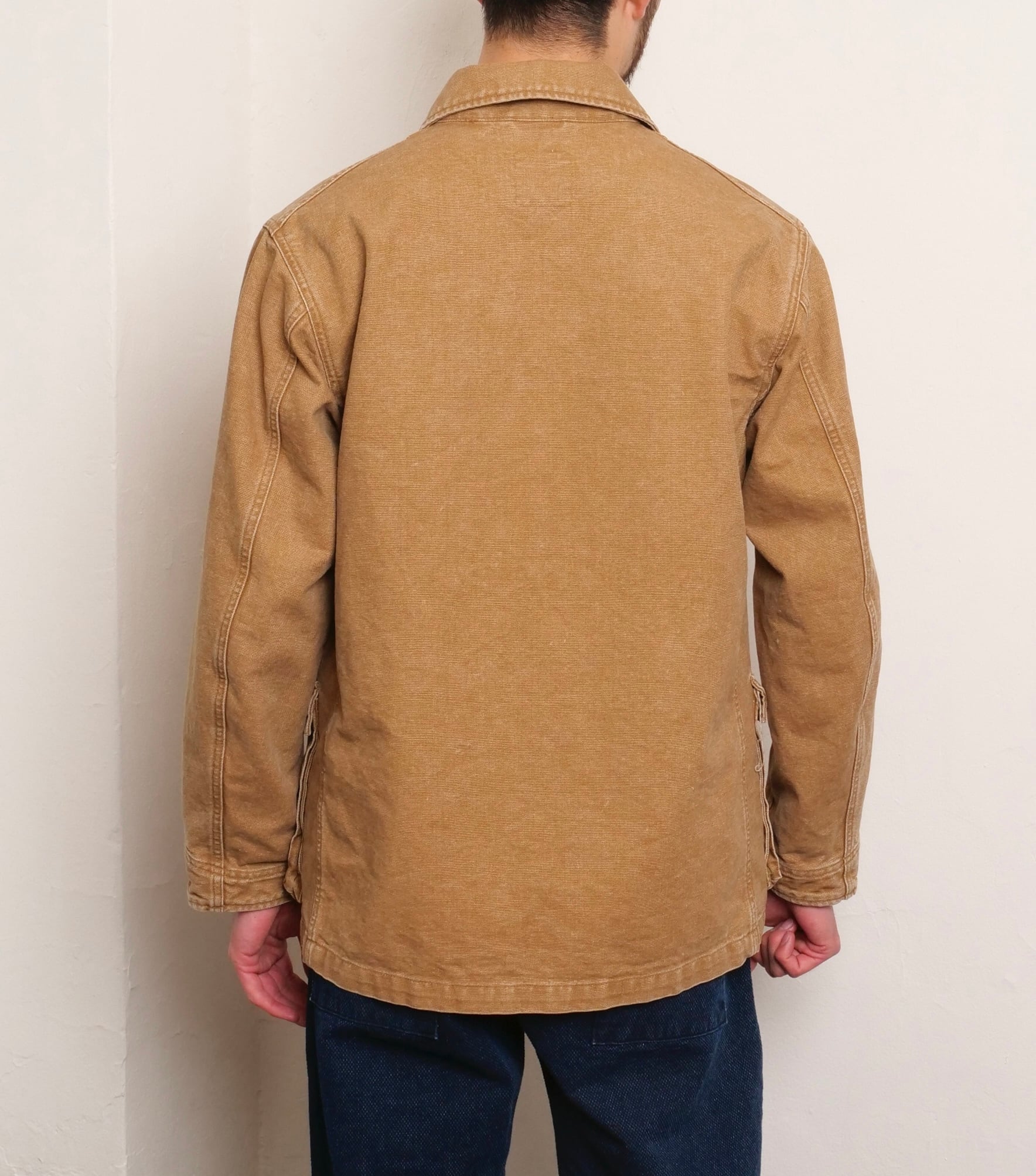 染料技術に乏しかった頃の中まで染まらないダックをリプロした中白素材を使用し、製品にて ストーンバイオ加工を施し履き込んだような風合いを持つ。ゆったりとしたシルエット。