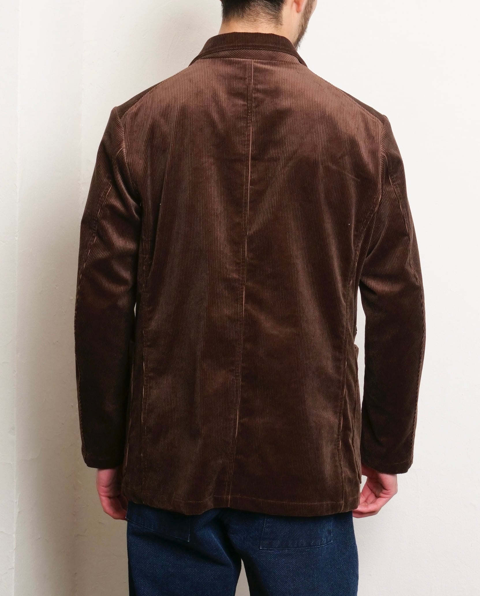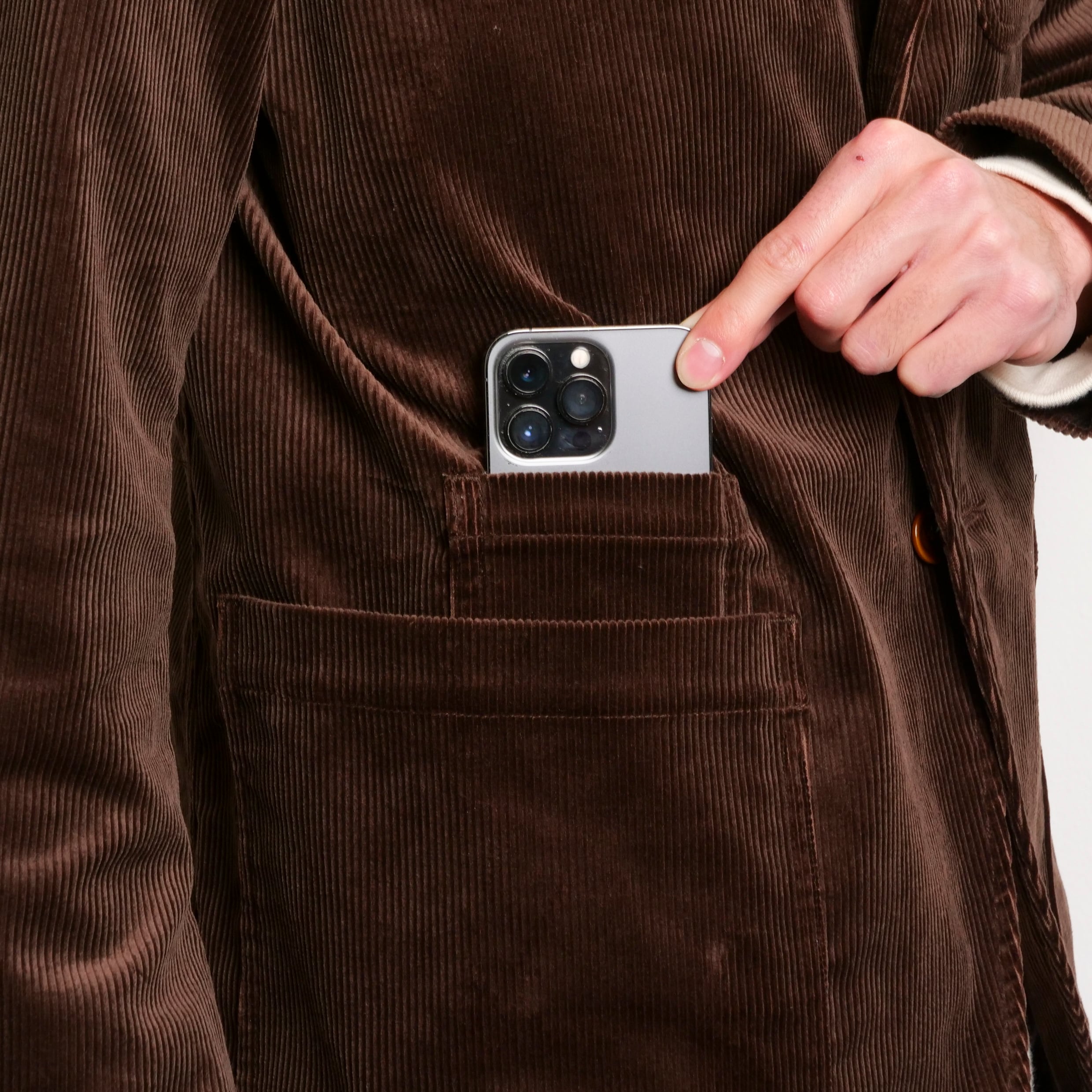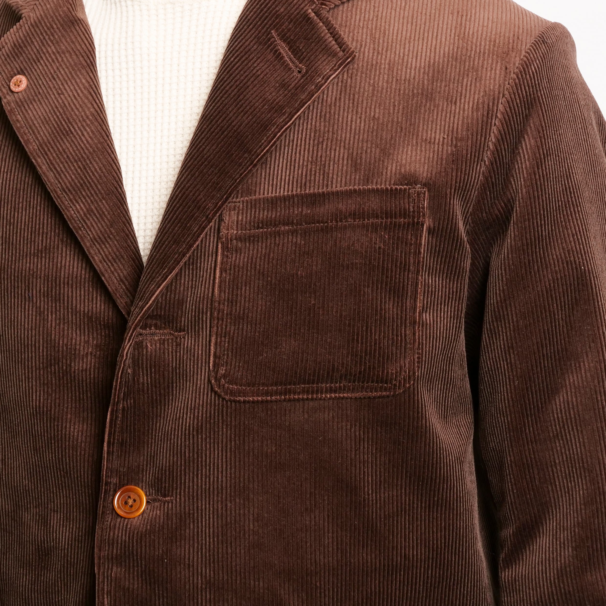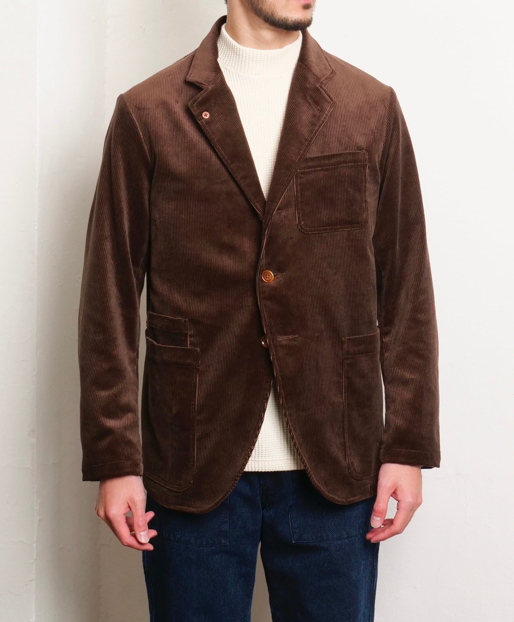 1930sのイギリスのサックコートがイメージソース。3パッチポケット3つボタン、ノーベントのシンプルなディティールに右腰にスマートフォンが収まる チェンジポケットをつけ現代の街着としての要素をプラスした。内側は大身返し・觀音裏地