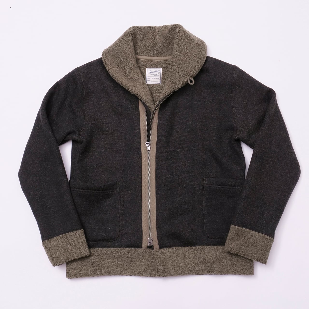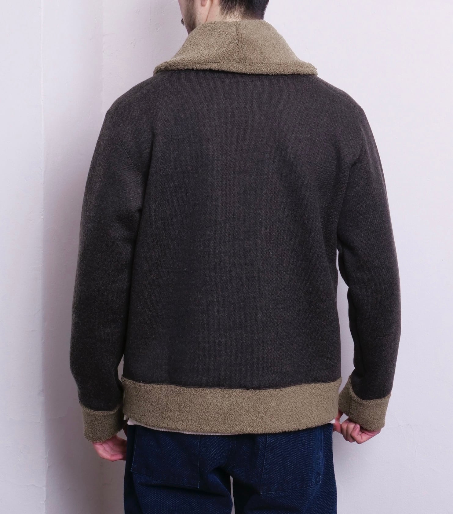 ウールコットン混紡のボアを使用した羽織ものシリーズ。同素材を使用した3年目はロイヤルエアフォースのムートンを使用したフライトjk (通称アーヴィンJK)イメージソースとしたジップアップJK。