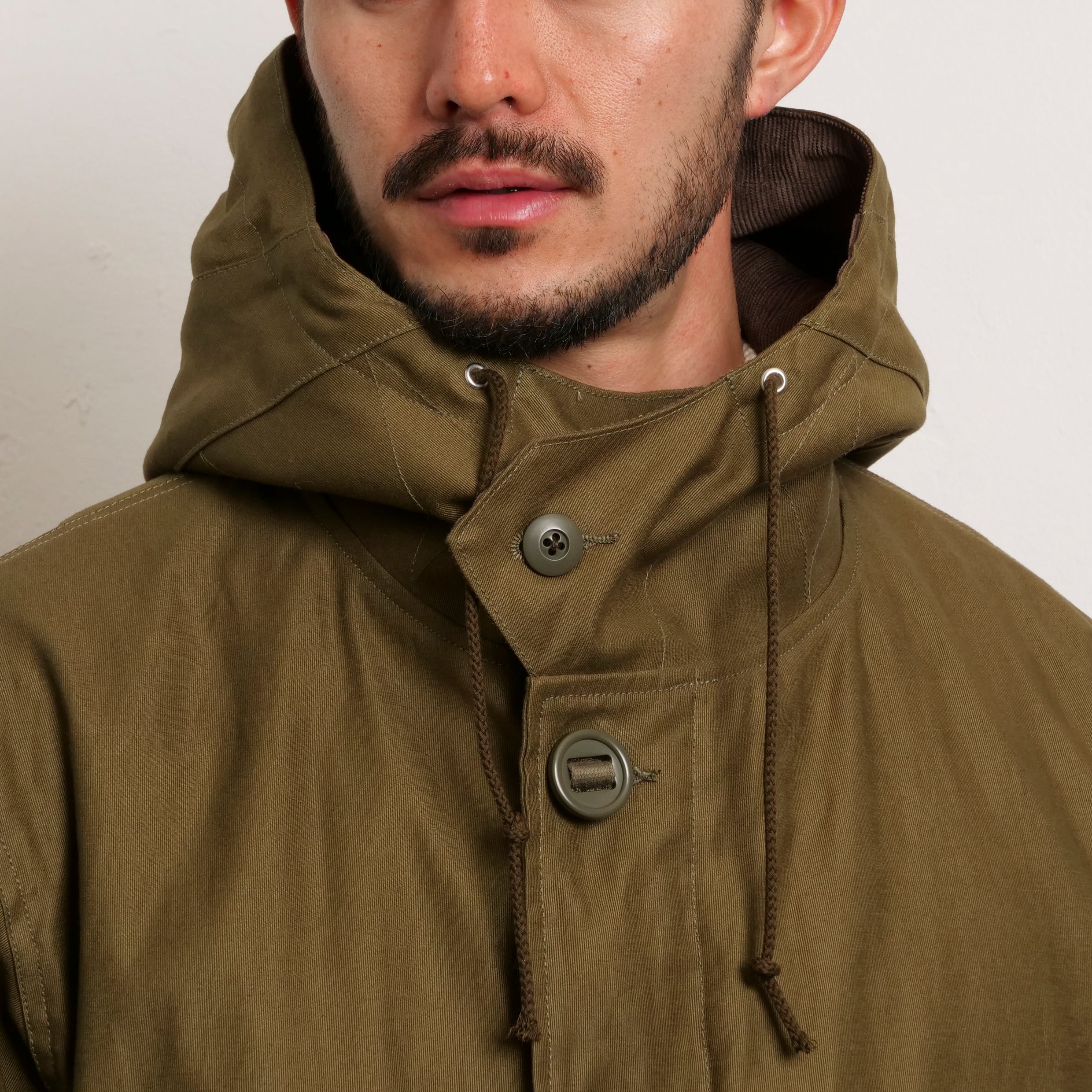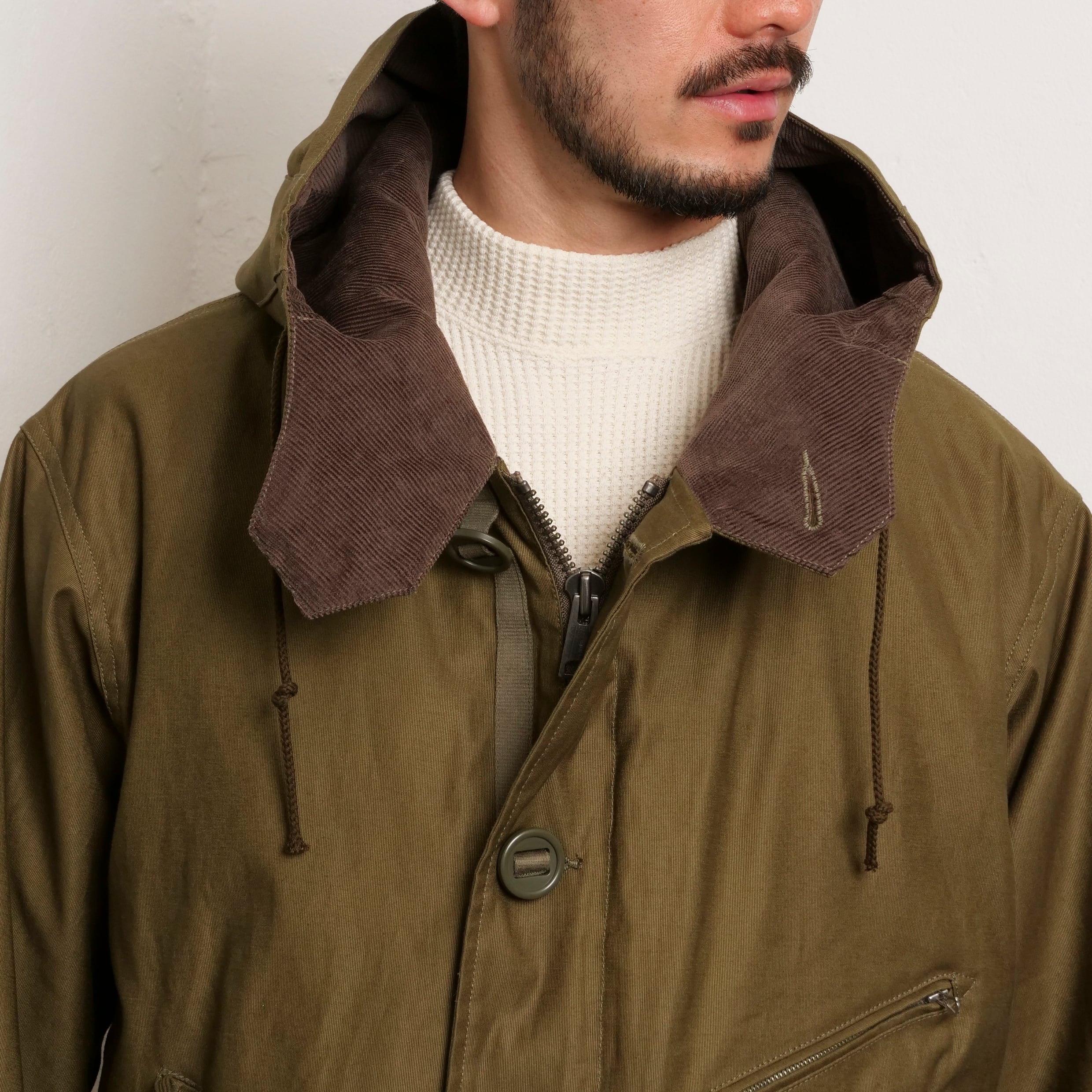 フード裏地にコーデュロイを貼りフロント合わせが独特の形状を持ち大ぶりのパラシュートボタンと前後に調整可能なアジャストベルトなど他国のそれにはない独特のディティールを取り入れ、リデザインした。