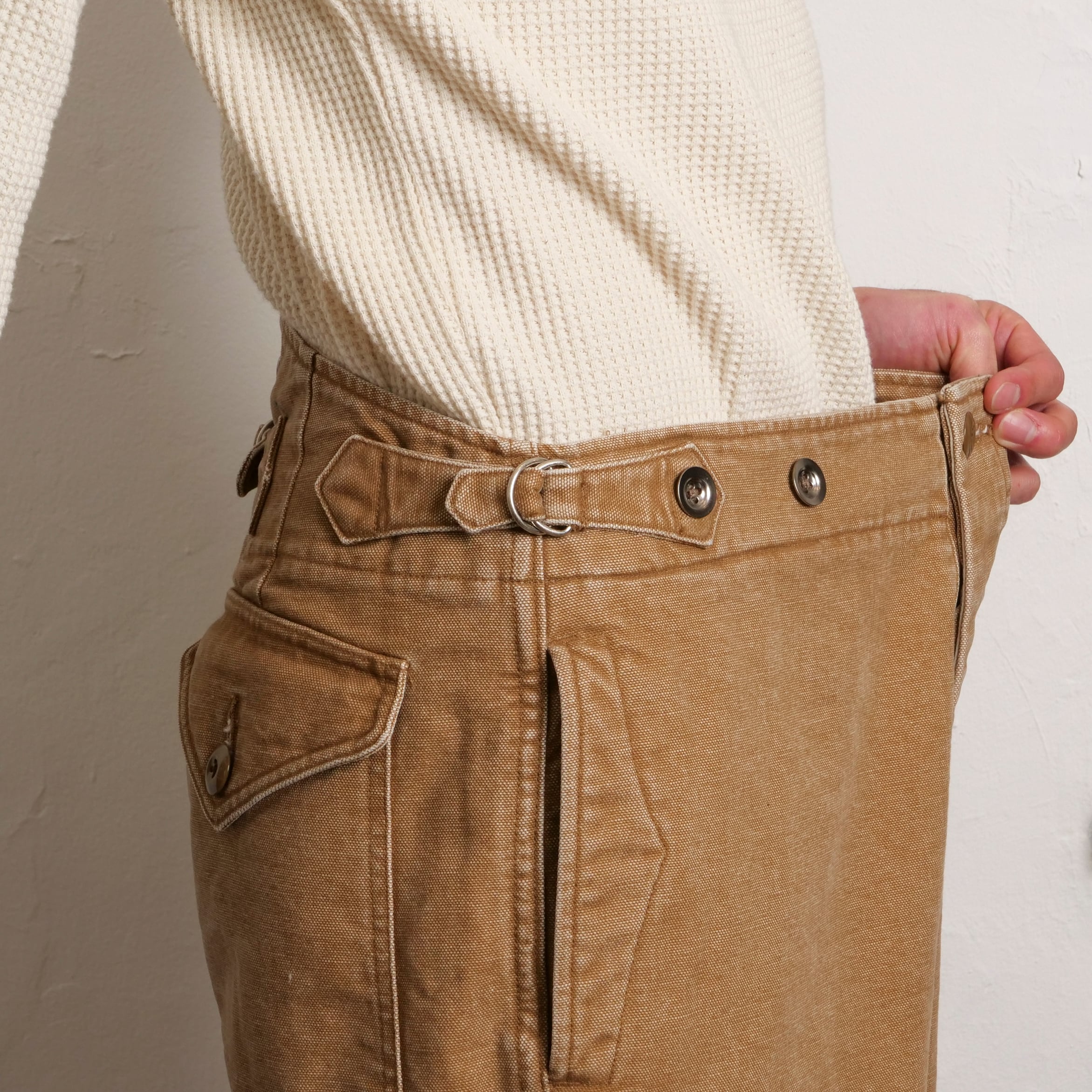 ゆったりとしたシルエットでベルトループのないサスペンダー仕様であるが脇と後の3箇所のDカンベルトを絞ることでサスペンダー&ベルトなしで着用可能となる。