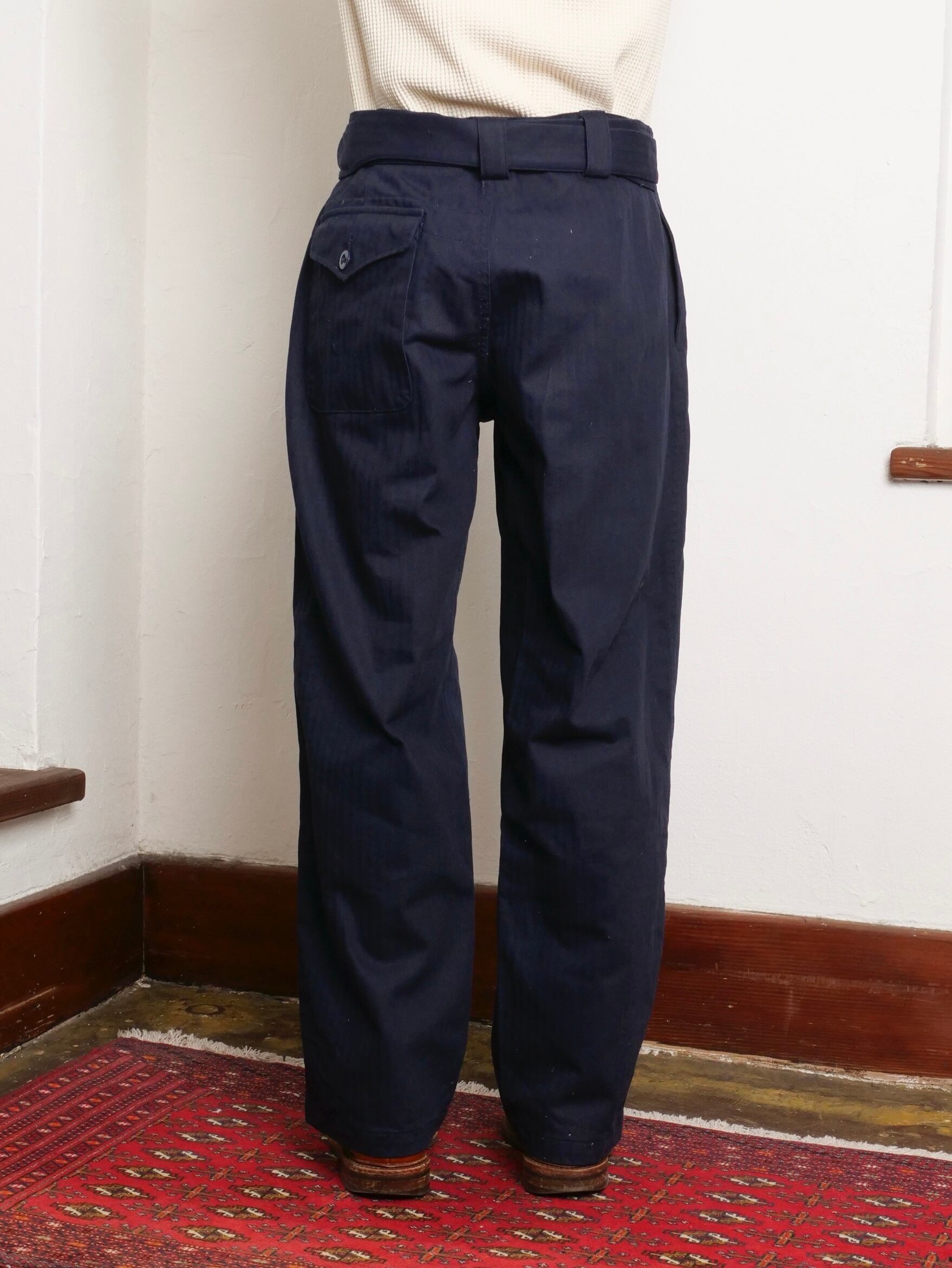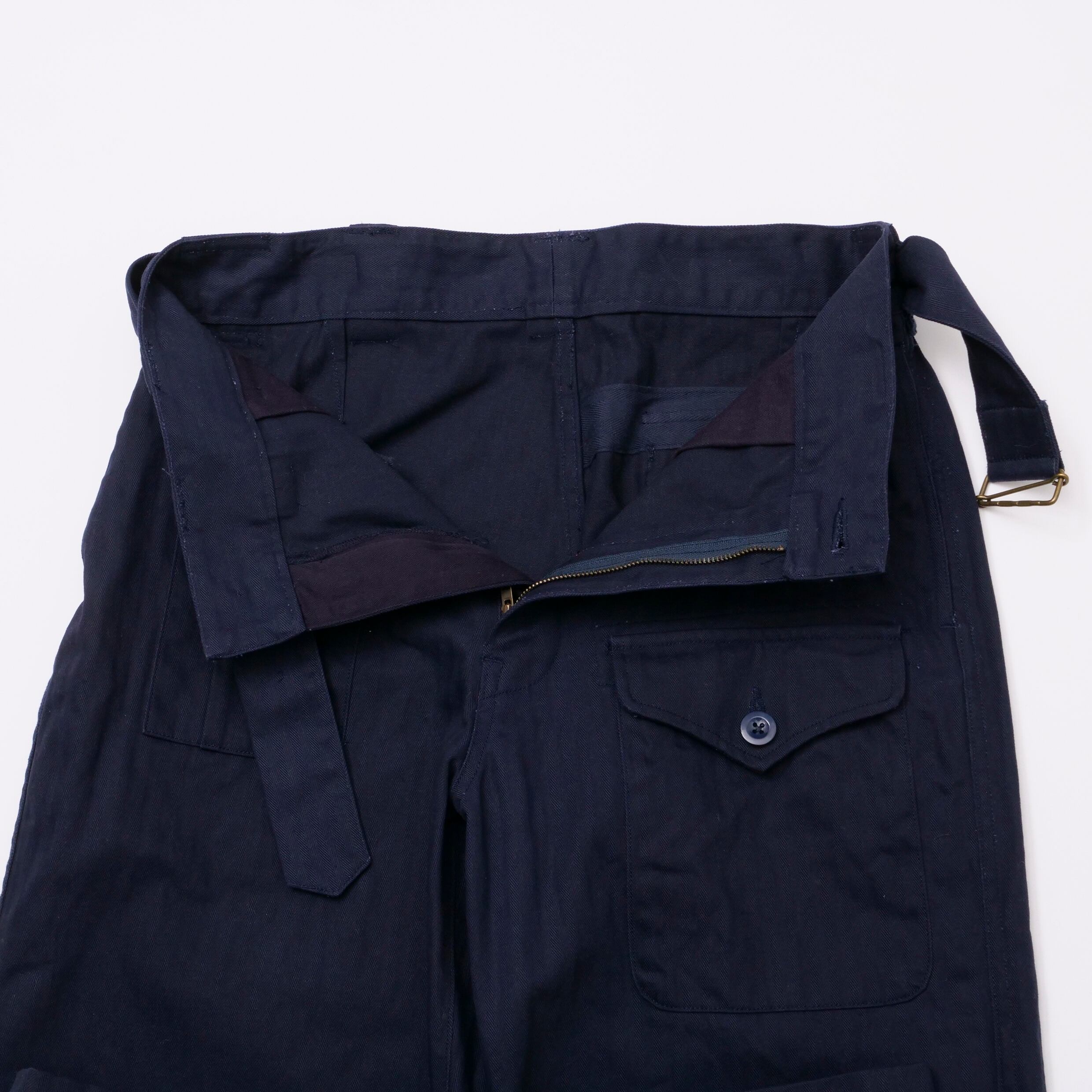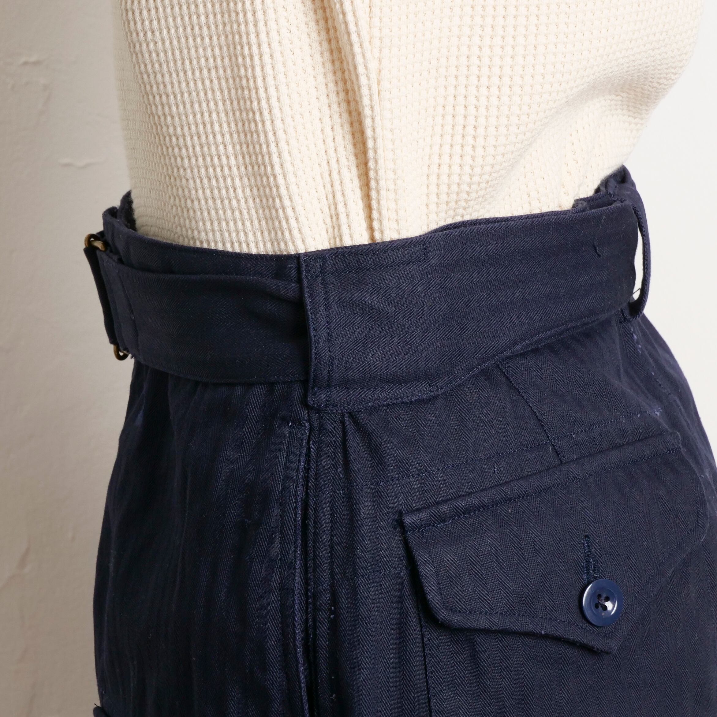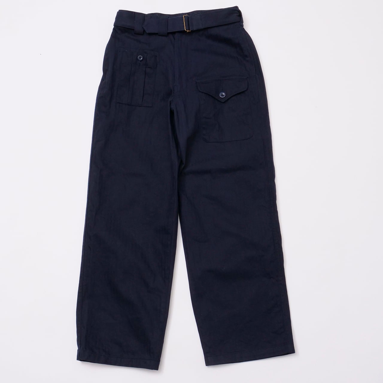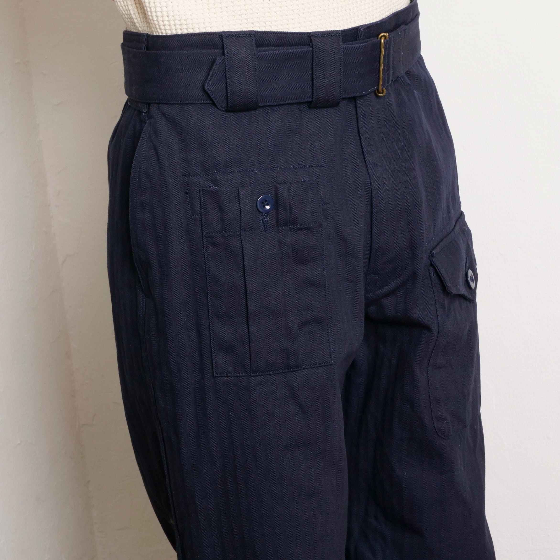 フレンチアーミーのモーターサイクルオーバーパンツの特徴的な共地ベルトの仕様とブリティッシュアーミーのオーバーパンツのフロントのポケット仕様を掛け合わせたミリタリーパンツ。