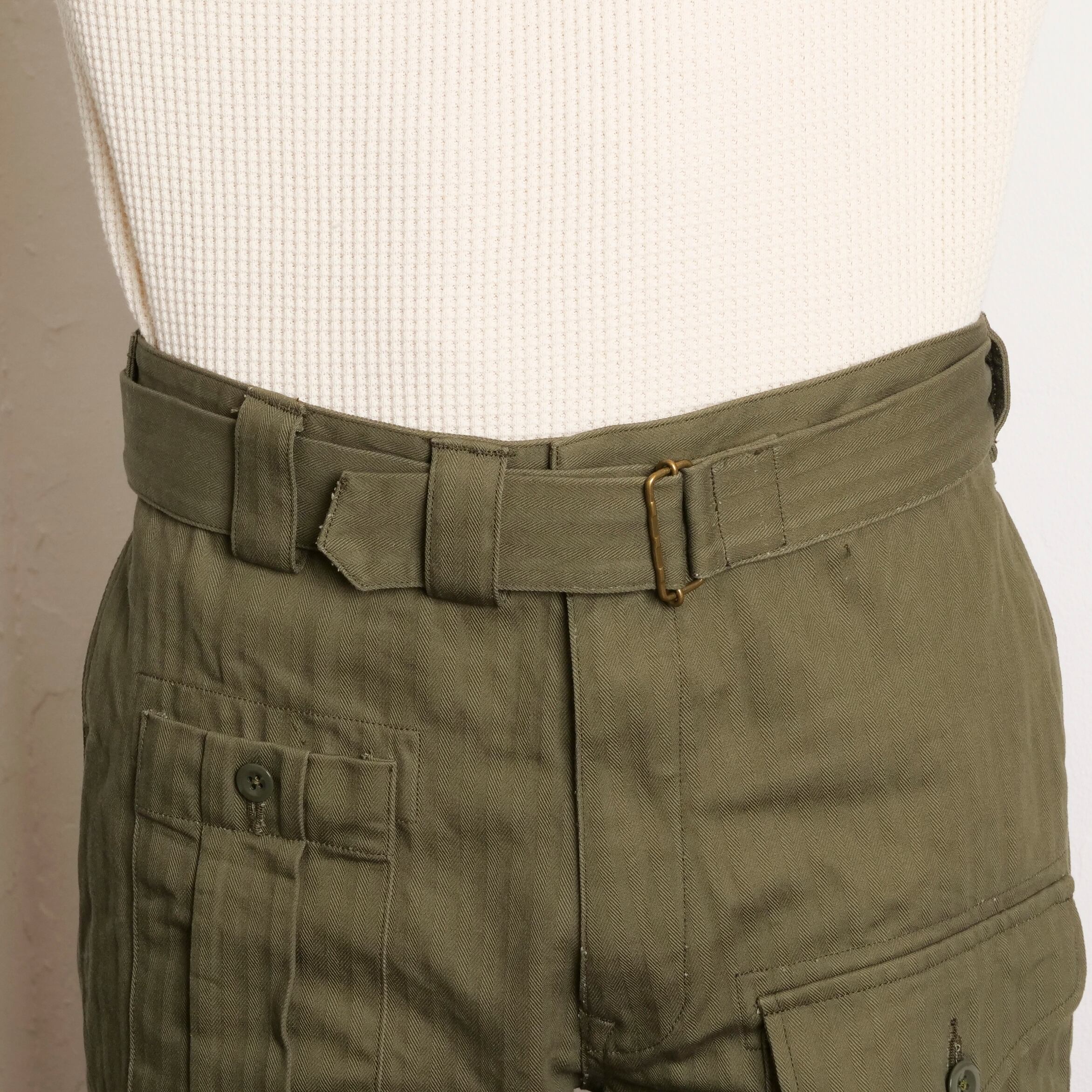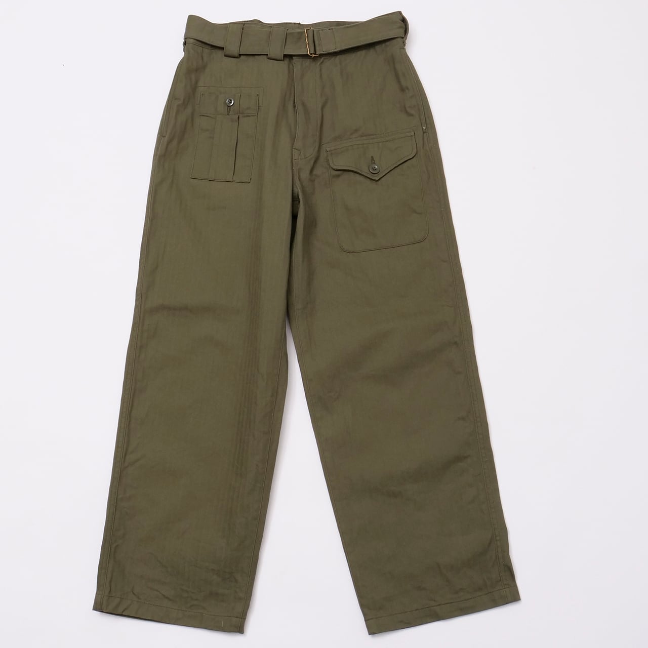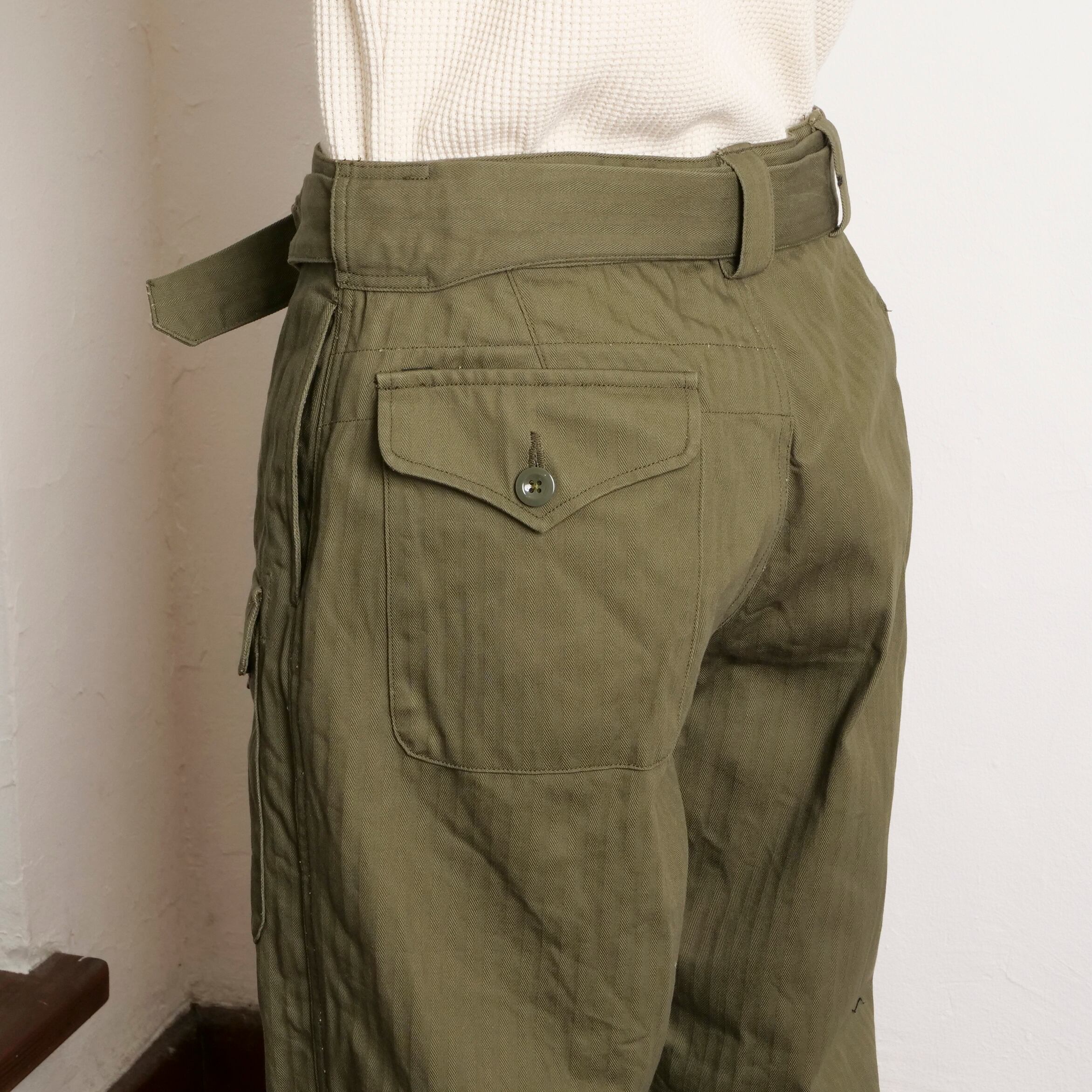 フレンチアーミーのモーターサイクルオーバーパンツの特徴的な共地ベルトの仕様とブリティッシュアーミーのオーバーパンツのフロントのポケット仕様を掛け合わせたミリタリーパンツ。