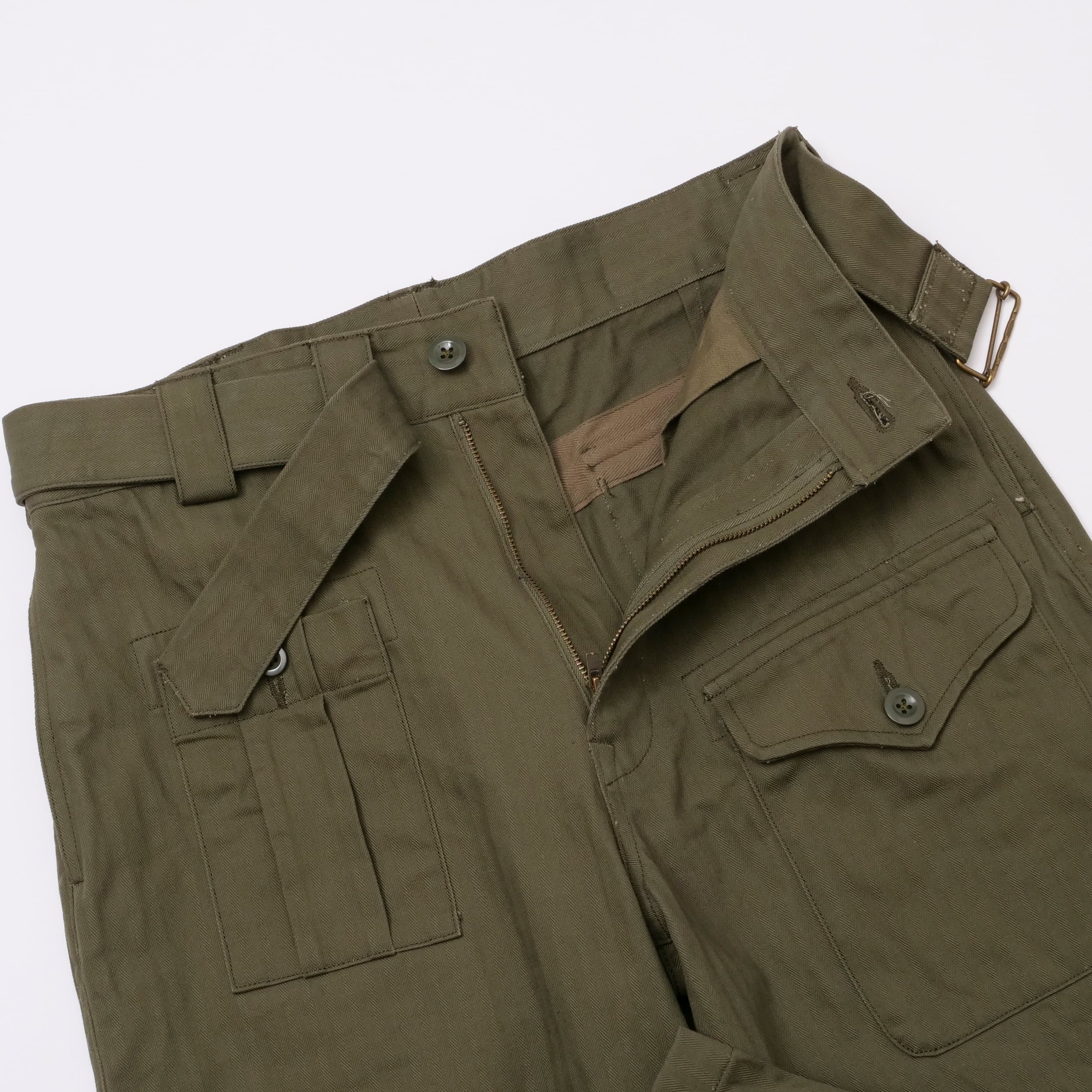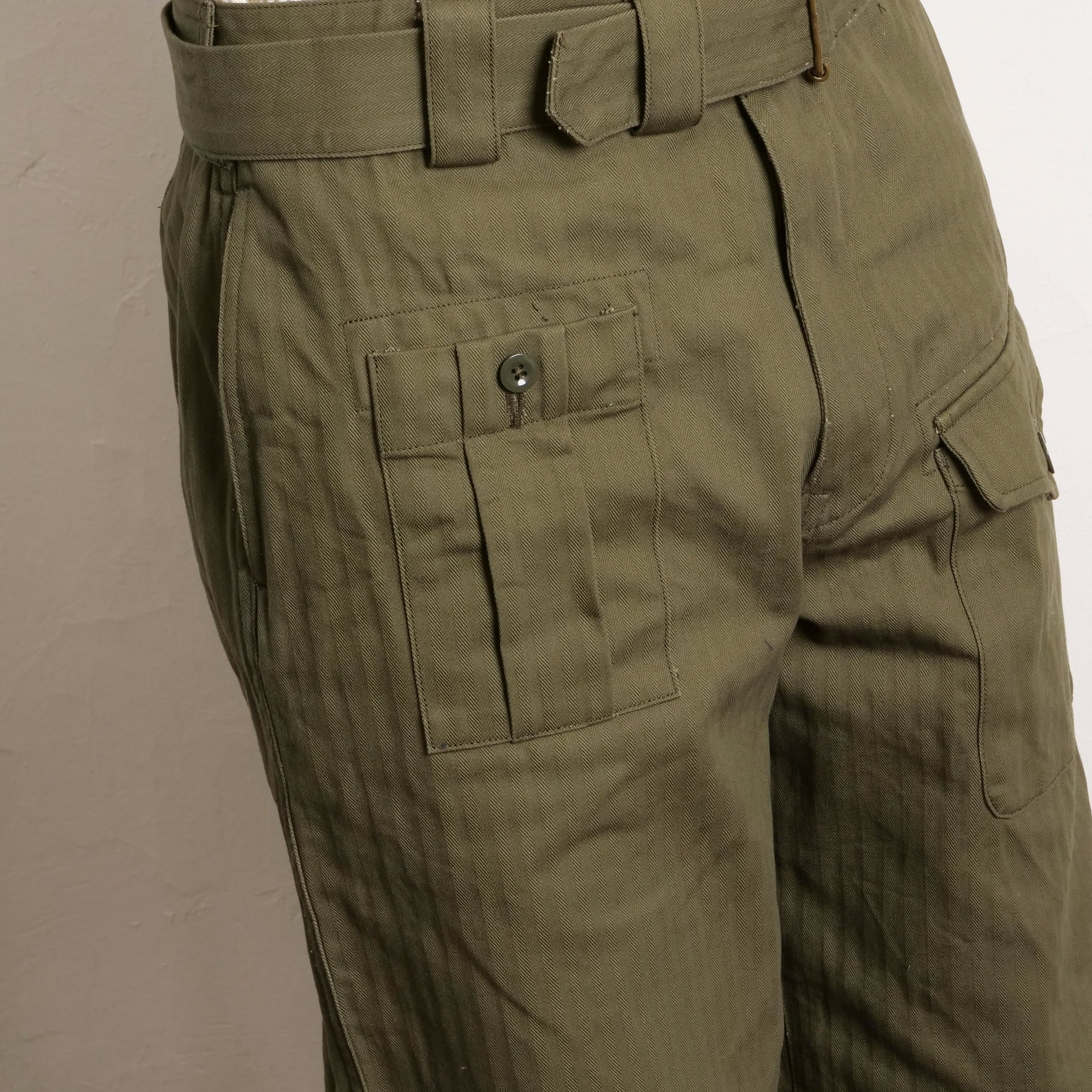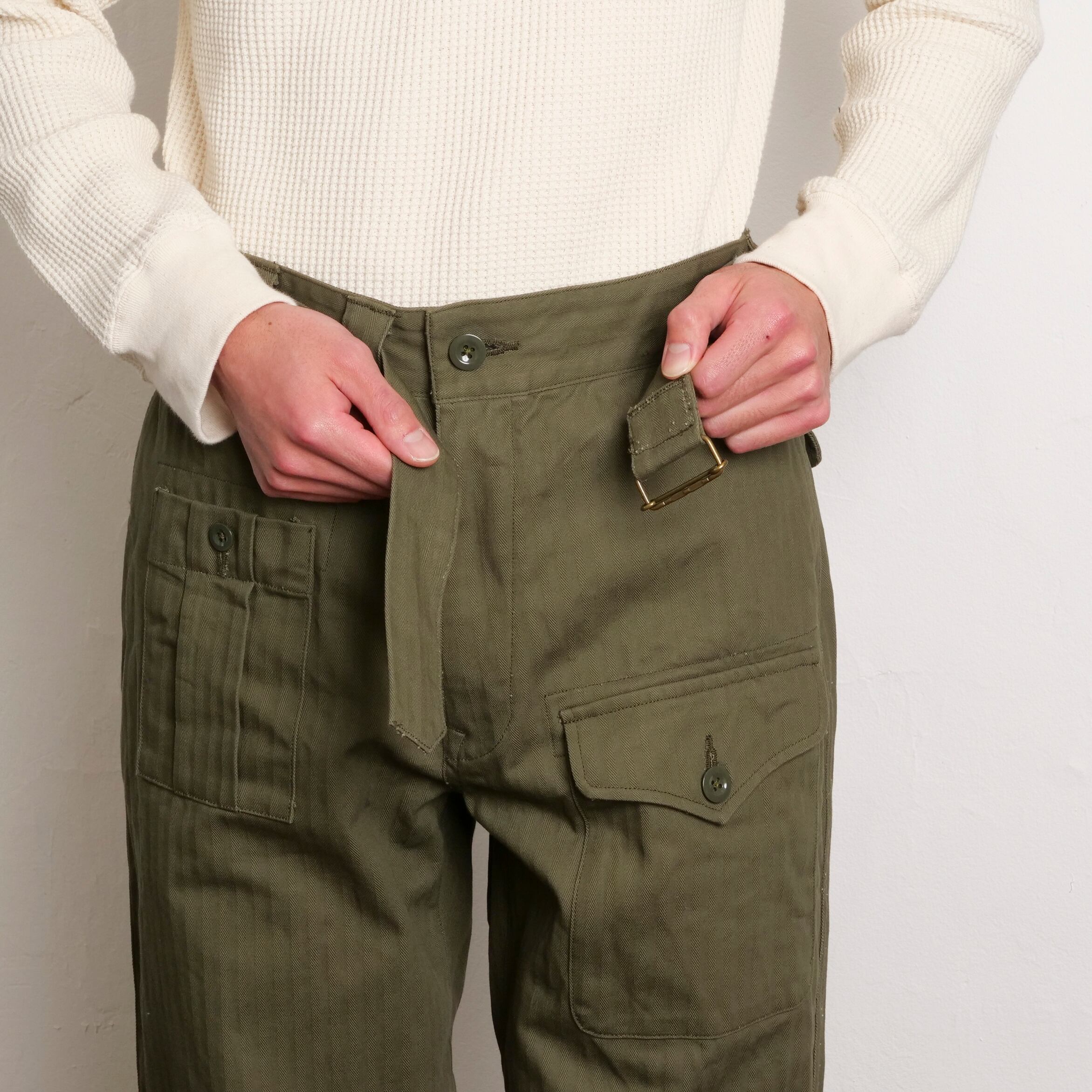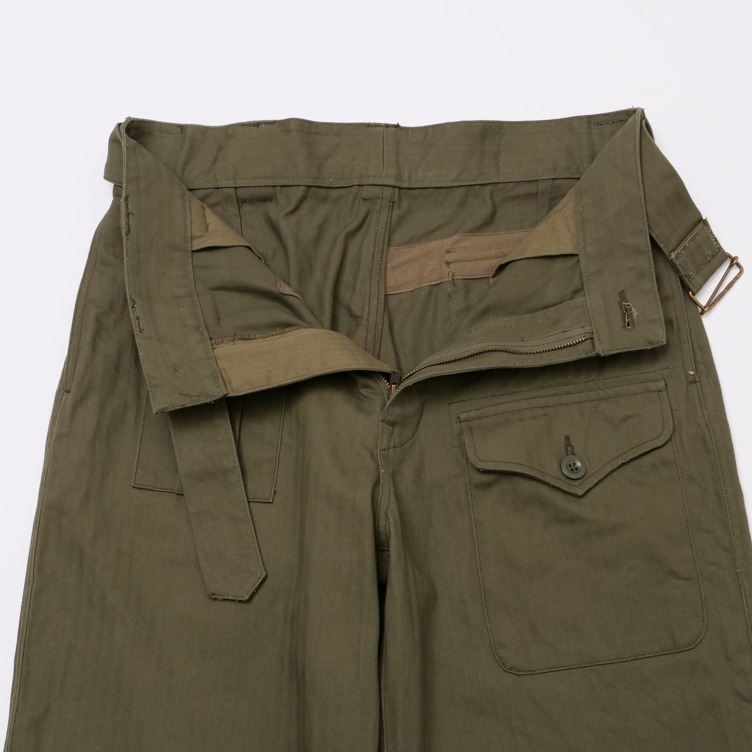フレンチアーミーのモーターサイクルオーバーパンツの特徴的な共地ベルトの仕様とブリティッシュアーミーのオーバーパンツのフロントのポケット仕様を掛け合わせたミリタリーパンツ。