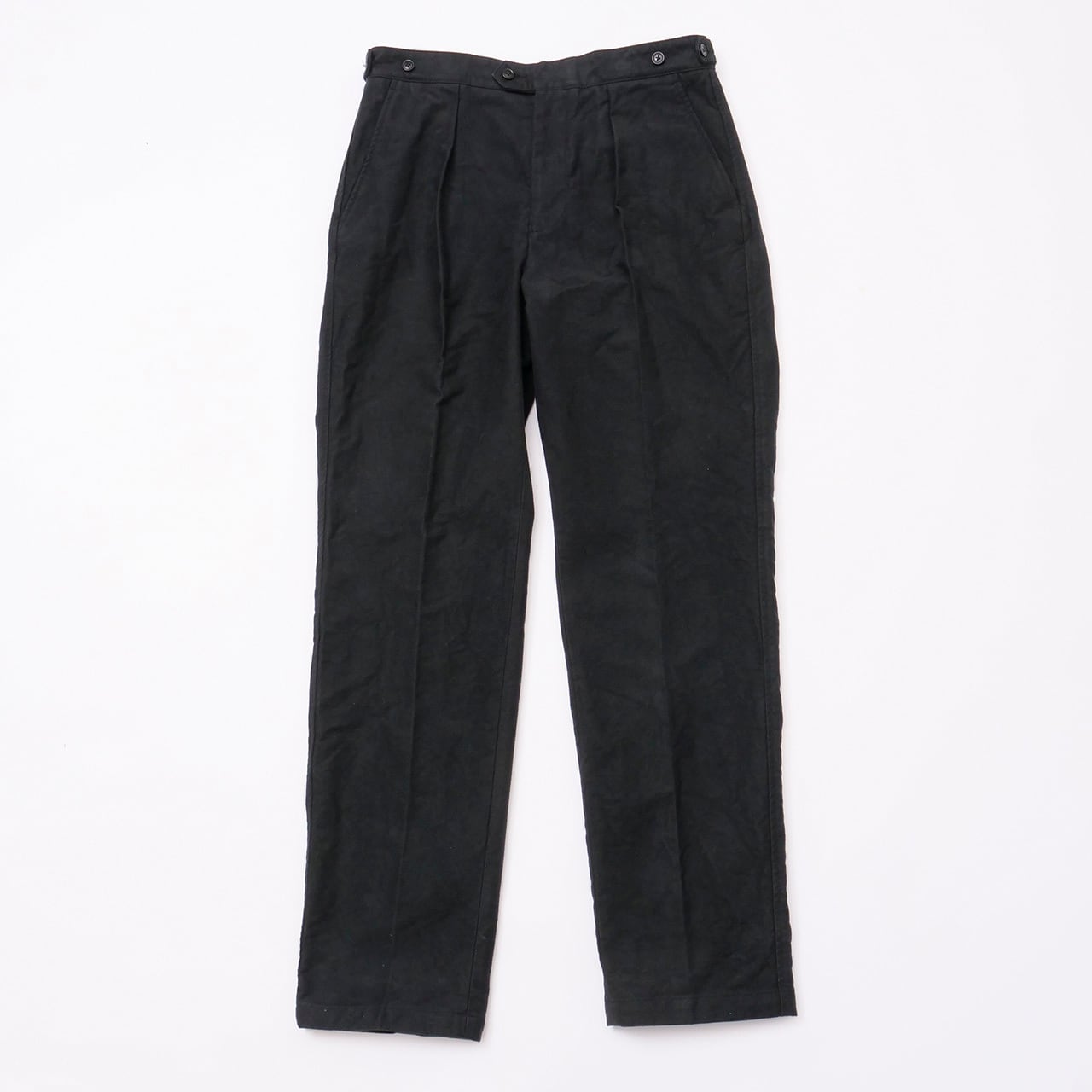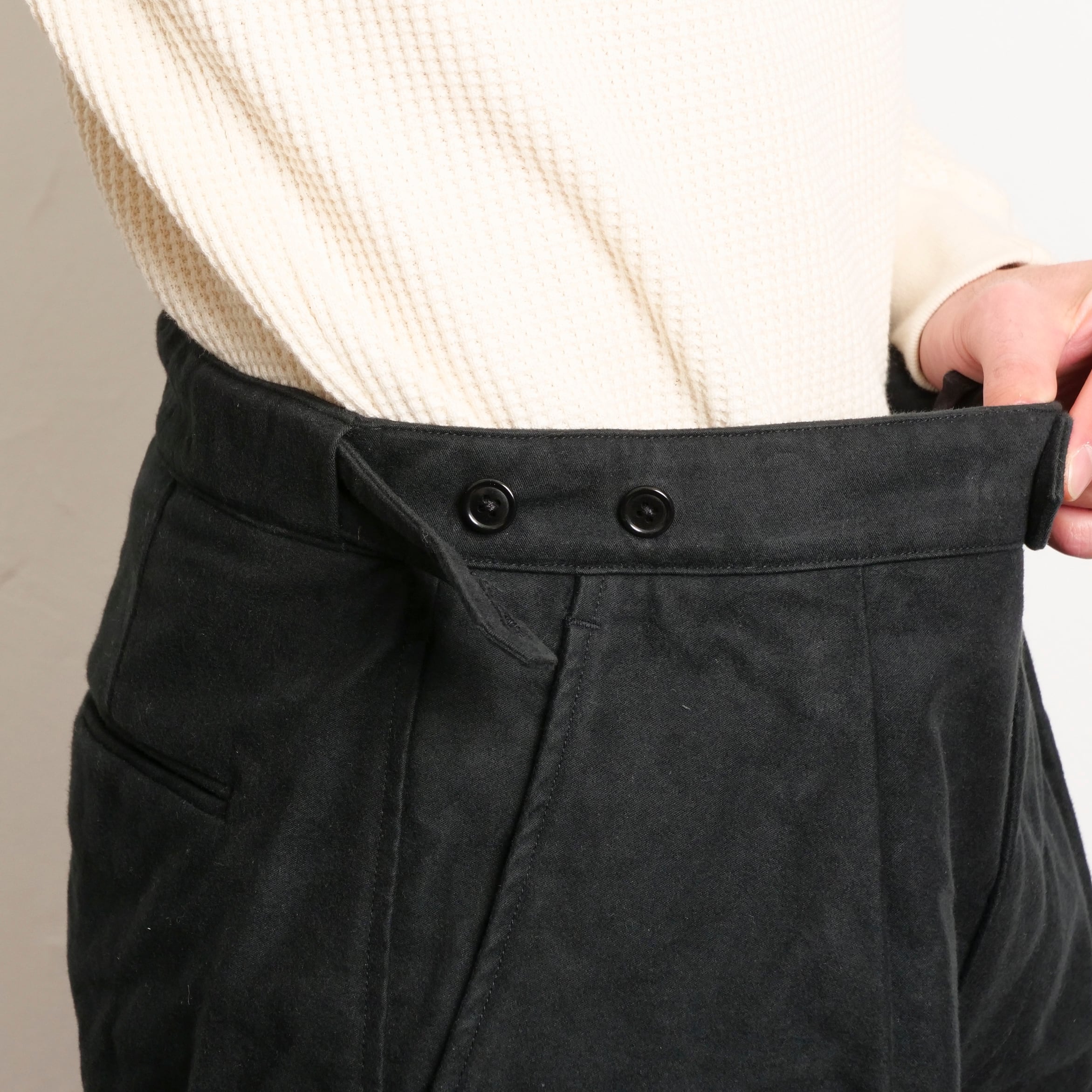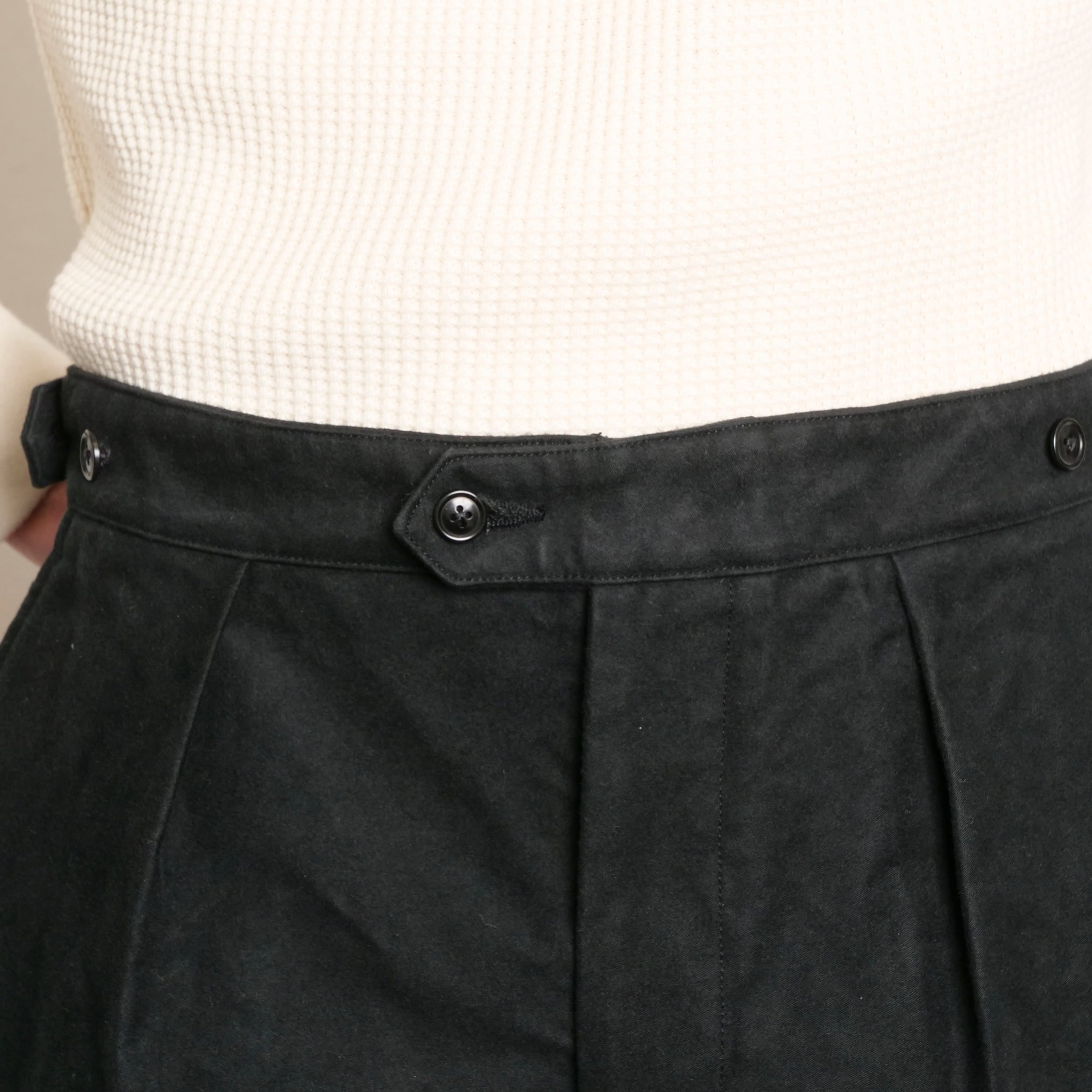 伝統的なイギリスの乗馬用のゴム入りアジャストベルトのディティールを取り入れたクラシックなベルトレストラウザース。フロントはワンプリーツ、定番トラウザースのClarkeと同じ膝から下はややきつめのテーパードが入るシルエット。