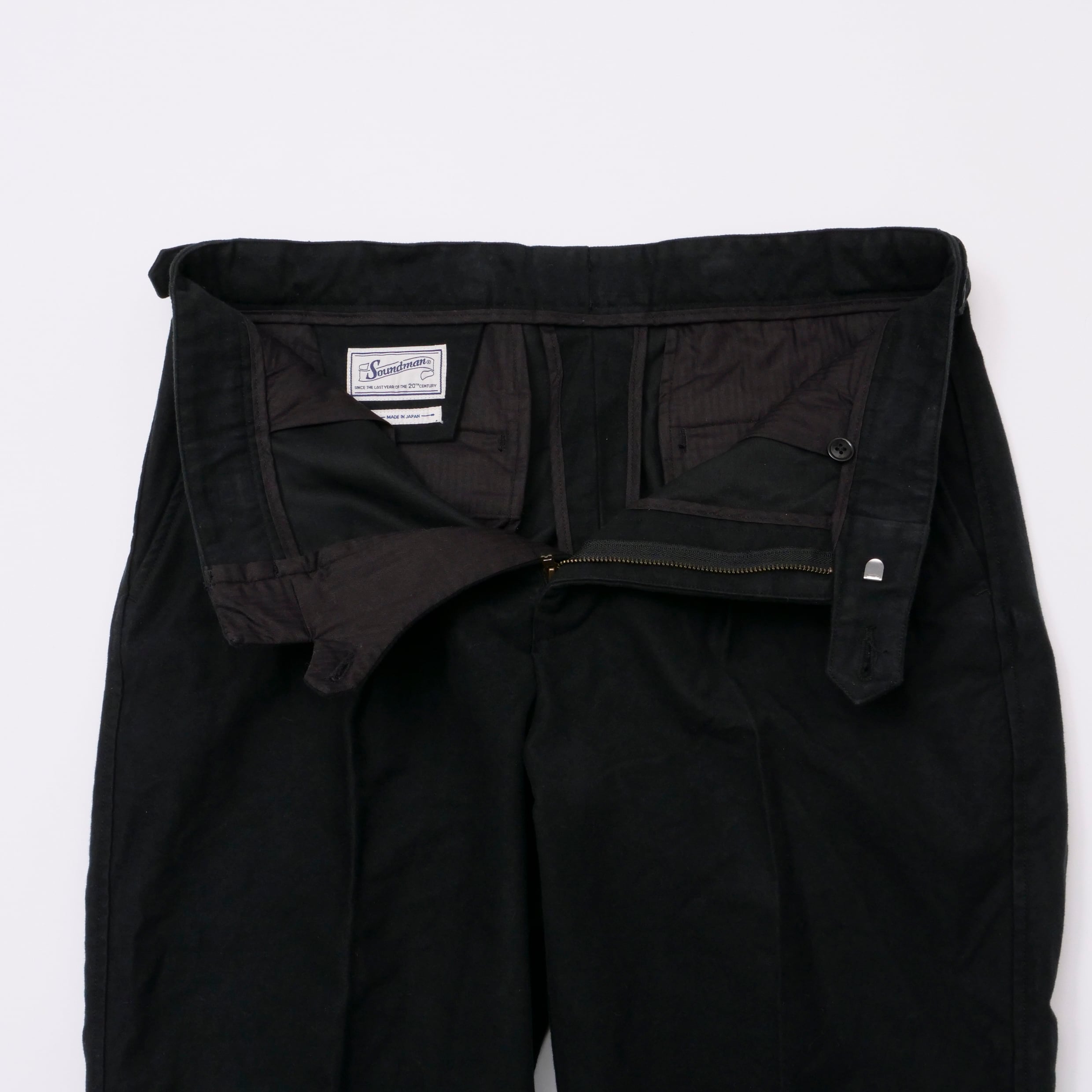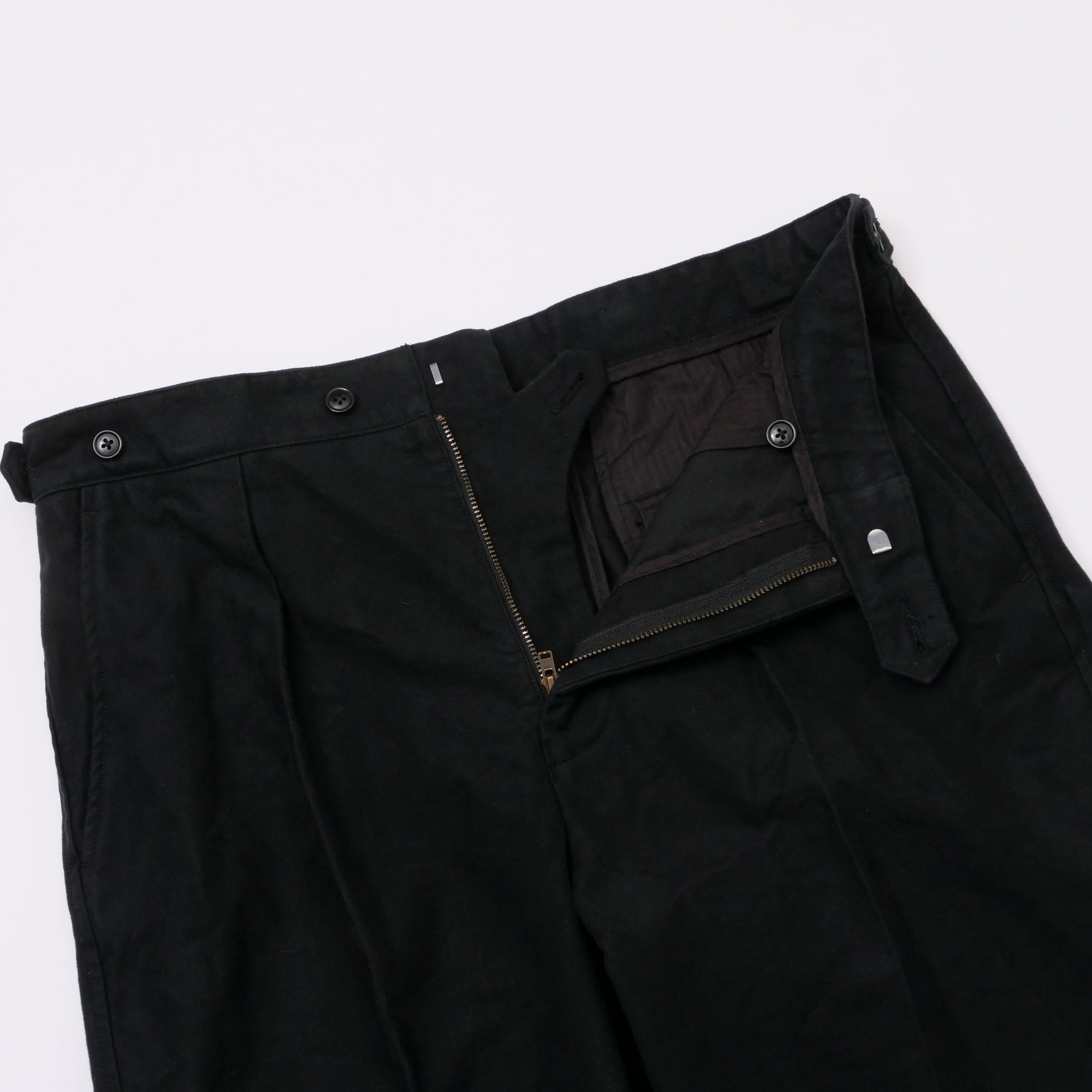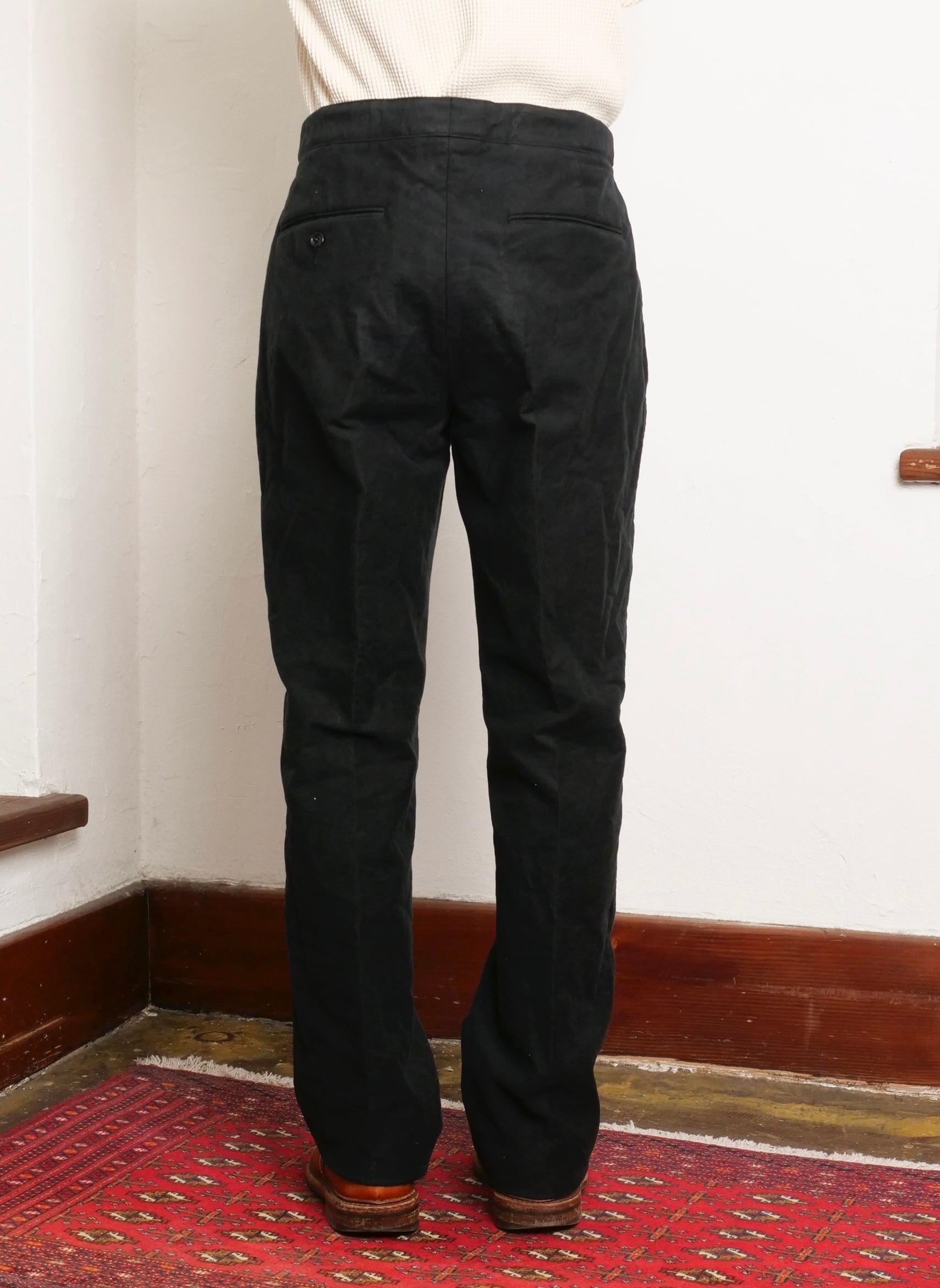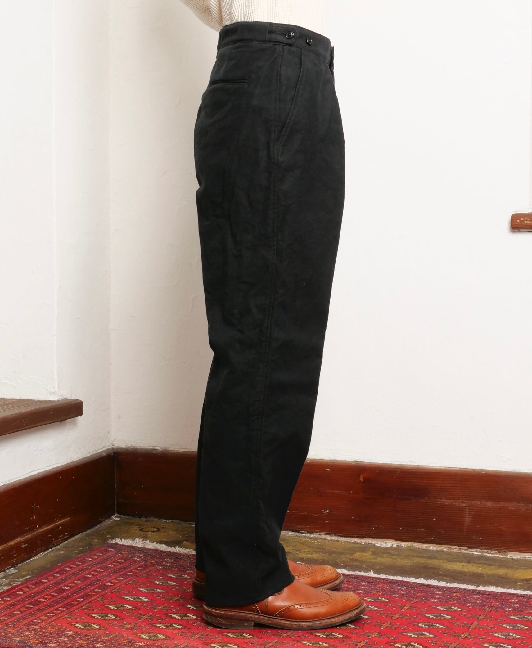 伝統的なイギリスの乗馬用のゴム入りアジャストベルトのディティールを取り入れたクラシックなベルトレストラウザース。フロントはワンプリーツ、定番トラウザースのClarkeと同じ膝から下はややきつめのテーパードが入るシルエット。