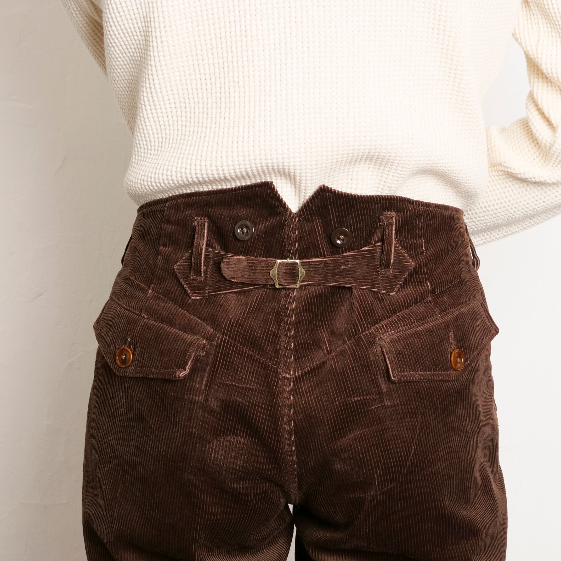後股上を深くとりシンチバックベルトの上にベルトループが叩かれ、サスペンダーでもベルトでも着用できる仕様とした。