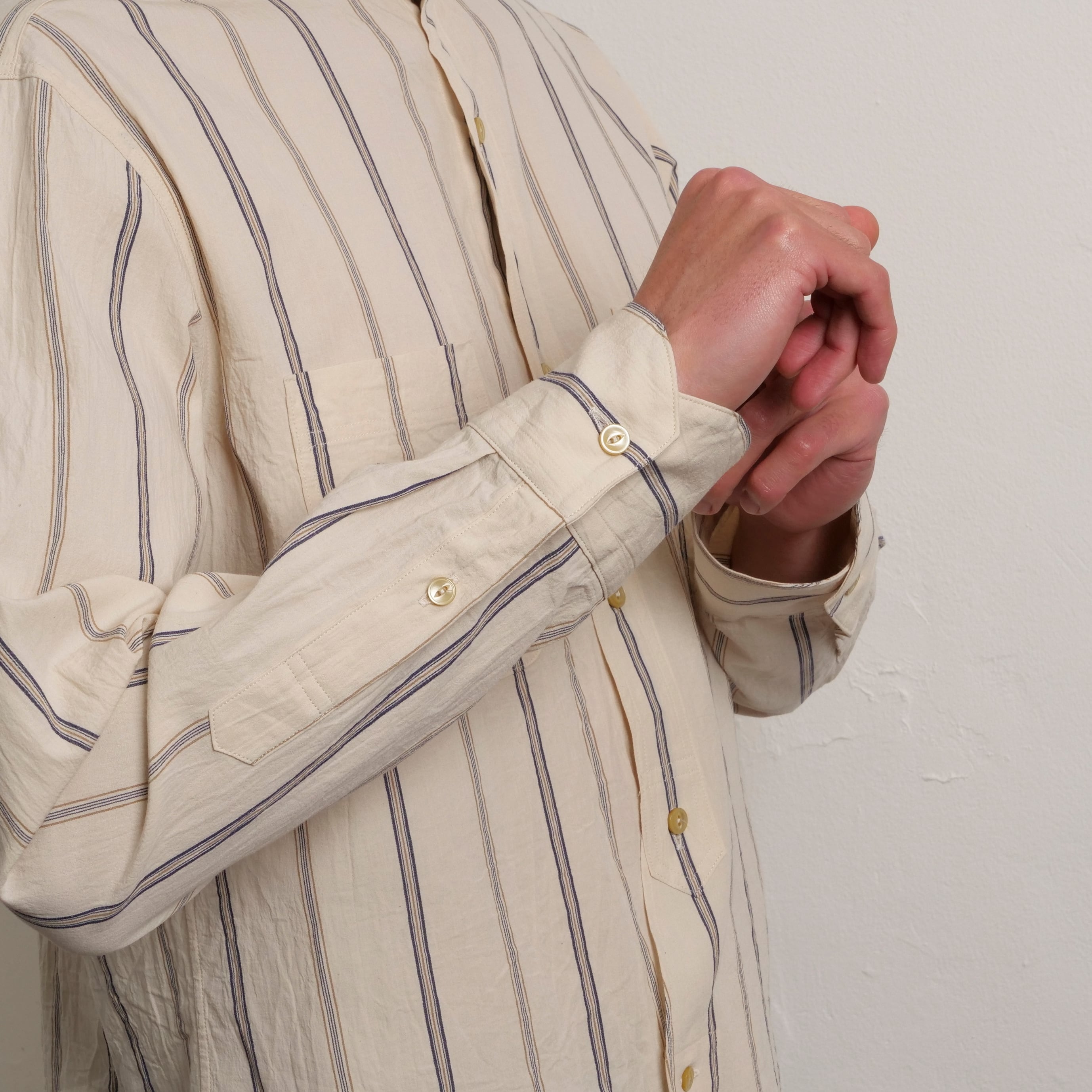 素材は小さな洗い機で丁寧にもみ洗うことでシワ感凹凸を出したクラシックな配色のオーガニックコットンストライプ。猫目ボタンを使用。