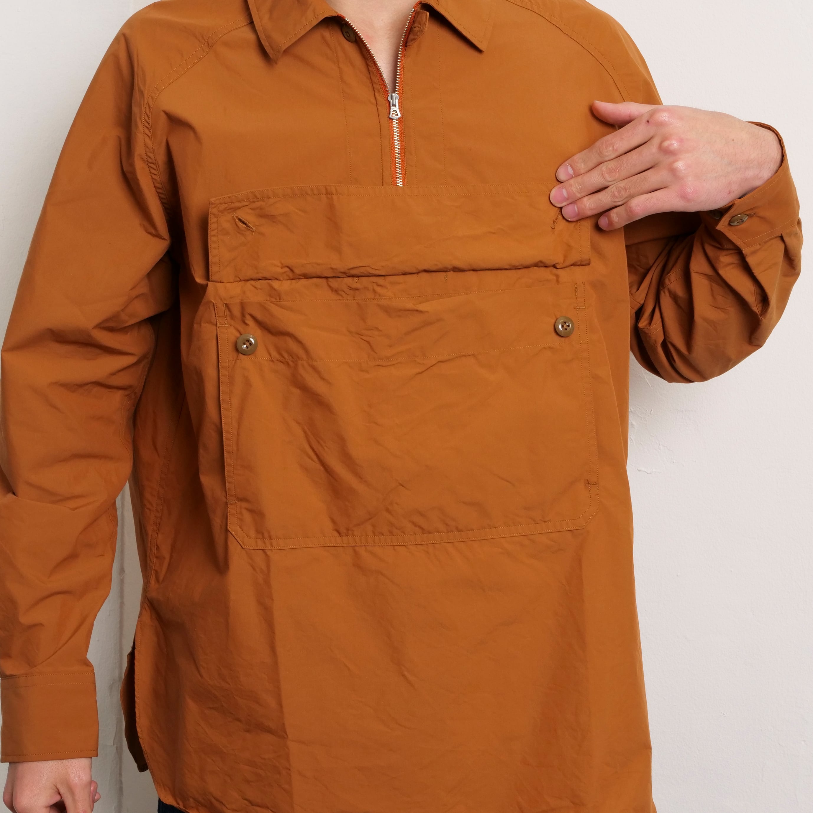 ジップアップカラーというディティールを組み合わせたアノラックシャツ。