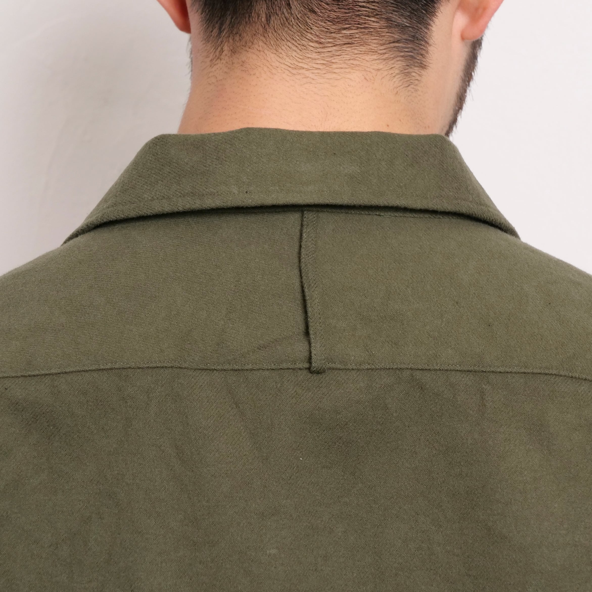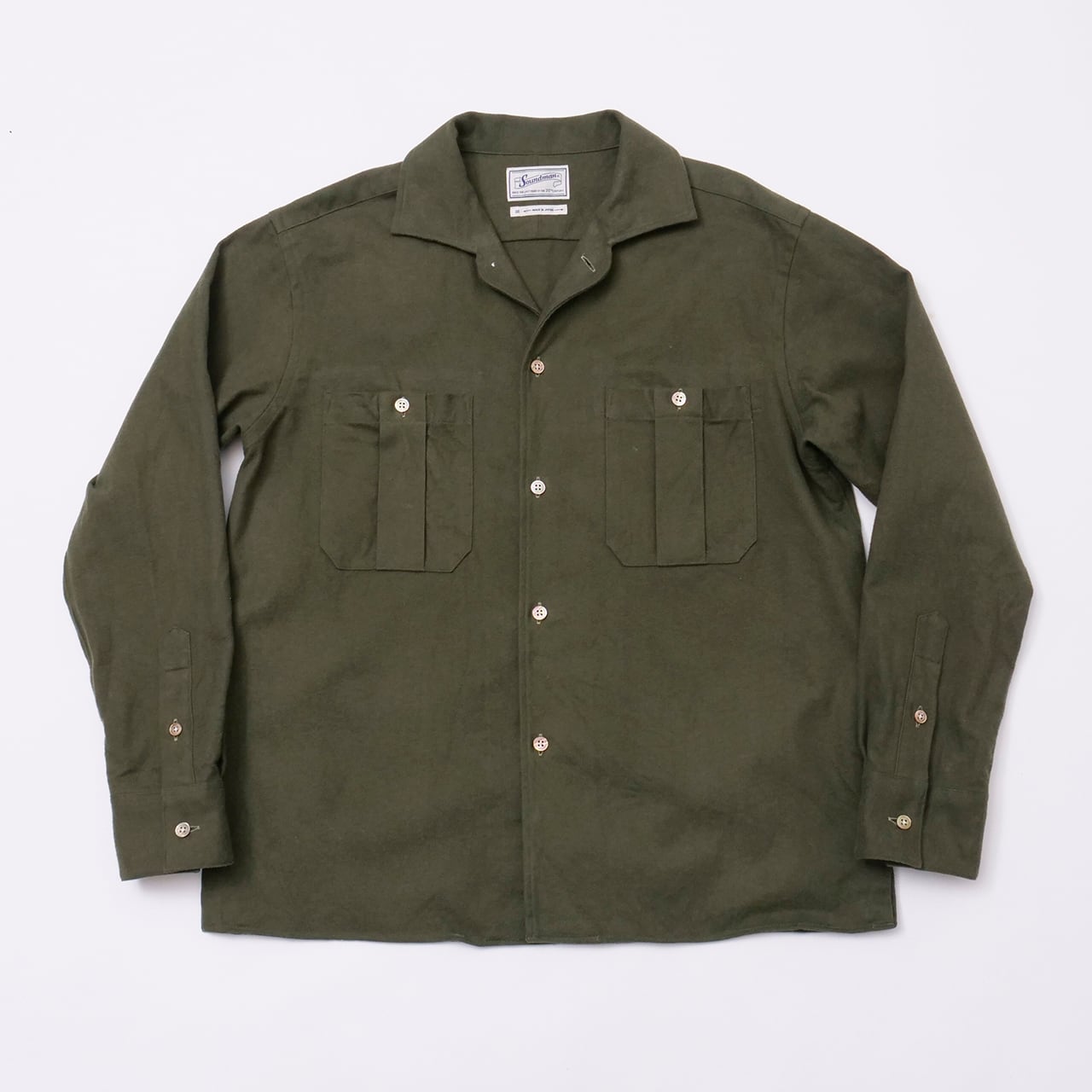 イギリスをはじめとするヨーロッパのレジャーシャツに見られるシャークカラーとボックスプリーツのサファリポケットを合わせた一枚。