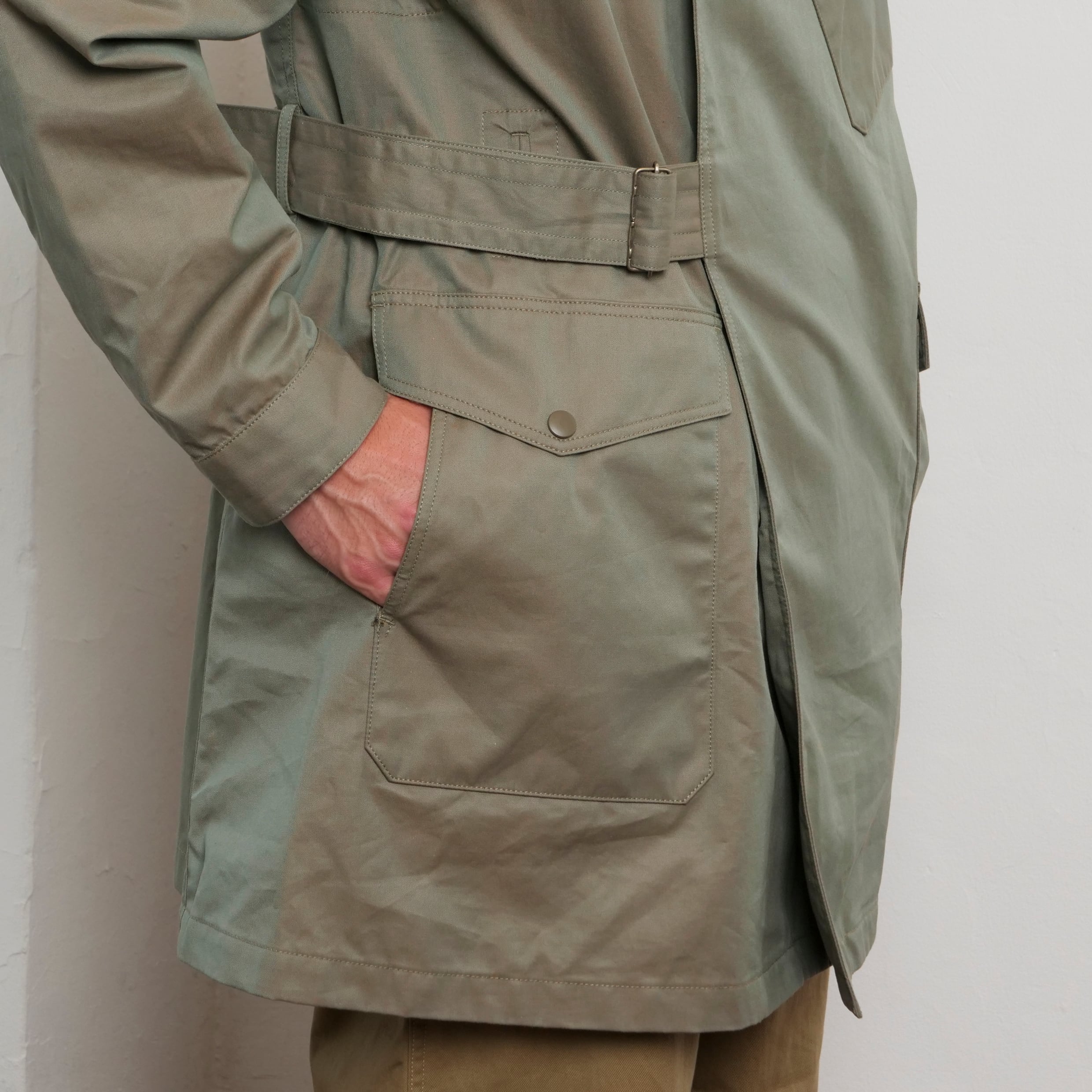 胸の大きなマップポケットはオリジナルサンプルから踏襲、腰ポケットはハンドウォーマー付きのパッチポケットが付く。素材はコットンのコート生地の代表ともいえるタマムシのコットンギャバジン。経糸にグリーン、緯糸にオレンジのコンパクトコットンを使用。