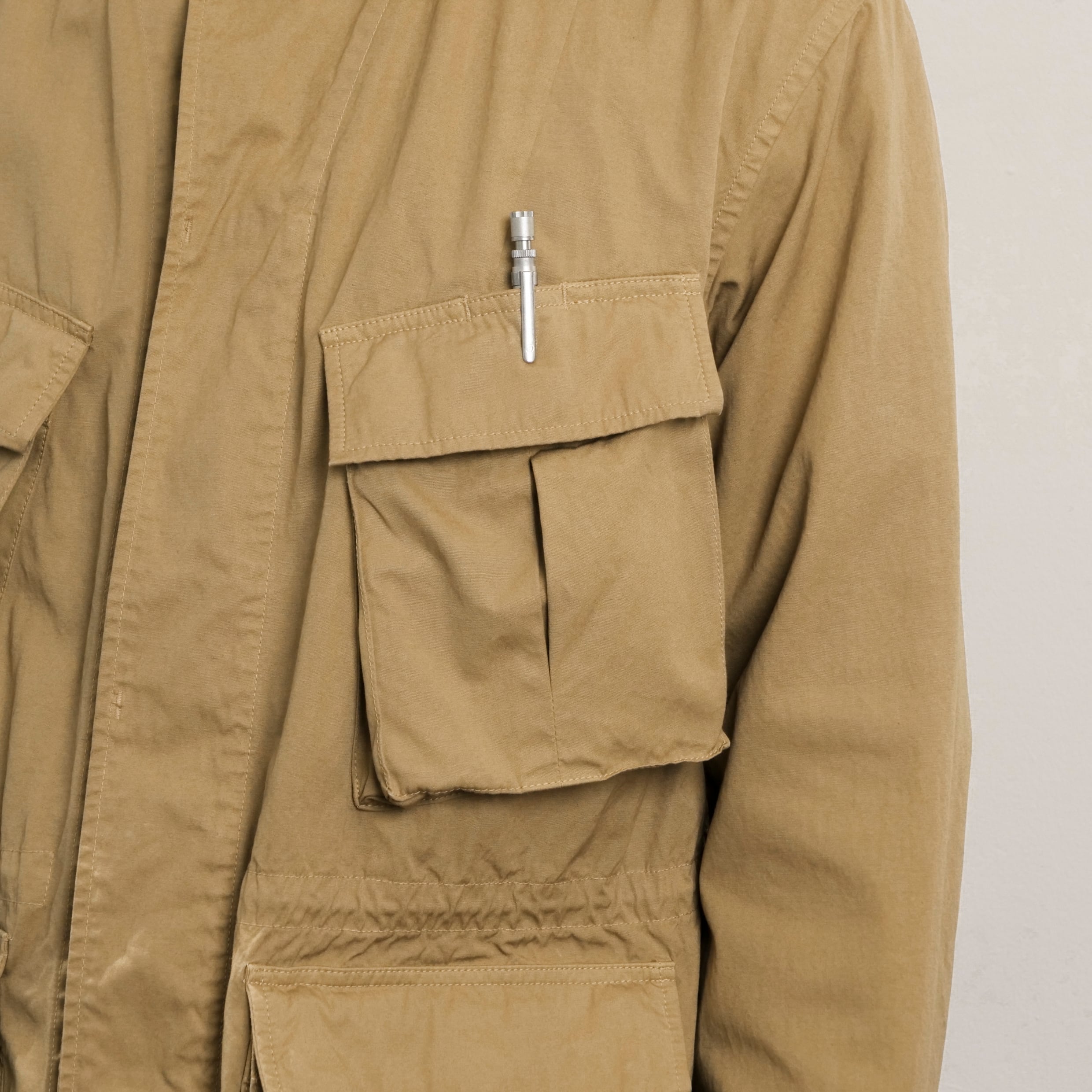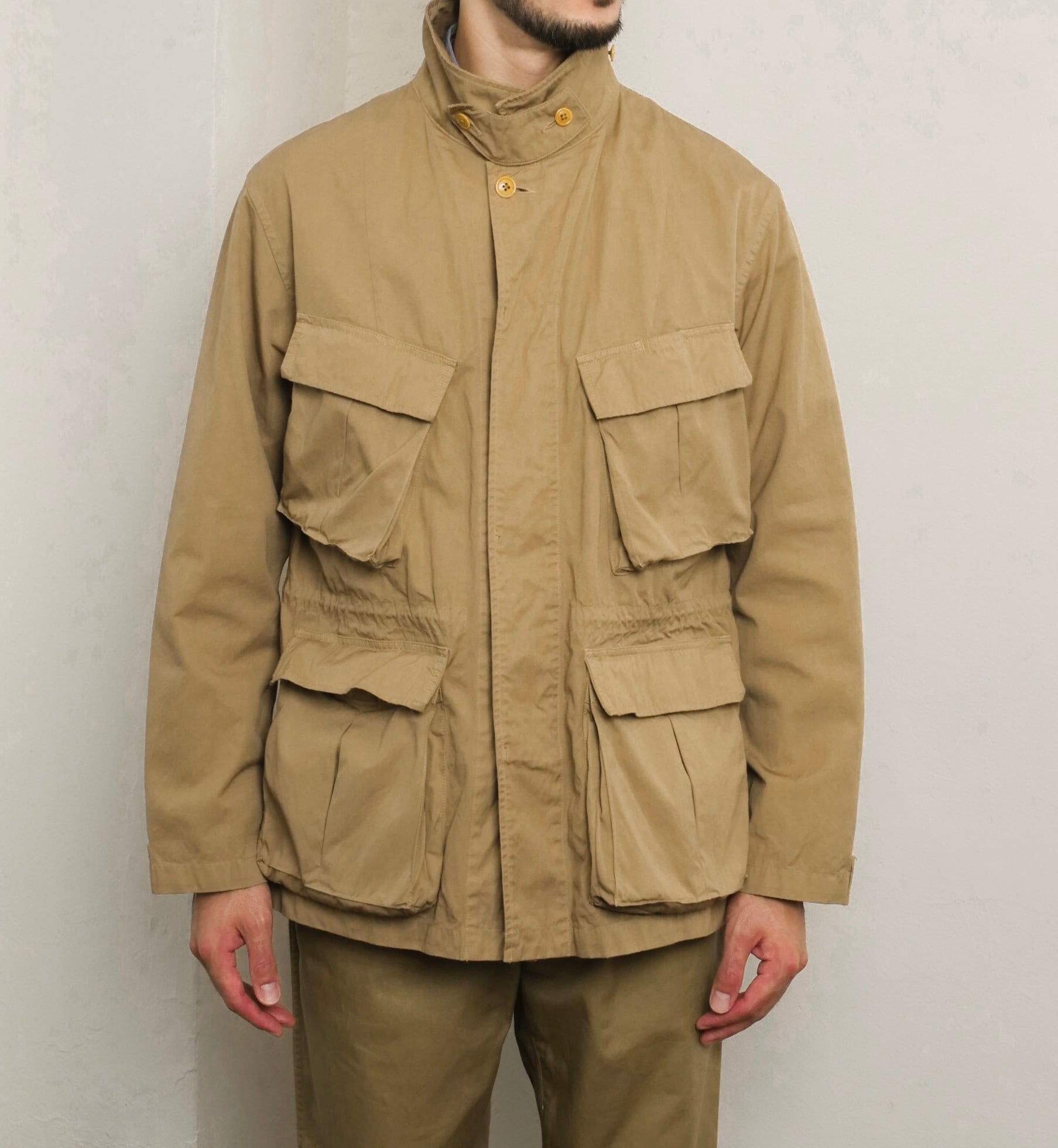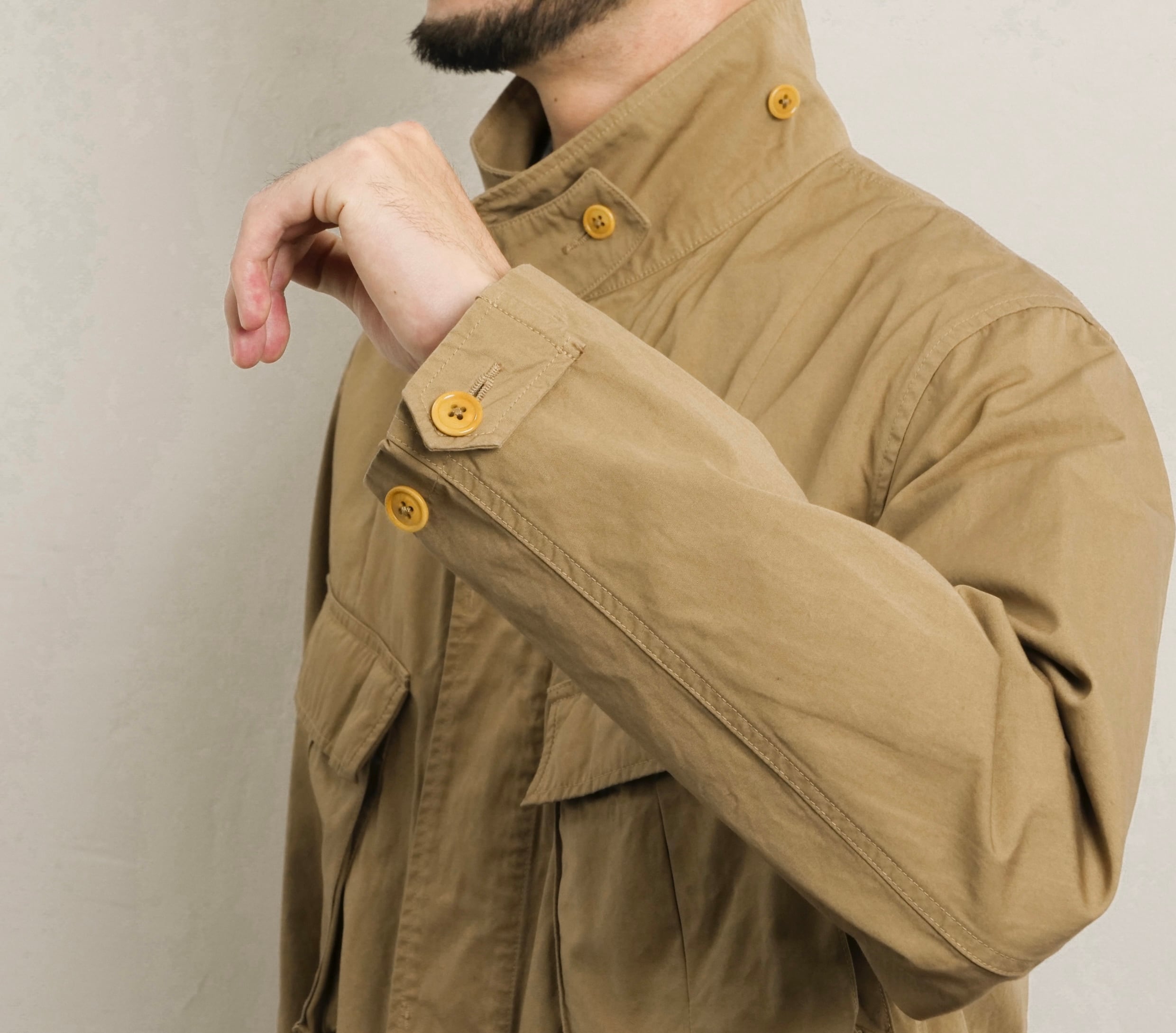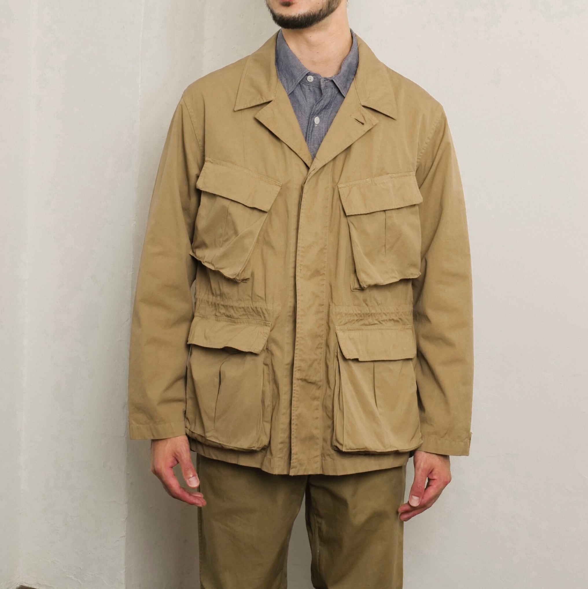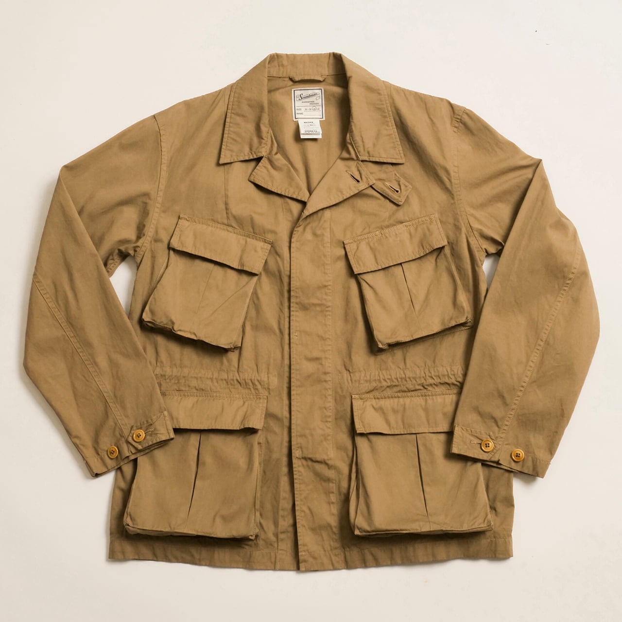 USARMY のジャングルファティーグJK からBDU ジャケットに移行する間につくられたと推測される ポケット形状がスクエアとなったテストサンプルをデザインソースとした定番ジャケット。四つのポケットとディティールはそのままに腰ポケットにはハンドウォーマー機能をプラス。ウエスト裏側にドローコードを通し絞れる形とした。