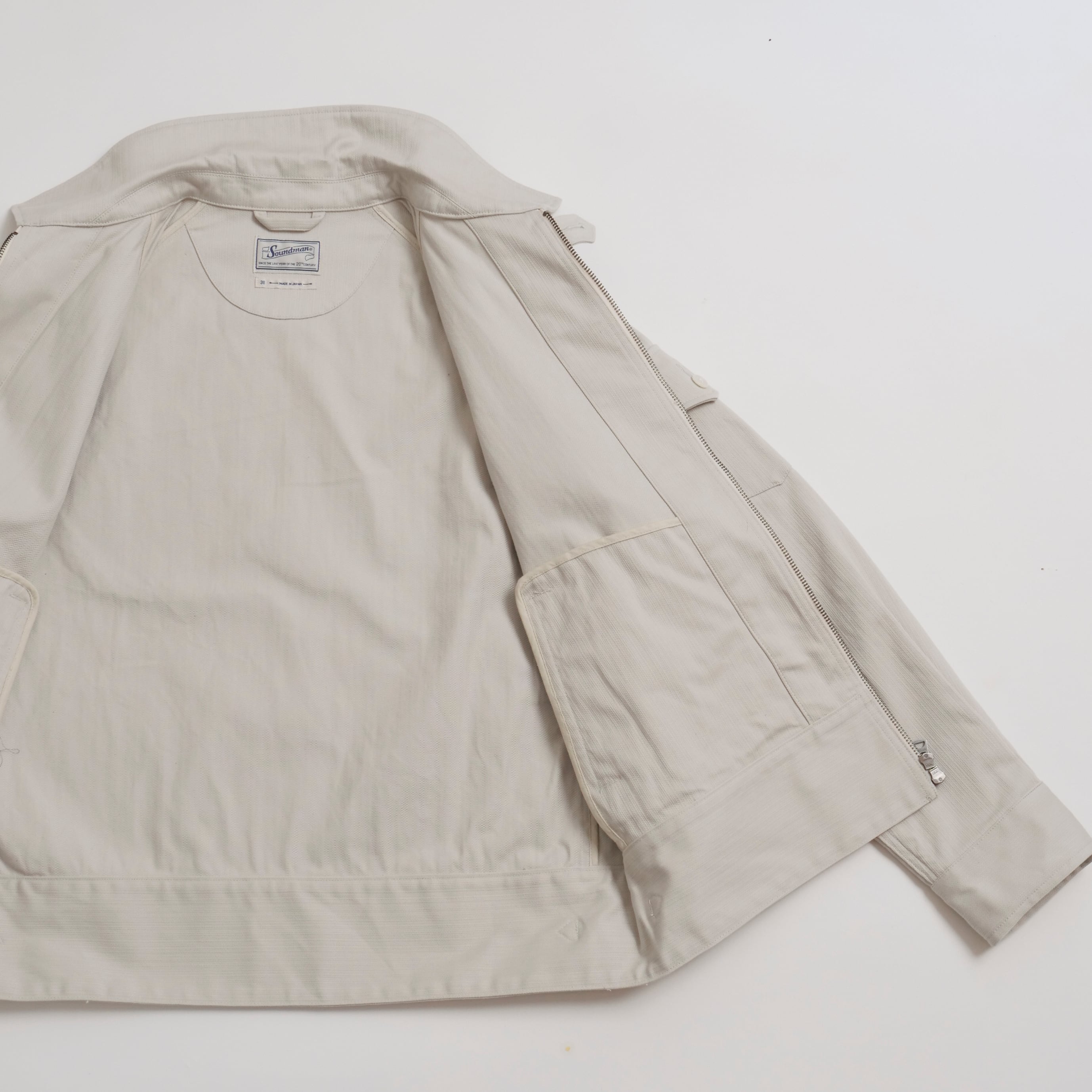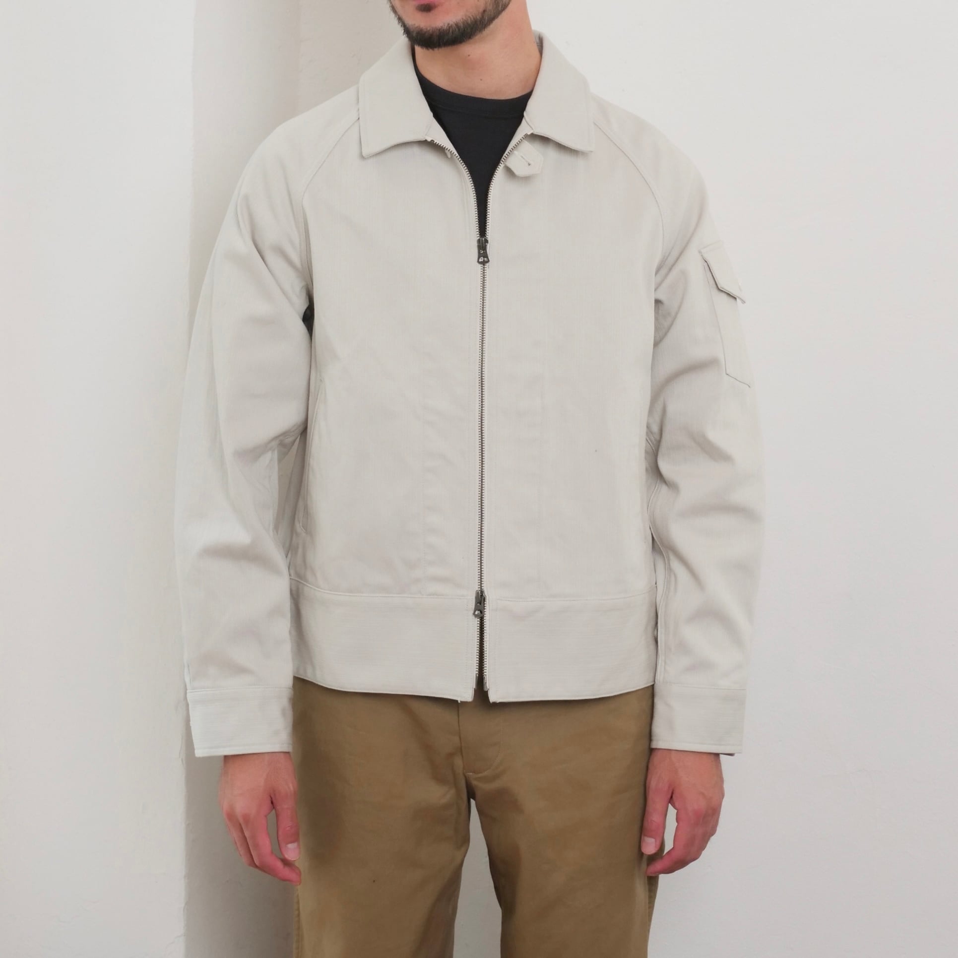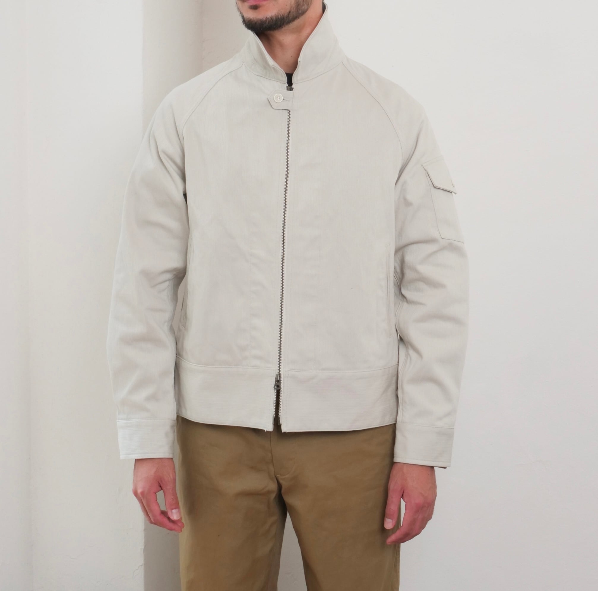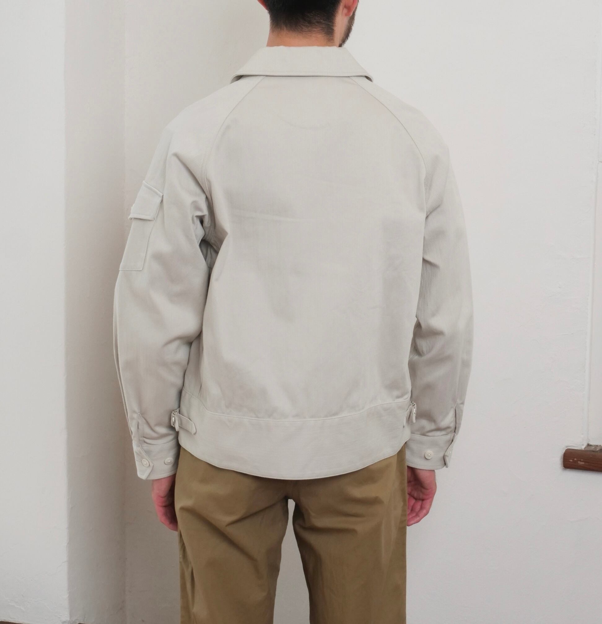 ショート丈ブルゾンをイメージ。レギュラーとラグランスリーブを組み合わせ、左袖にはシガレットポケットを叩きつけた。シンプル極まりないディティールだが、襟下のファスナー口に叩いたタブや腰ポケットの玉淵にたこ糸を入れるなど細かいディティールを取り入れた。