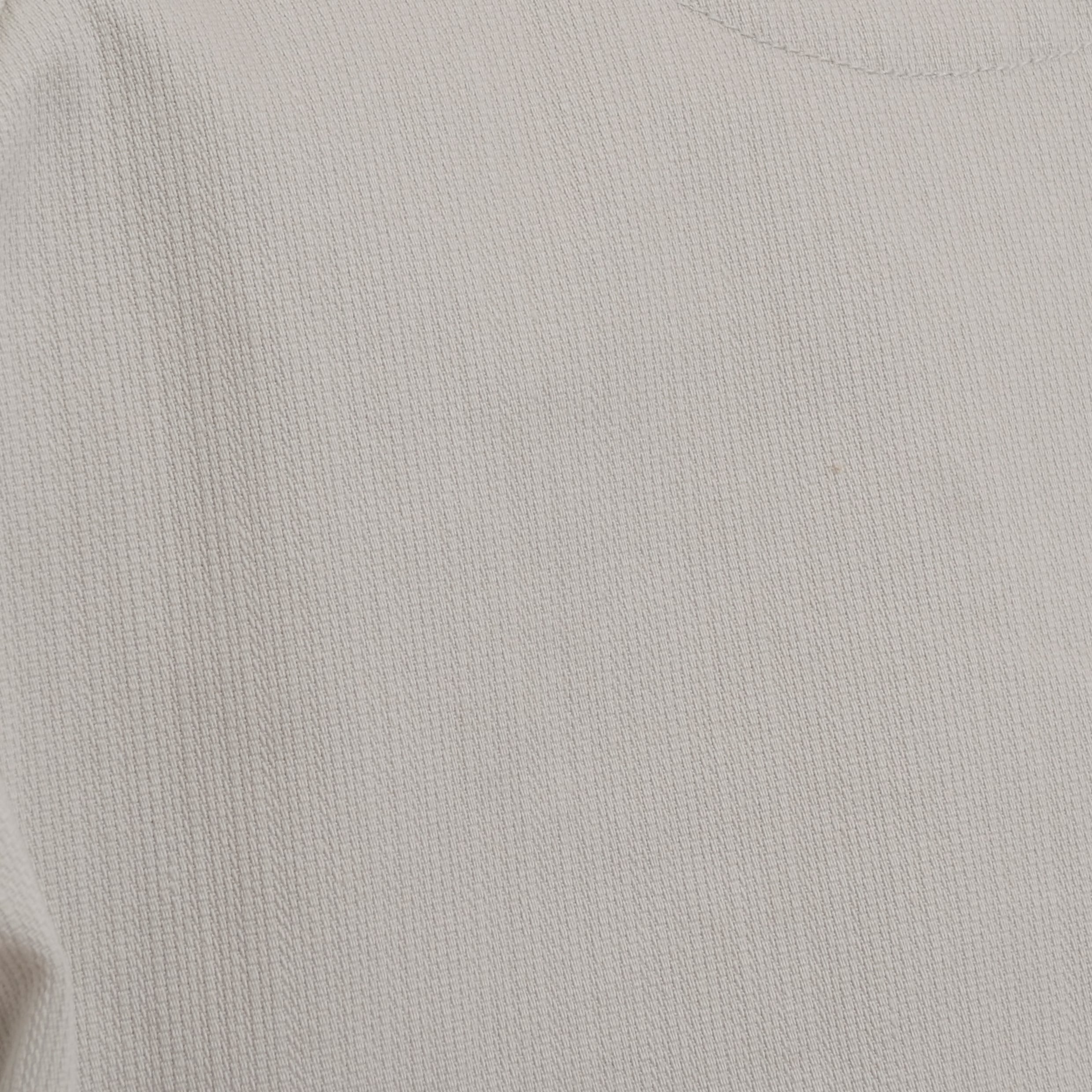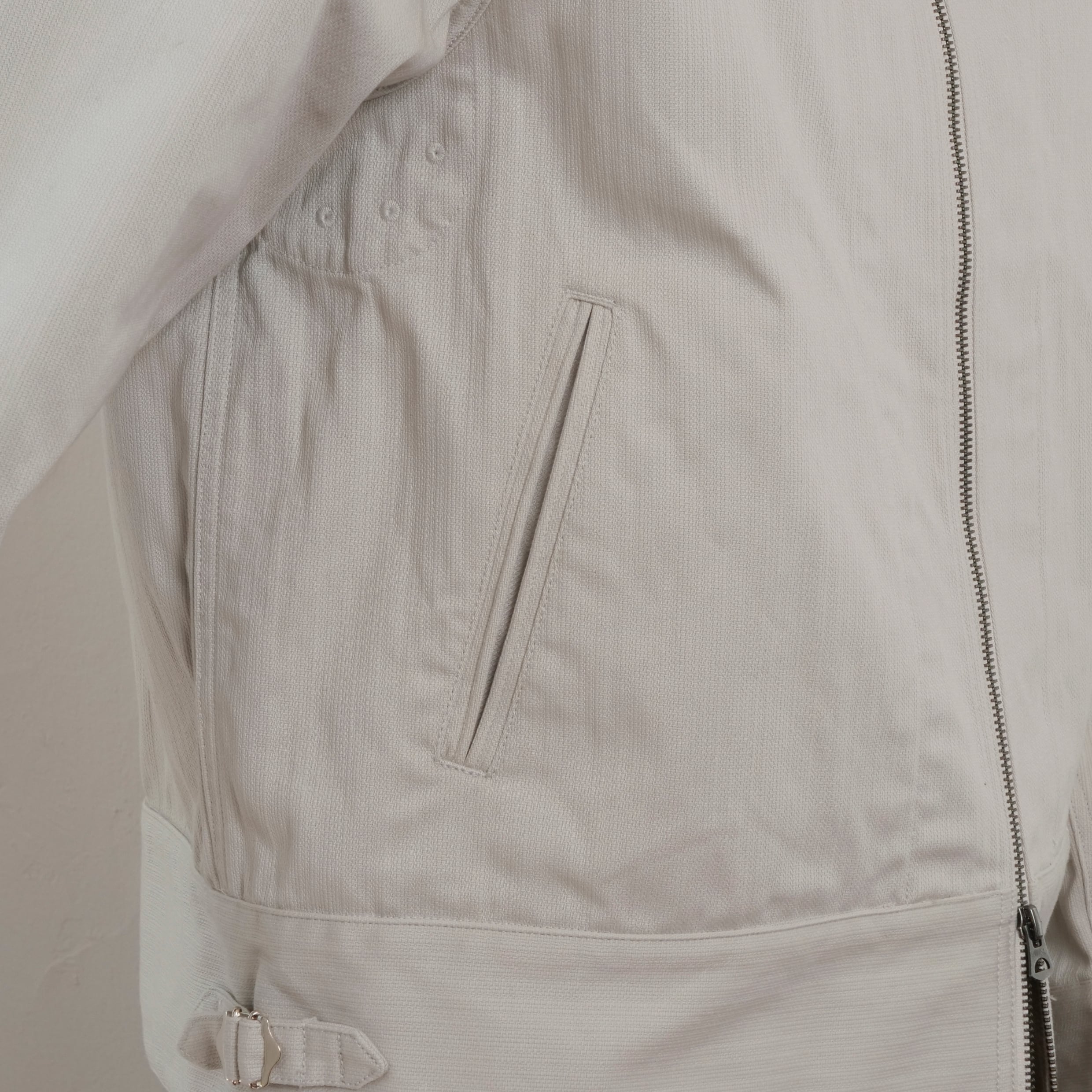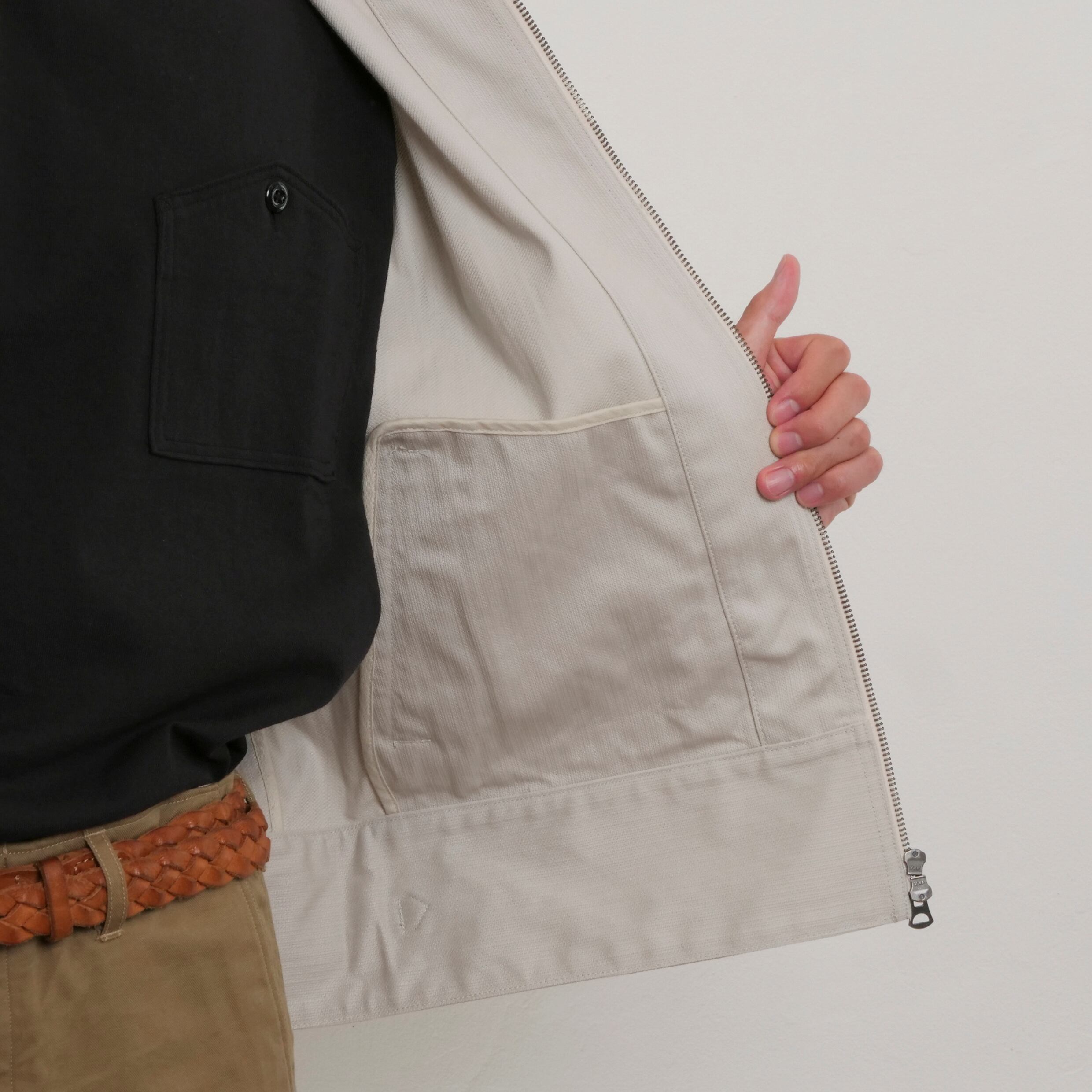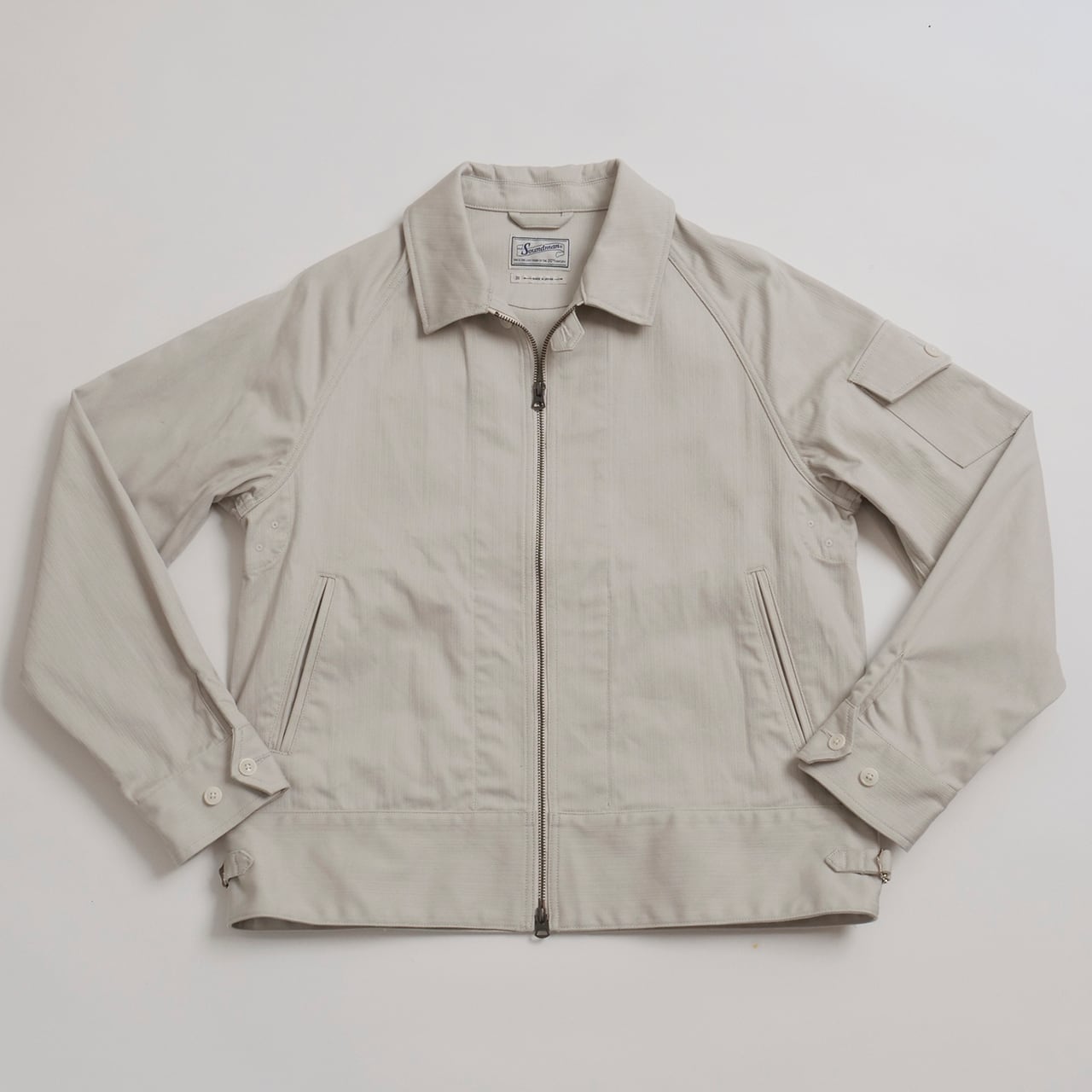 ショート丈ブルゾンをイメージ。レギュラーとラグランスリーブを組み合わせ、左袖にはシガレットポケットを叩きつけた。シンプル極まりないディティールだが、襟下のファスナー口に叩いたタブや腰ポケットの玉淵にたこ糸を入れるなど細かいディティールを取り入れた。