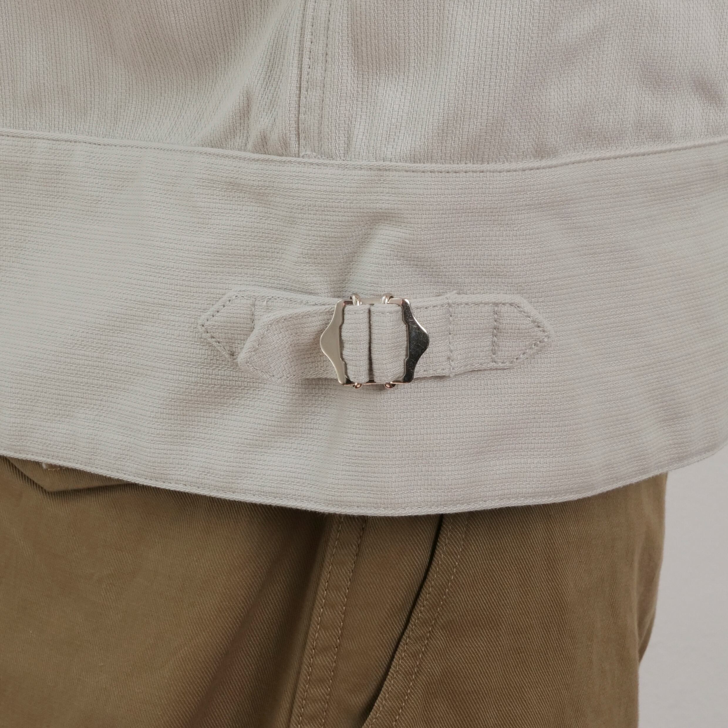 シルエットはストレートだが腰ベルト尾錠にて裾のアジャスト、フロントのダブルファスナー調整できる仕様。素材は畝が均一ではないランダムピケ。硫化染料使用のため経年変化も楽しみな一着。