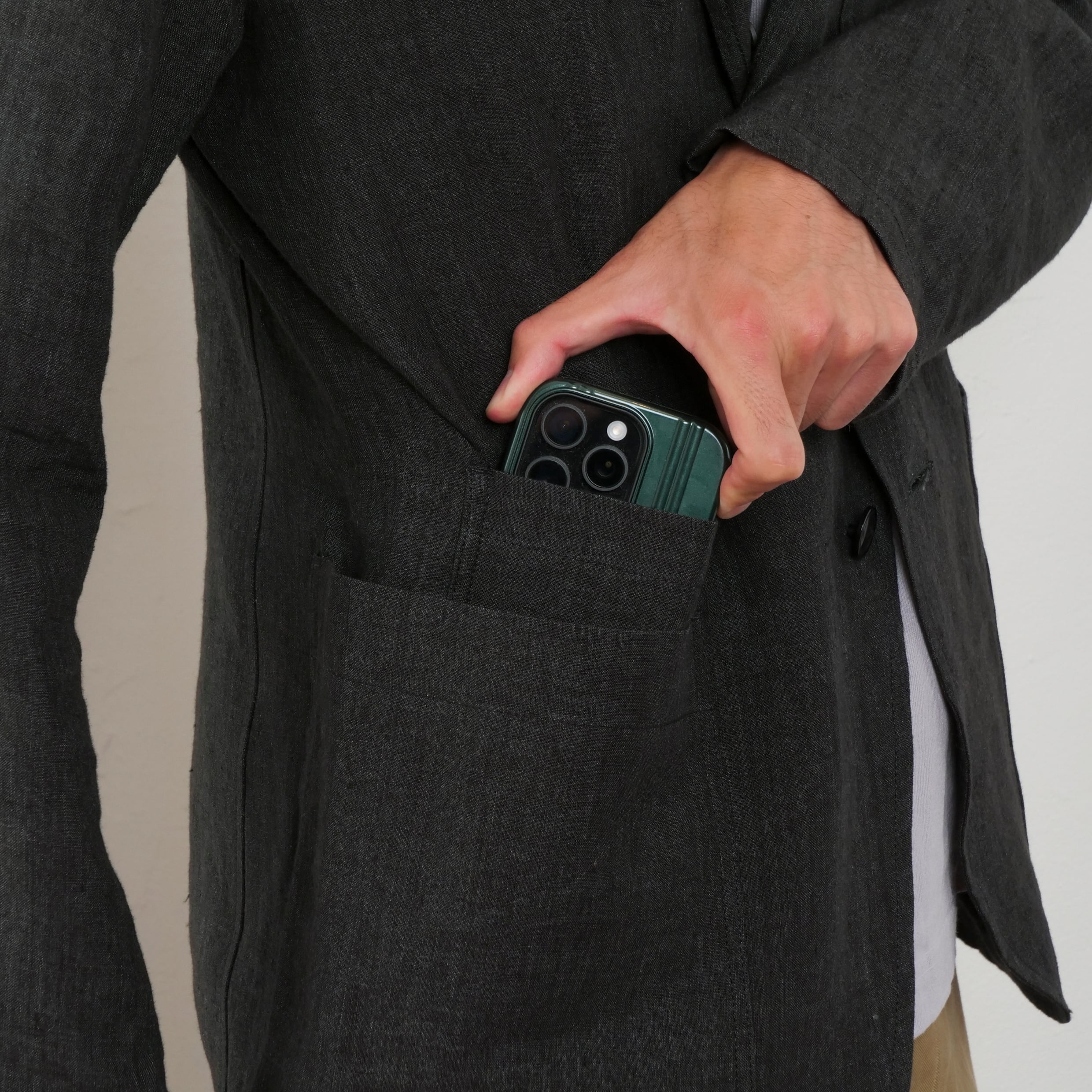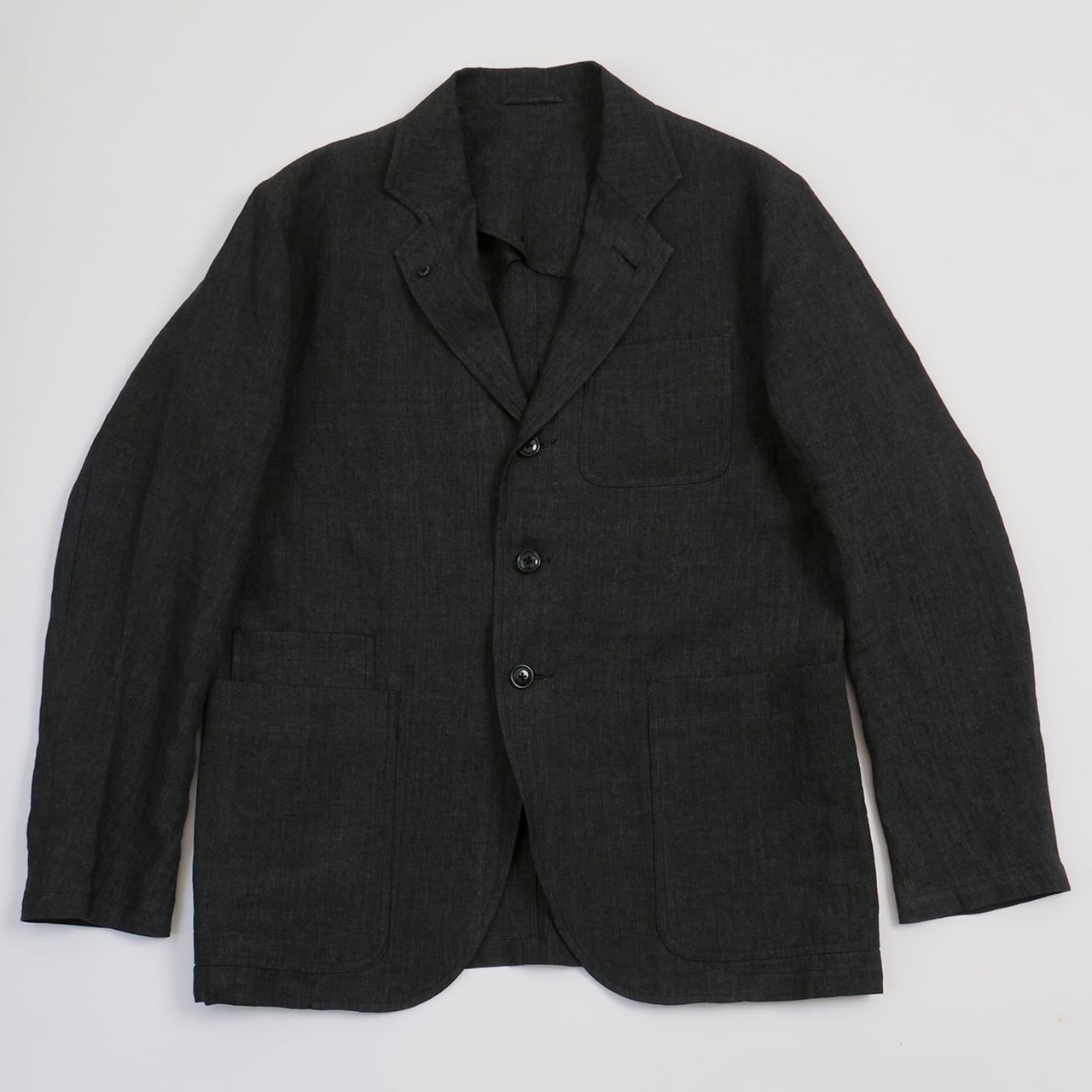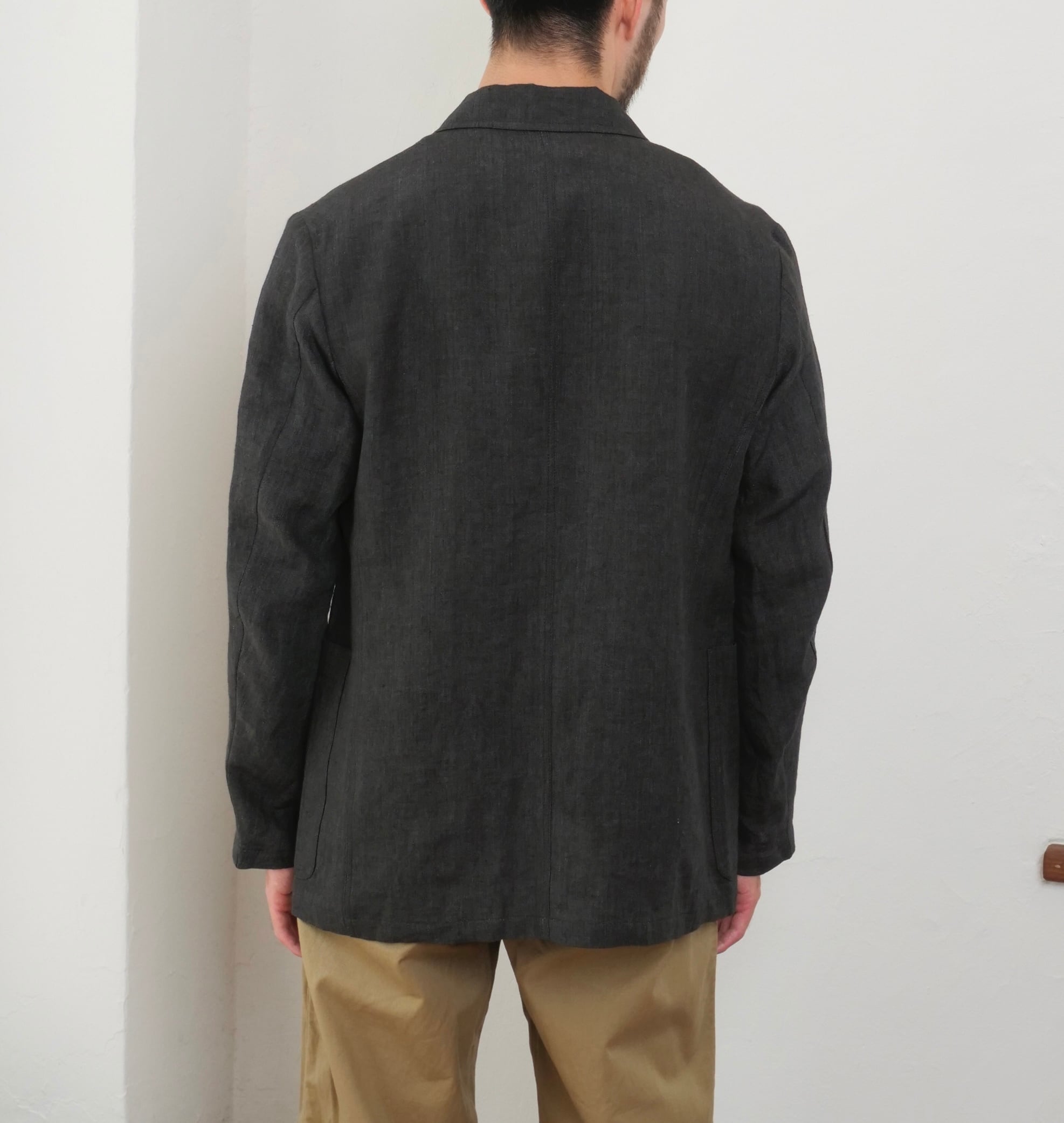 1930sのイギリスのサックコートがイメージソース。3パッチポケット3つボタン、ノーベントのシンプルなディティールに右腰にスマートフォンが収まるチェンジポケットをつけ現代の街着 としての要素をプラスした。内側は大身返し・觀音裏地というクラシックかつ軽く羽織れる仕様。ブラックインディゴにて内側まで染まらない中白染めという手法で染めたリネンキャンバスを使用。経年変化も楽しみな1着。