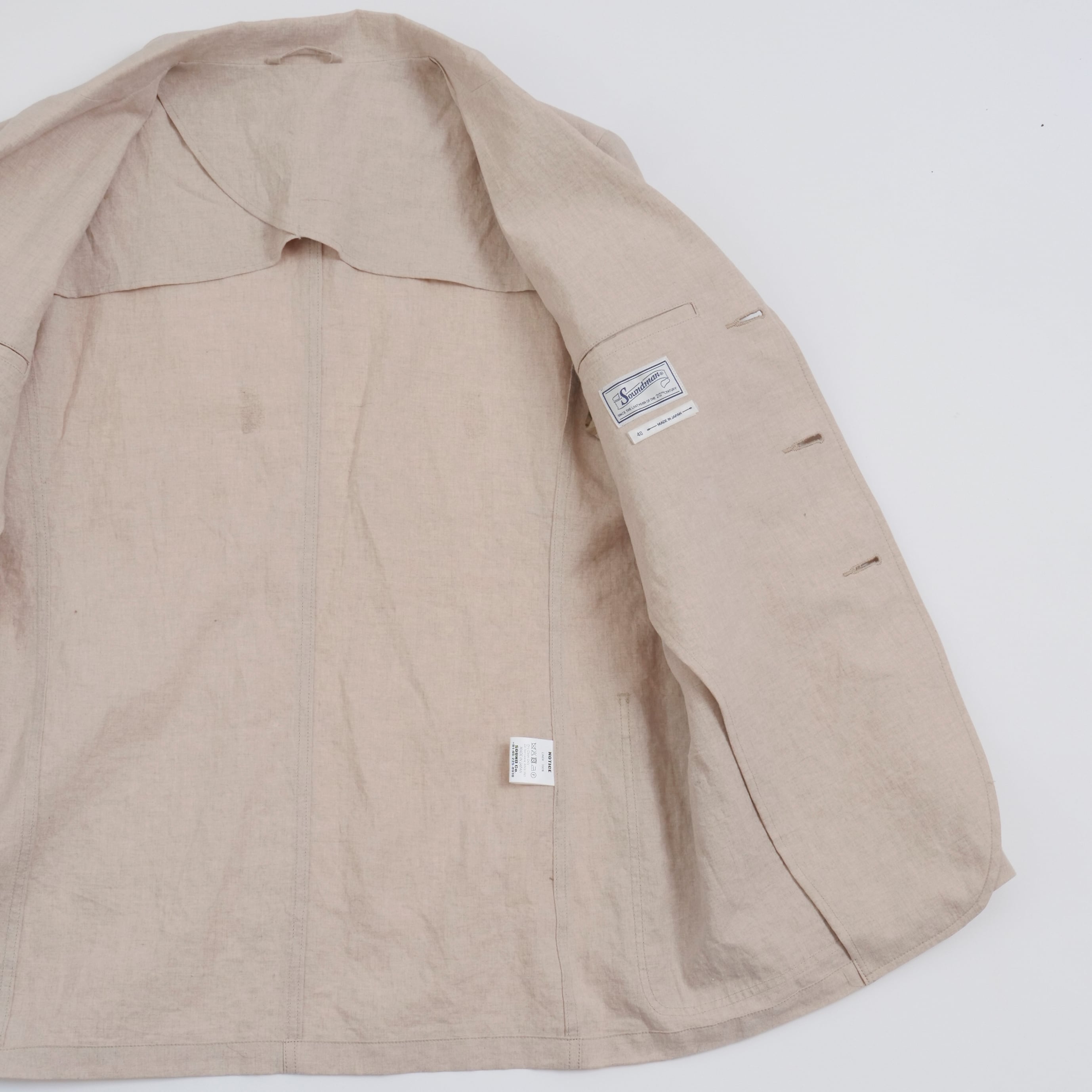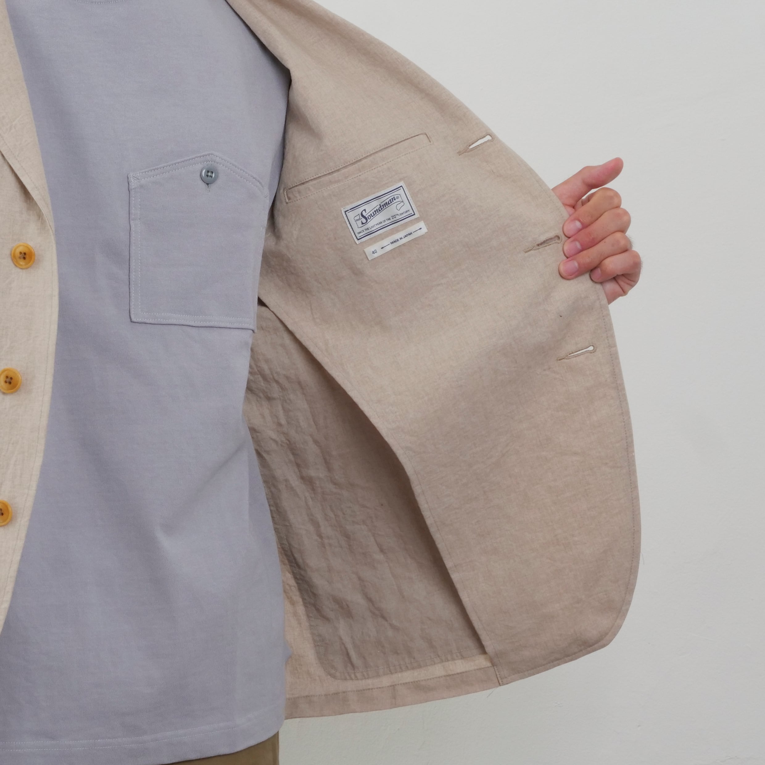 1930sのイギリスのサックコートがイメージソース。3パッチポケット3つボタン、ノーベントのシンプルなディティールに右腰にスマートフォンが収まるチェンジポケットをつけ現代の街着としての要素をプラスした。内側は大身返し・觀音裏地というクラシックかつ軽く羽織れる仕様。素材は塩縮加工を施し固く仕上げたリネンキャンバス。Clarke【クラーク】・294M-605B・ C/#31 Naturalと合わせてセットアップとしての着こなしも可能。