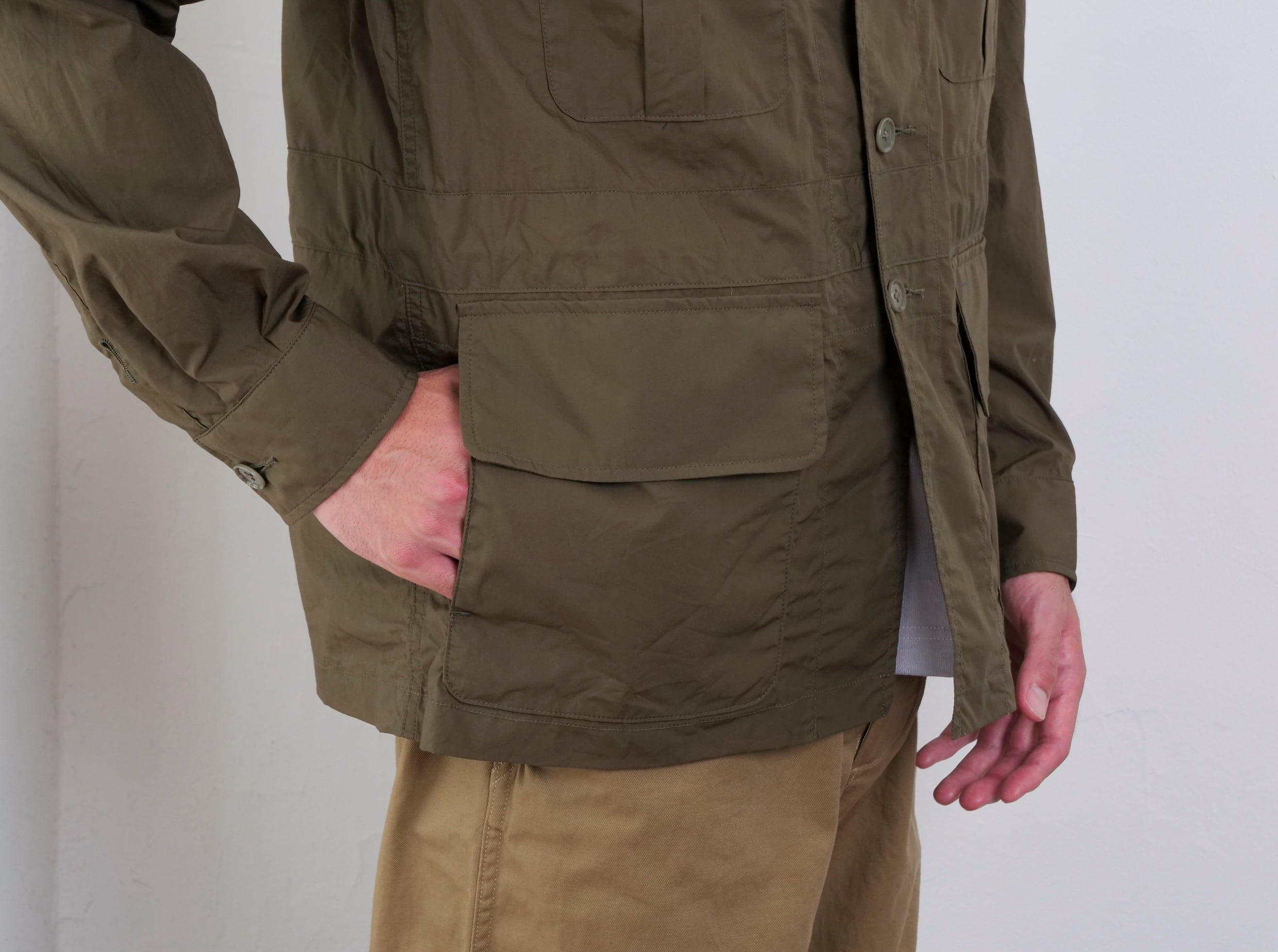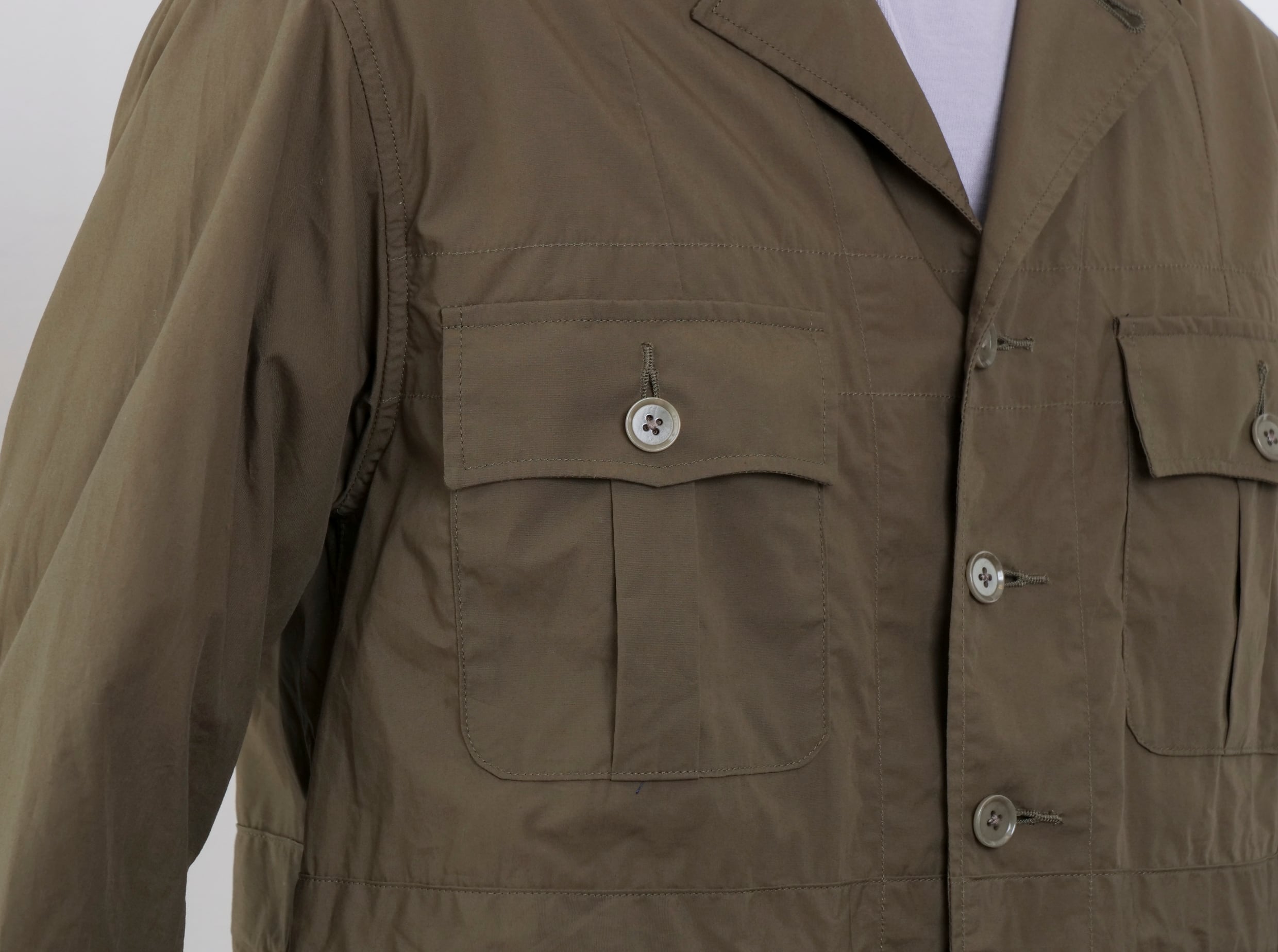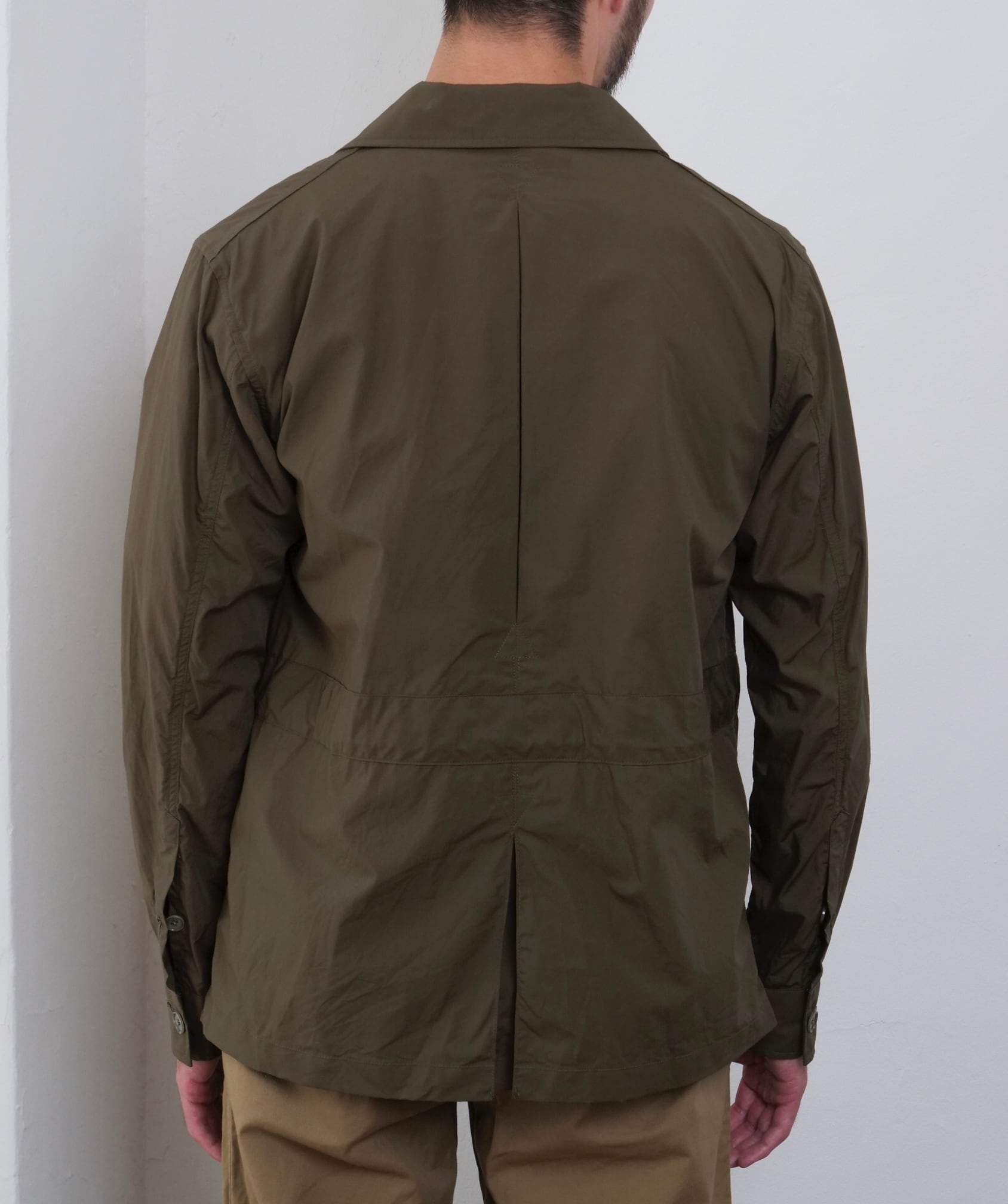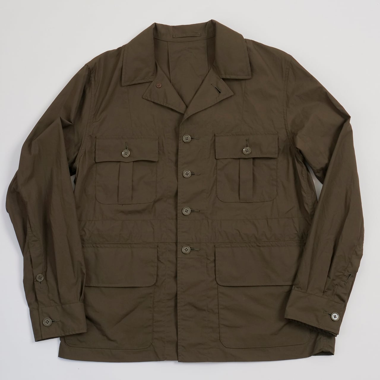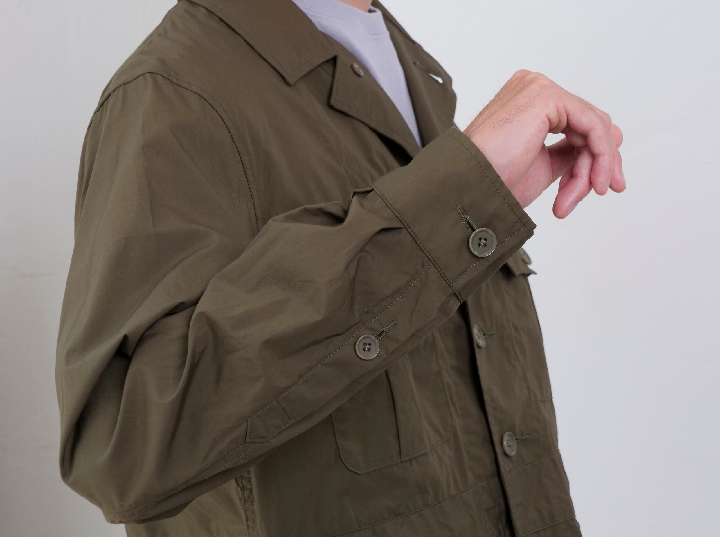 50sブリティッシュアーミーの熱帯地向けのトロピカルブッシュジャケットをデザインソースとした1着。センターボックスプリーツ仕様にリデザイン。また本来表につくベルトは取払い 内側のドローコードでアジャスト。また腰ポケットをハンドウォーマーつきとした。素材は上質なスーピマコットンを 使用した薄手のタイプライタークロスを使用。イギリスワークミリタリーに見られる裏からの補強など多くのステッチが入り、あえてパッカリングが出るような仕様としている。夏の羽織りに最適な1着。