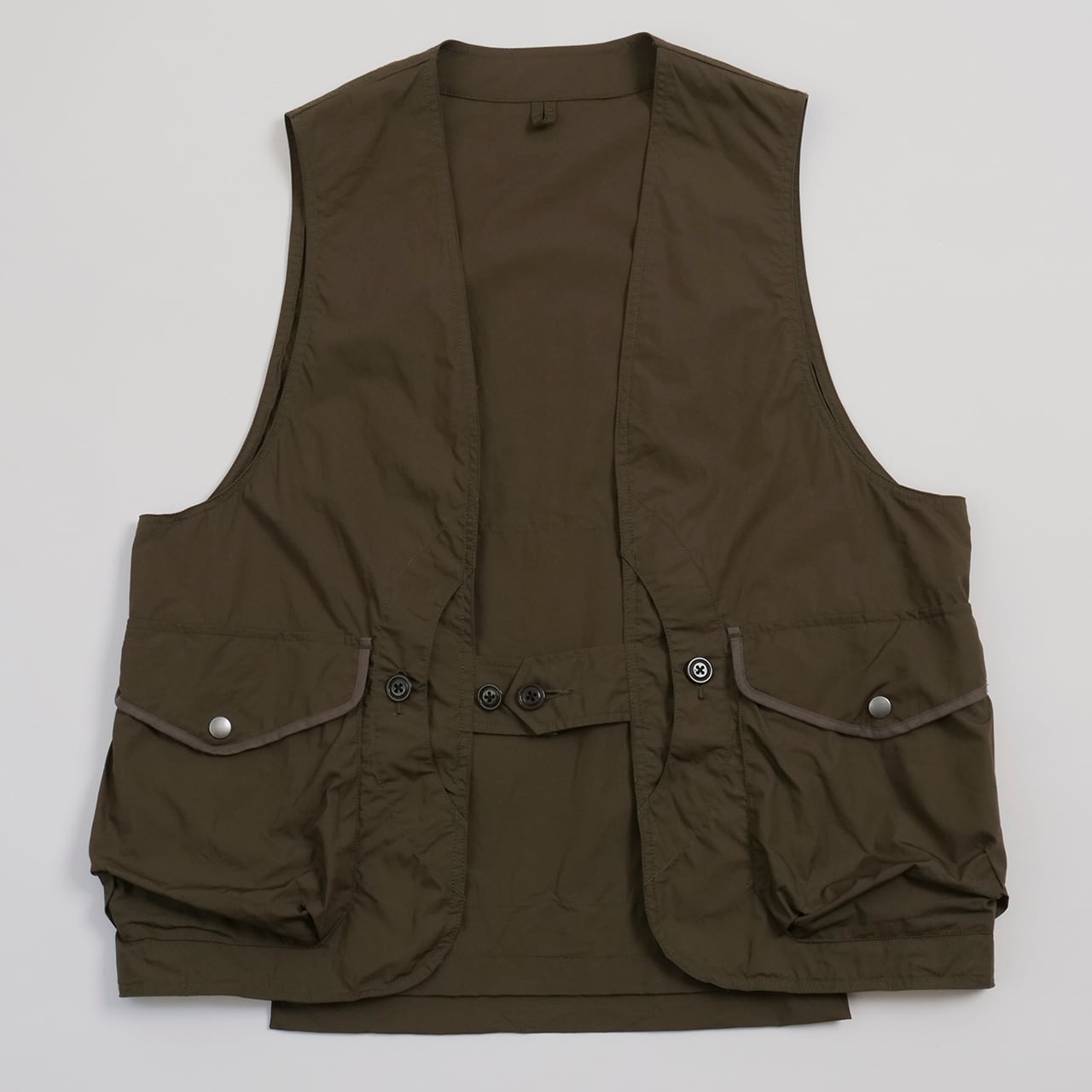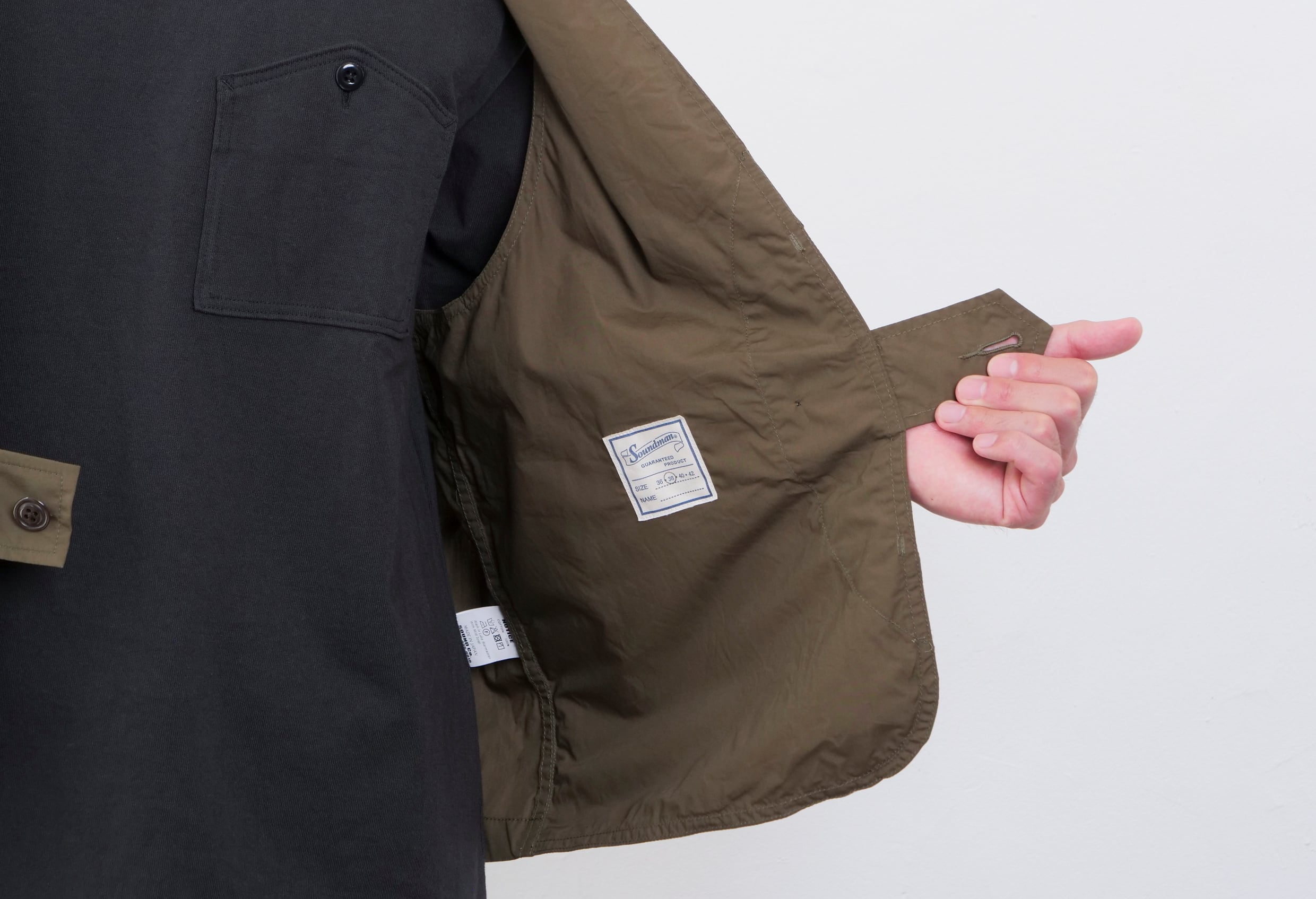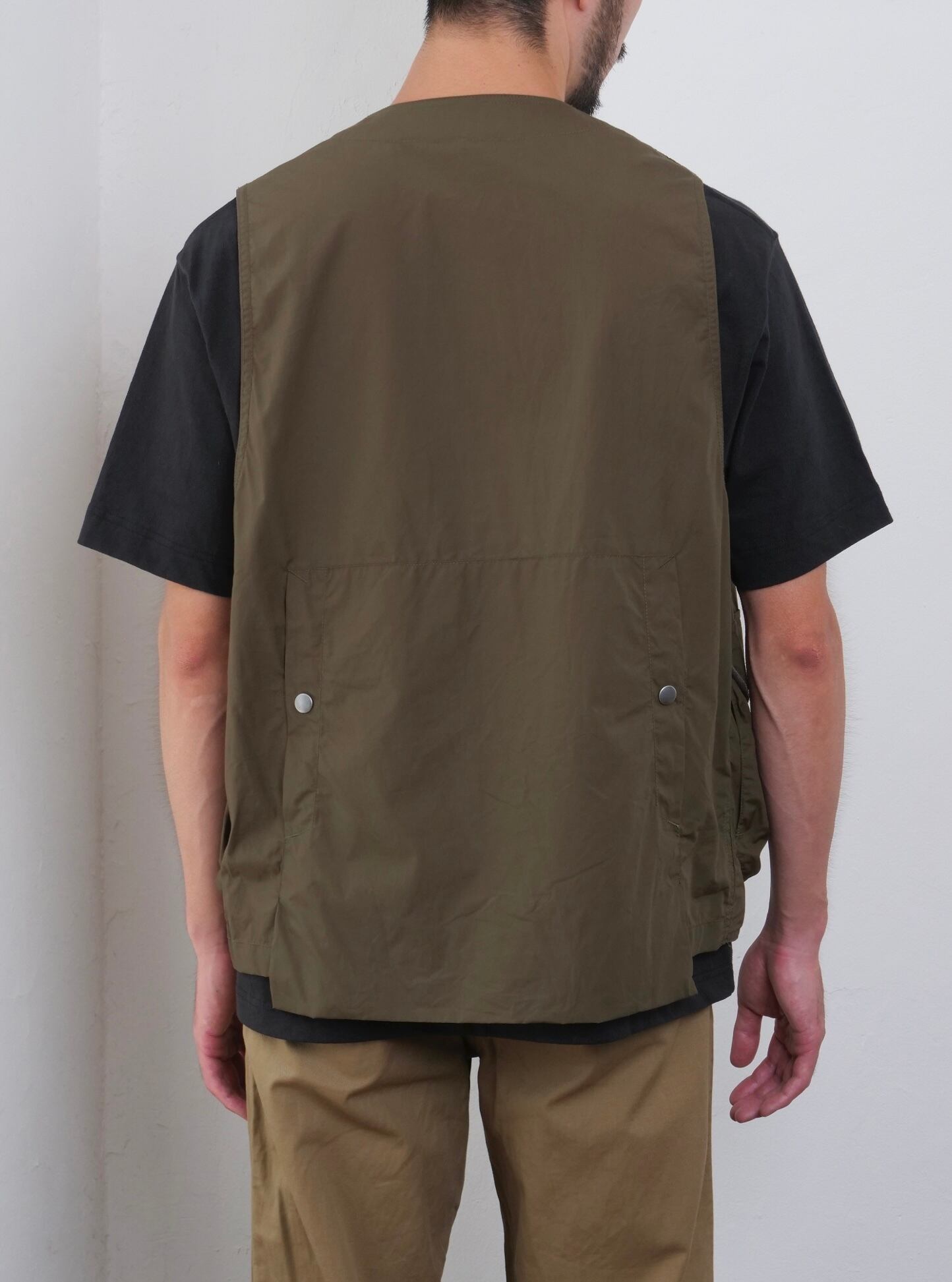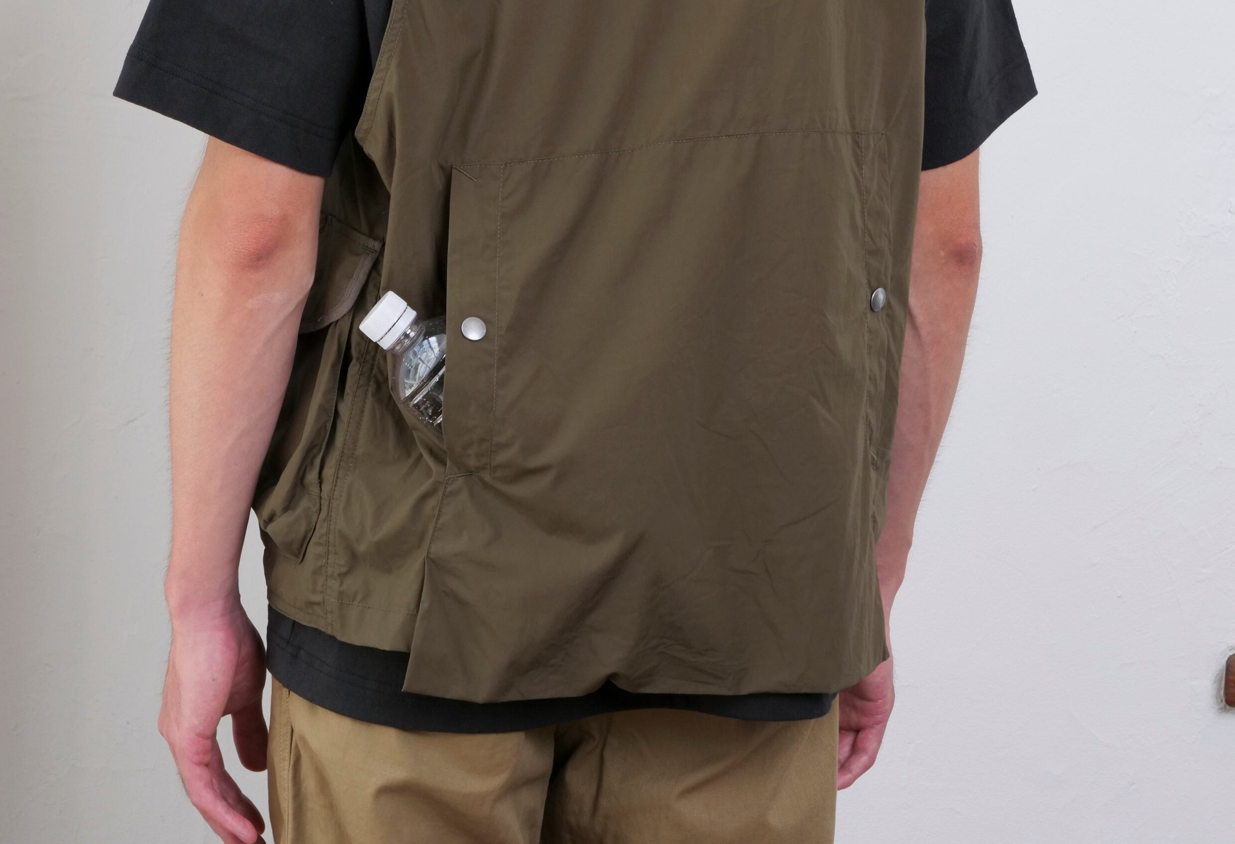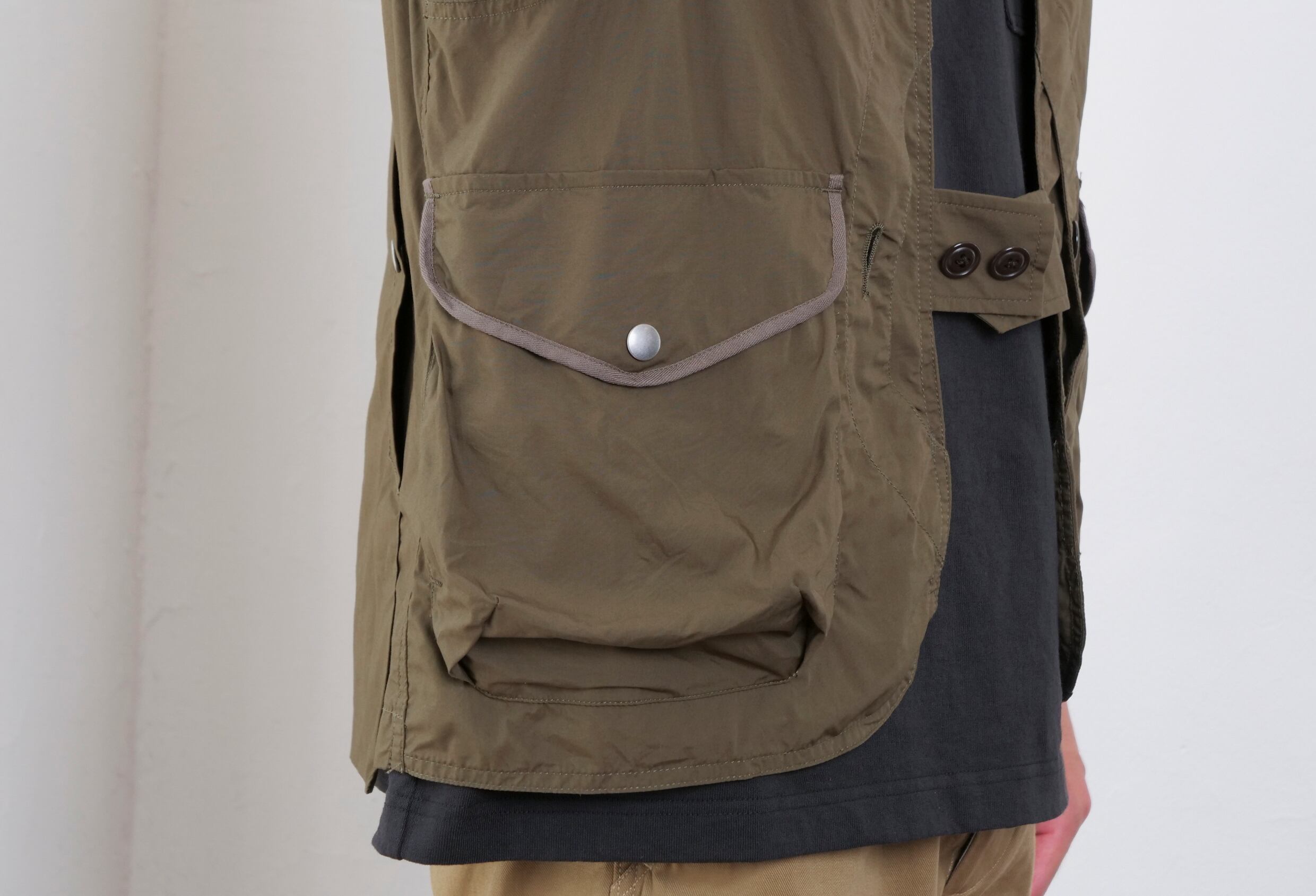 26SSは腰ポケットをパイピング使いのマチ付きとした。フロント身頃のポケット後ろ身のゲームポケットも合わせてバッグいらずの一枚。素材は上質なスーピマコットンを使用した薄手のタイプライタークロス。ゆったりとしたシルエットで春先はアノラックやアウターの上から、春から夏はTシャツの上から羽織るイメージ。