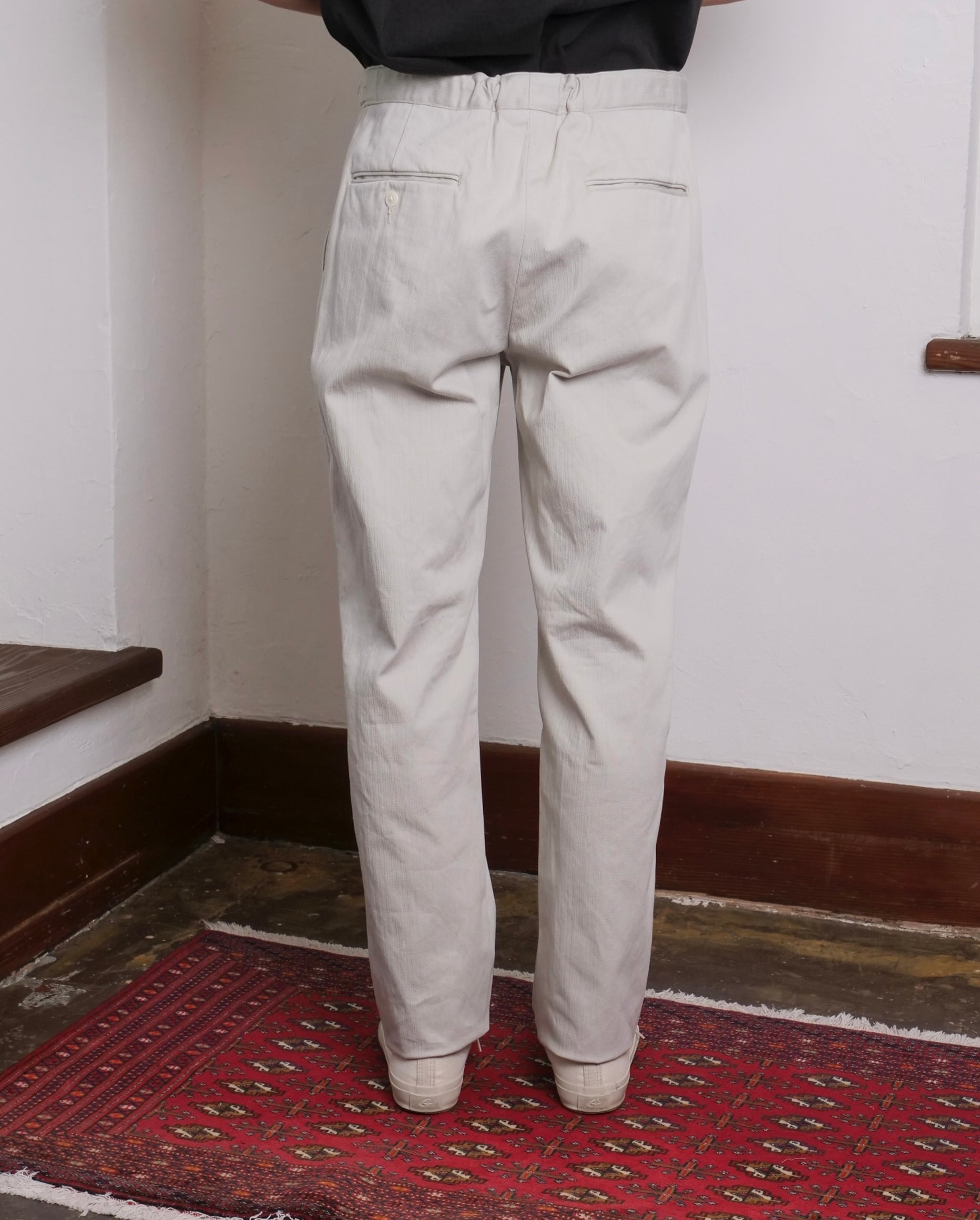 ゴム入りアジャストベルトのディティールを取り入れたクラシックなベルトレストラウザース。フロントはワンプリーツ、定番トラウザースのClarkeと同じ膝から下はややきつめのテーパードが入るシルエット。素材は畝が均一ではないランダムピケ。流加染料使用のため経年変化も楽しみな一本。
