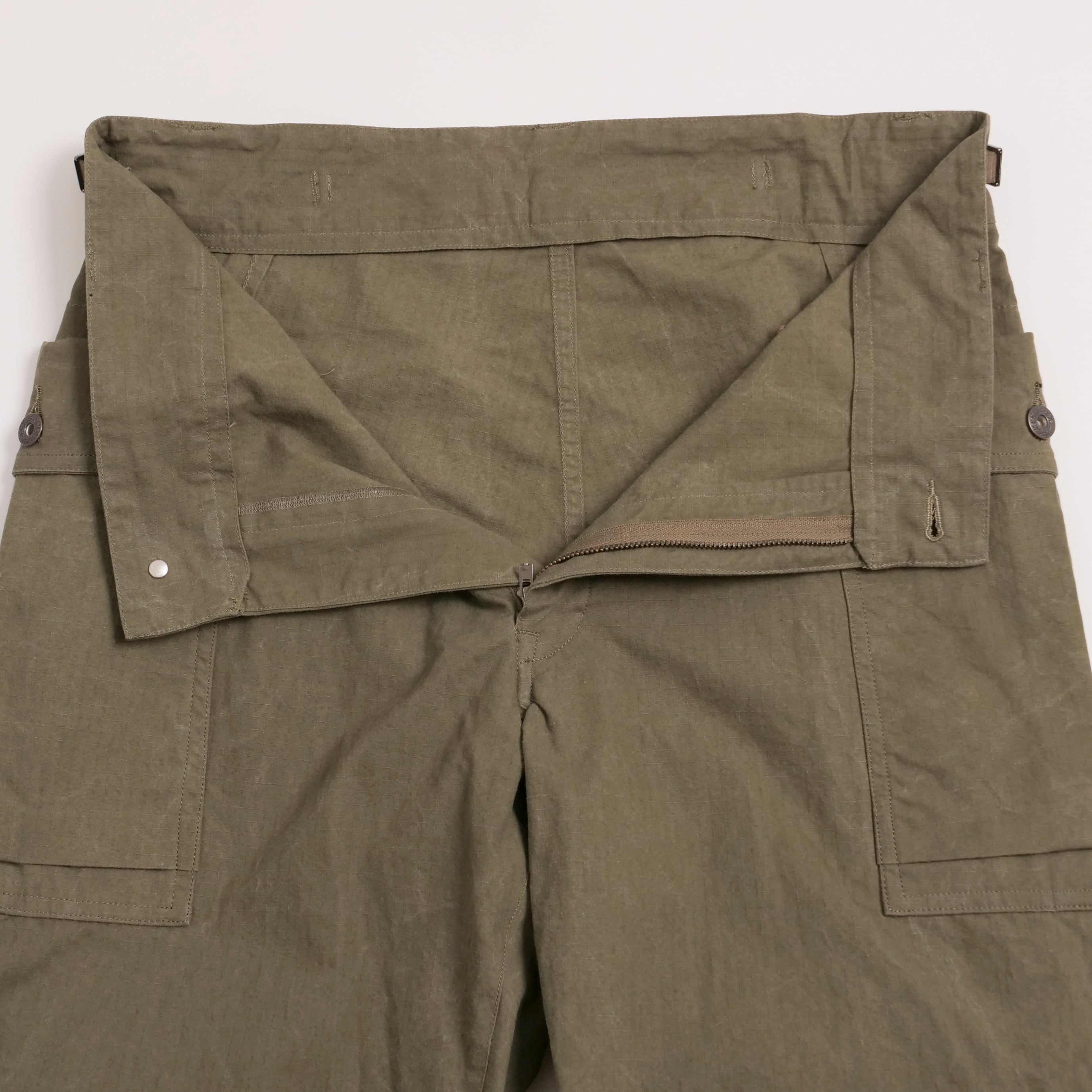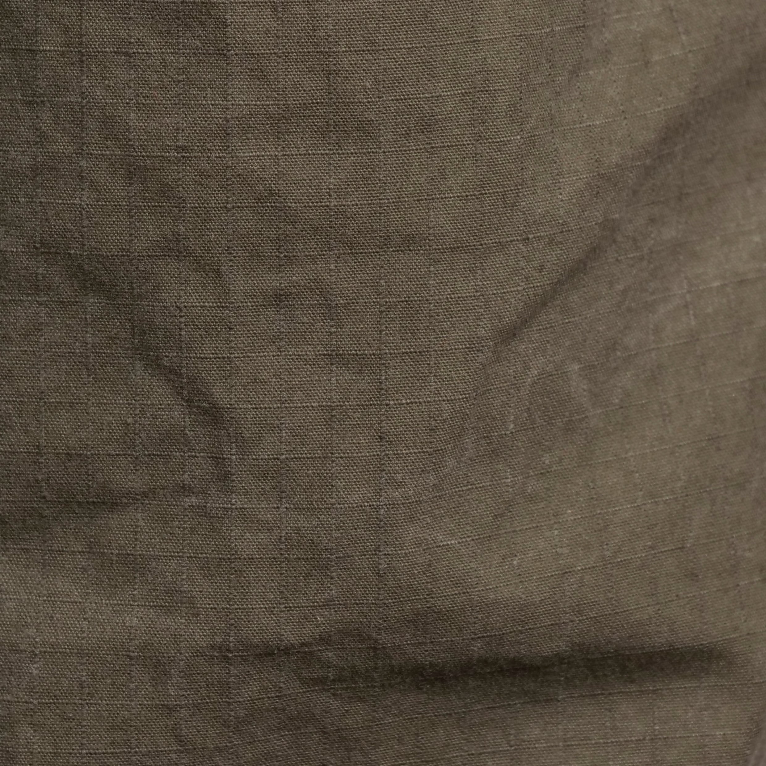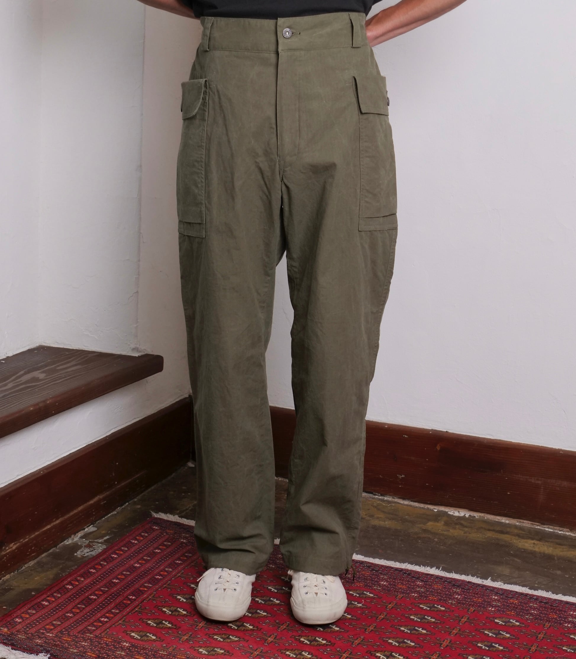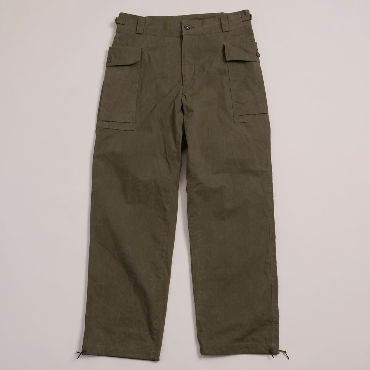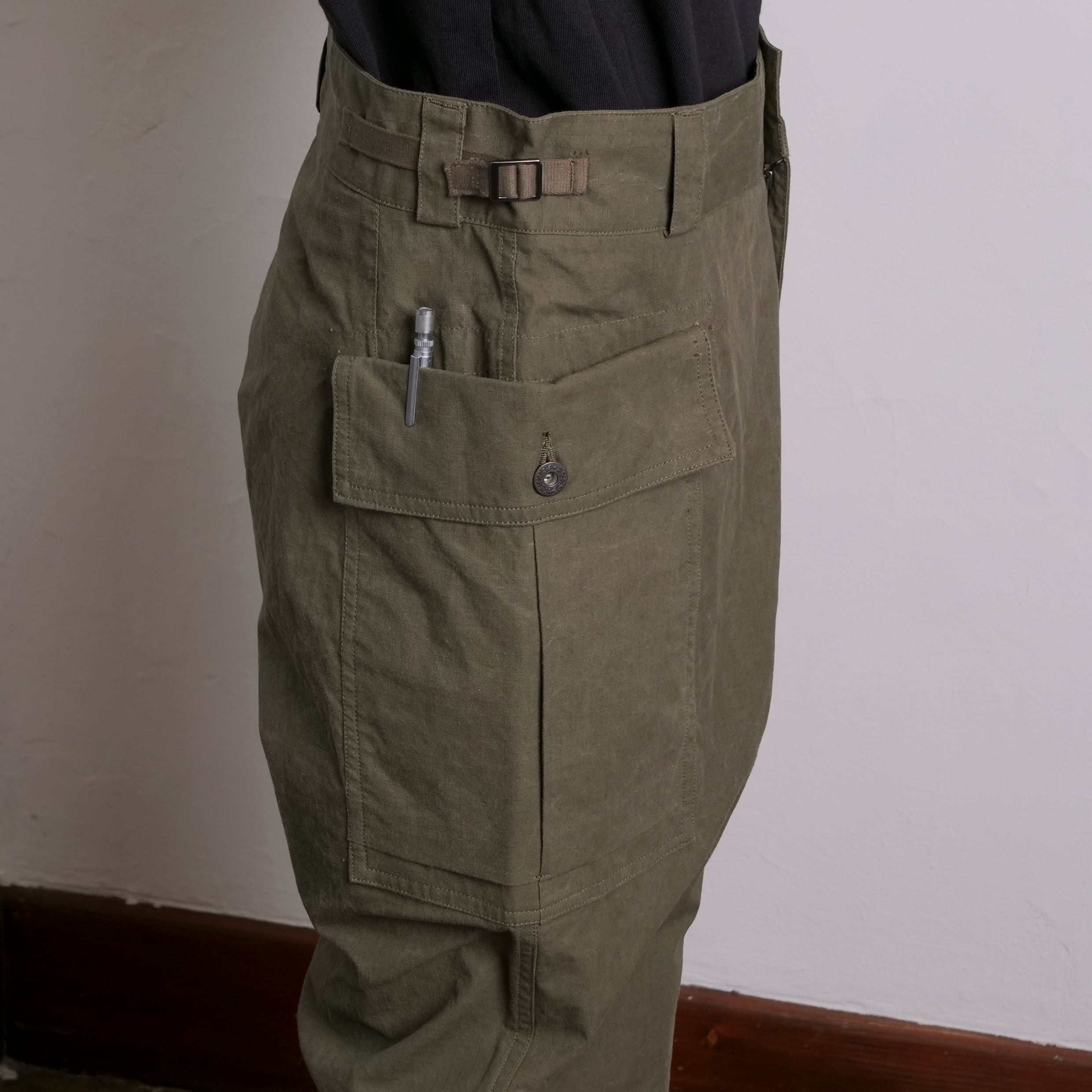 M-43カーゴパンツの最大の特徴である 腰ポケットを上からも手を入れられるダブルポケットとして使い勝手を考慮。 素材は顔料を載せ原反洗いをしたライトウエイトのコットンリップストップ。 製品でボールバイオ加工を施し履き込まれたイメージとなり、また経年変化も楽しめる一本。月桂樹ネオバボタンを使用。