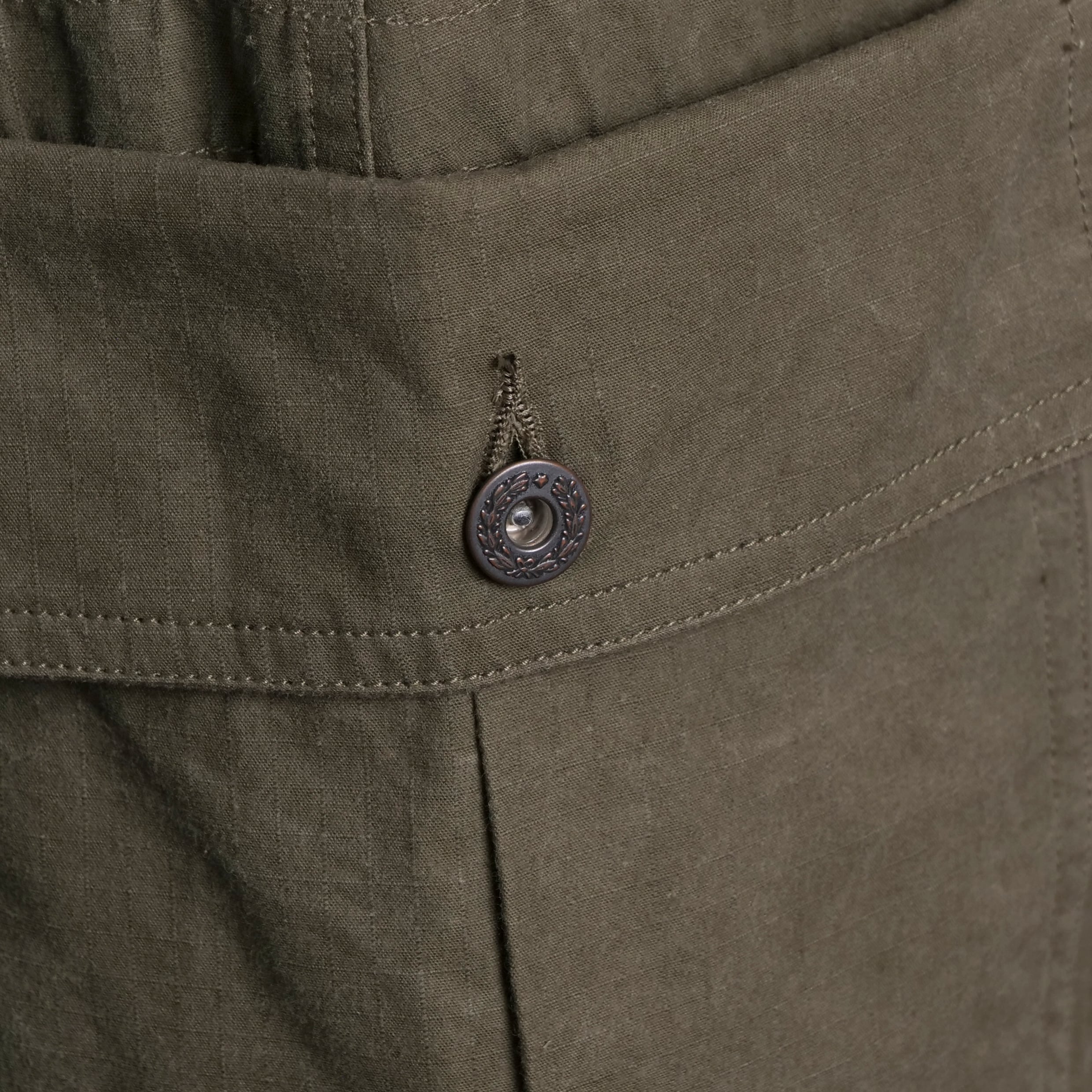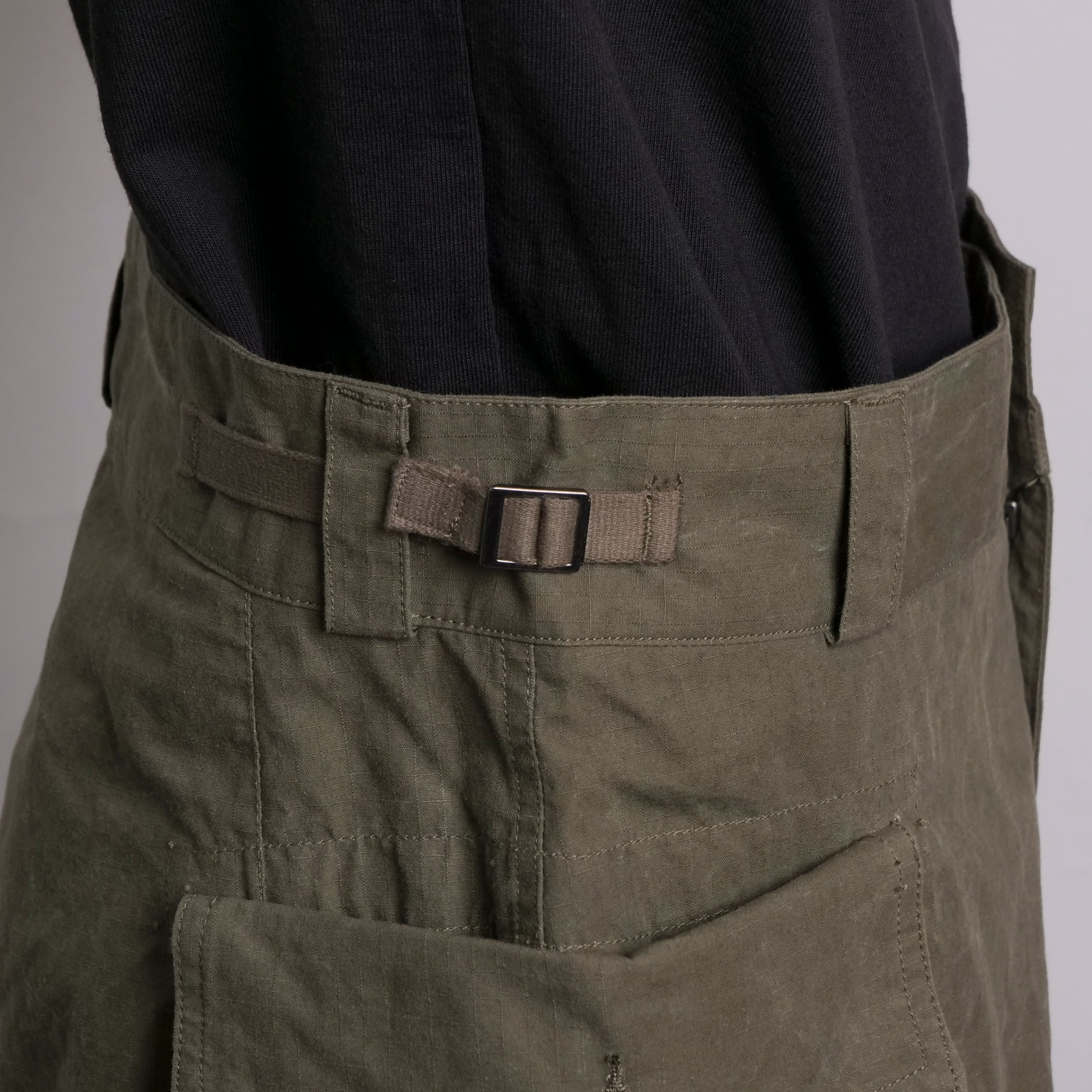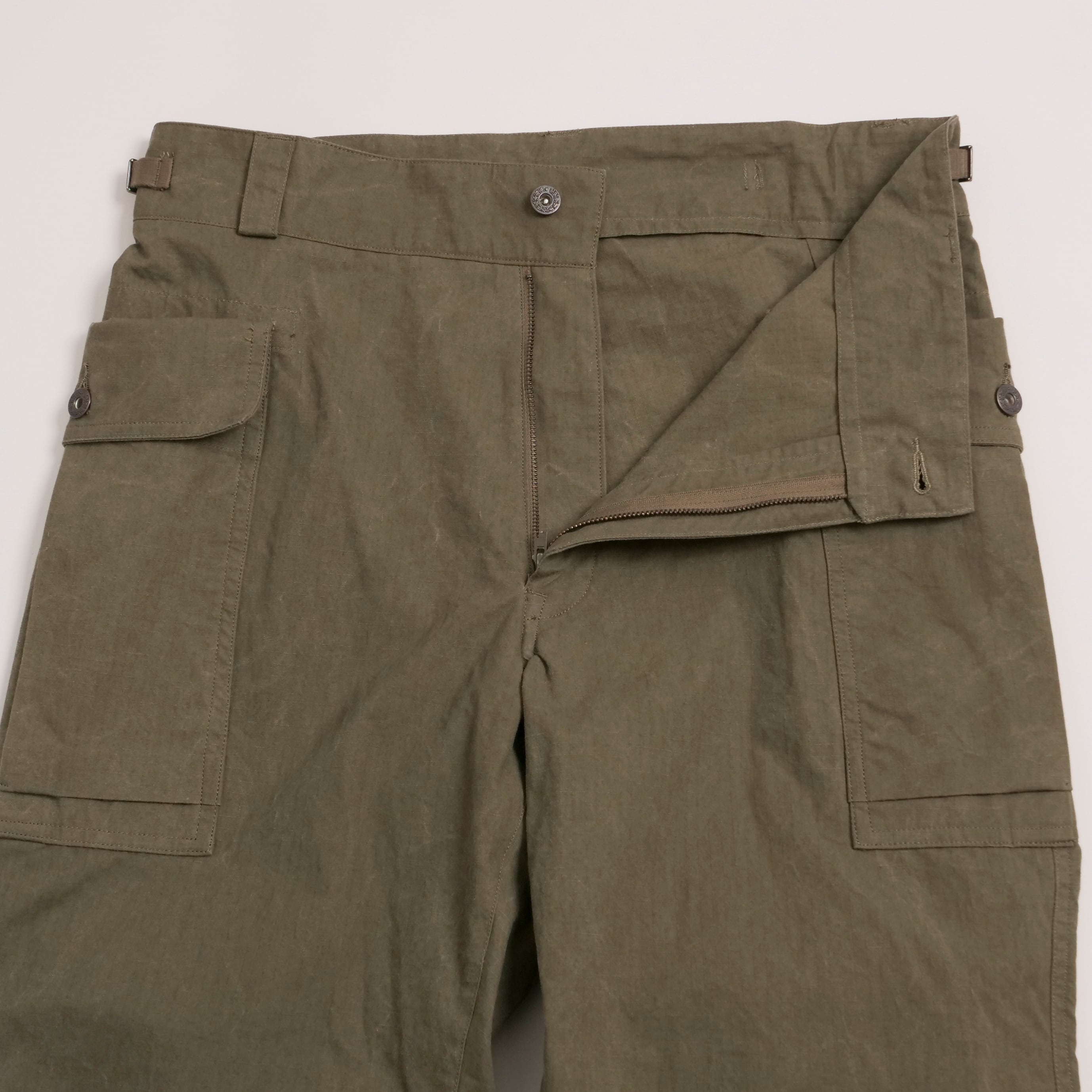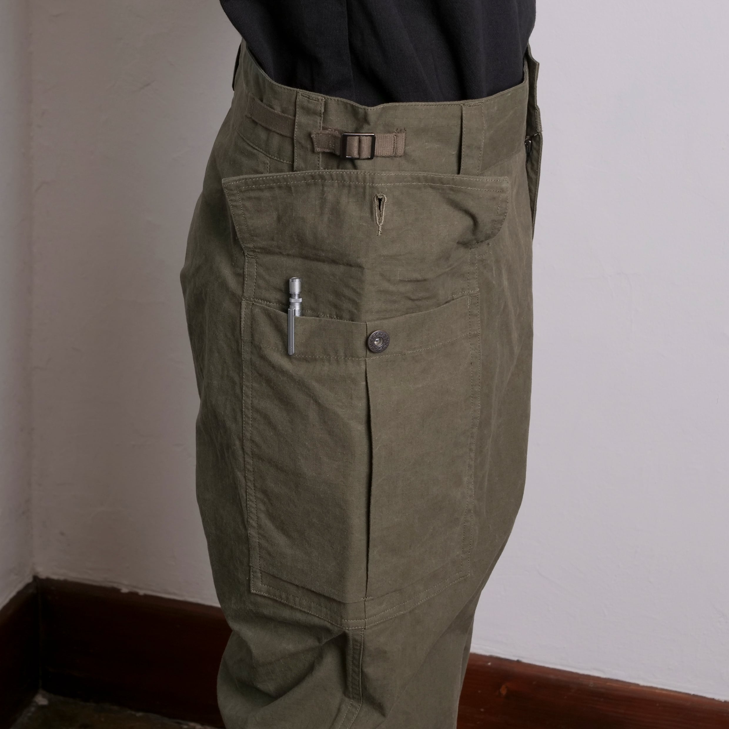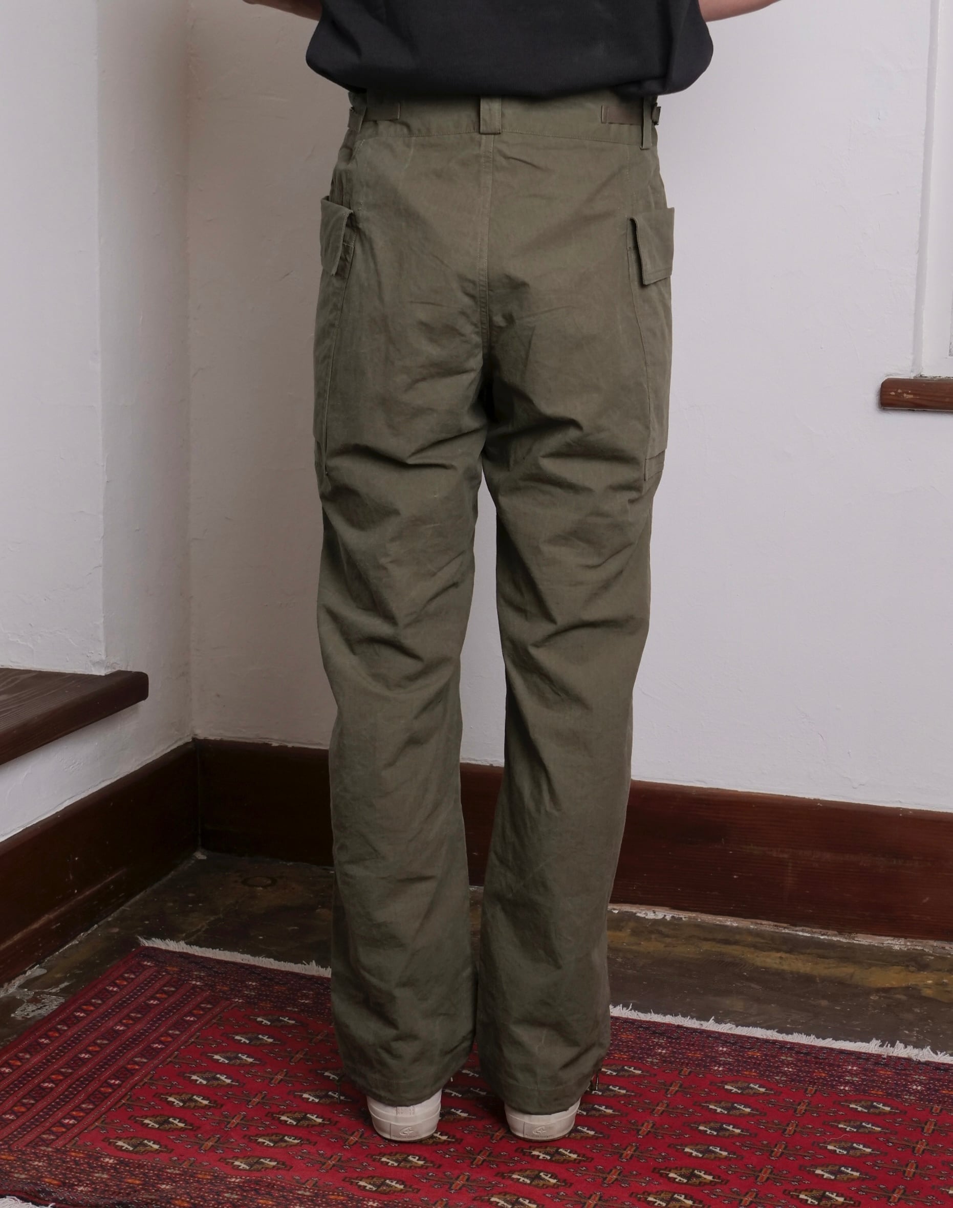M-43カーゴパンツの最大の特徴である 腰ポケットを上からも手を入れられるダブルポケットとして使い勝手を考慮。 素材は顔料を載せ原反洗いをしたライトウエイトのコットンリップストップ。 製品でボールバイオ加工を施し履き込まれたイメージとなり、また経年変化も楽しめる一本。月桂樹ネオバボタンを使用。