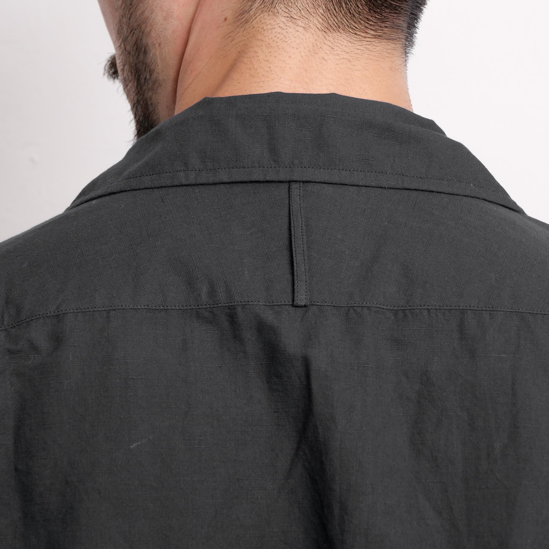 イギリスをはじめとするヨーロッパのレジャーシャツに見られるシャークカラーとボックスプリーツのサファリポケットを合わせた一枚。脇は3mm細巻きの本縫いで裾スリット仕様。素材は程よい凹凸がある綿麻のグログランシャンブレー。ミリタリーテイストを落とし込んだリゾートシャツイメージ。