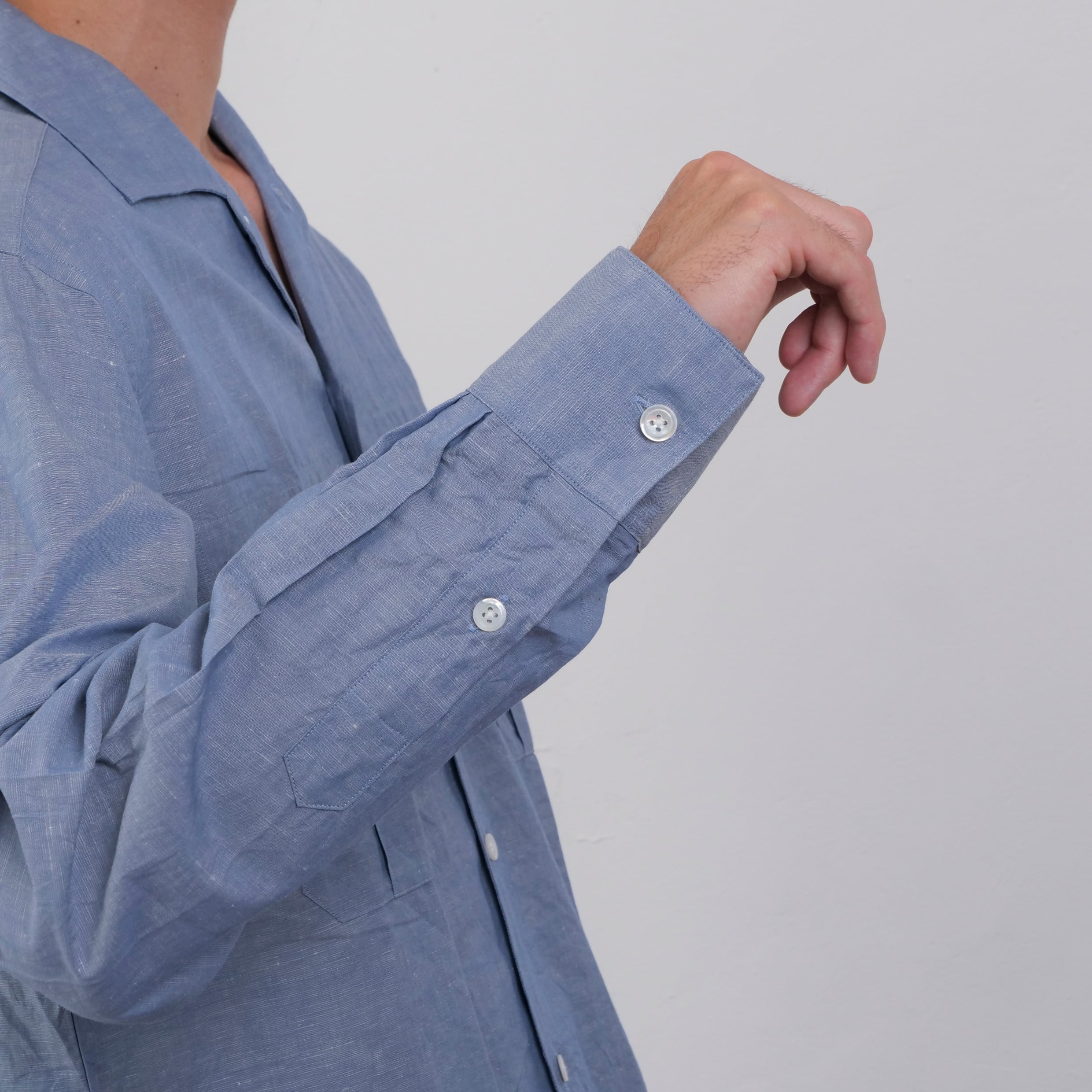 イギリスをはじめとするヨーロッパのレジャーシャツに見られるシャークカラーとボックスプリーツのサファリポケットを合わせた一枚。脇は3mm細巻きの本縫いで裾スリット仕様。素材は程よい凹凸がある綿麻のグログランシャンブレー。ミリタリーテイストを落とし込んだリゾートシャツイメージ。