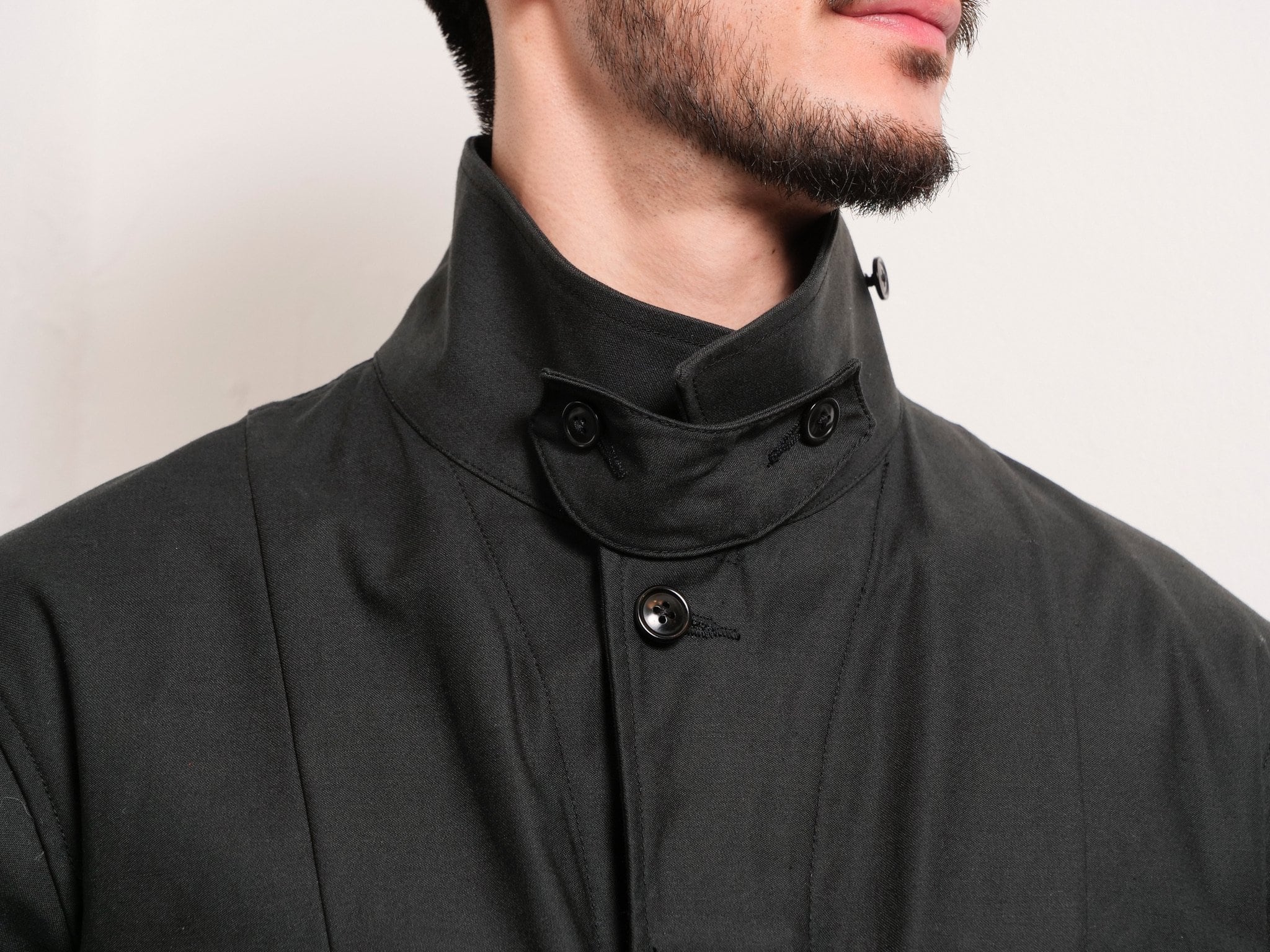 ボタンはナットボタン、襟裏に取り外し可能なチンウォーマーを備える仕様。