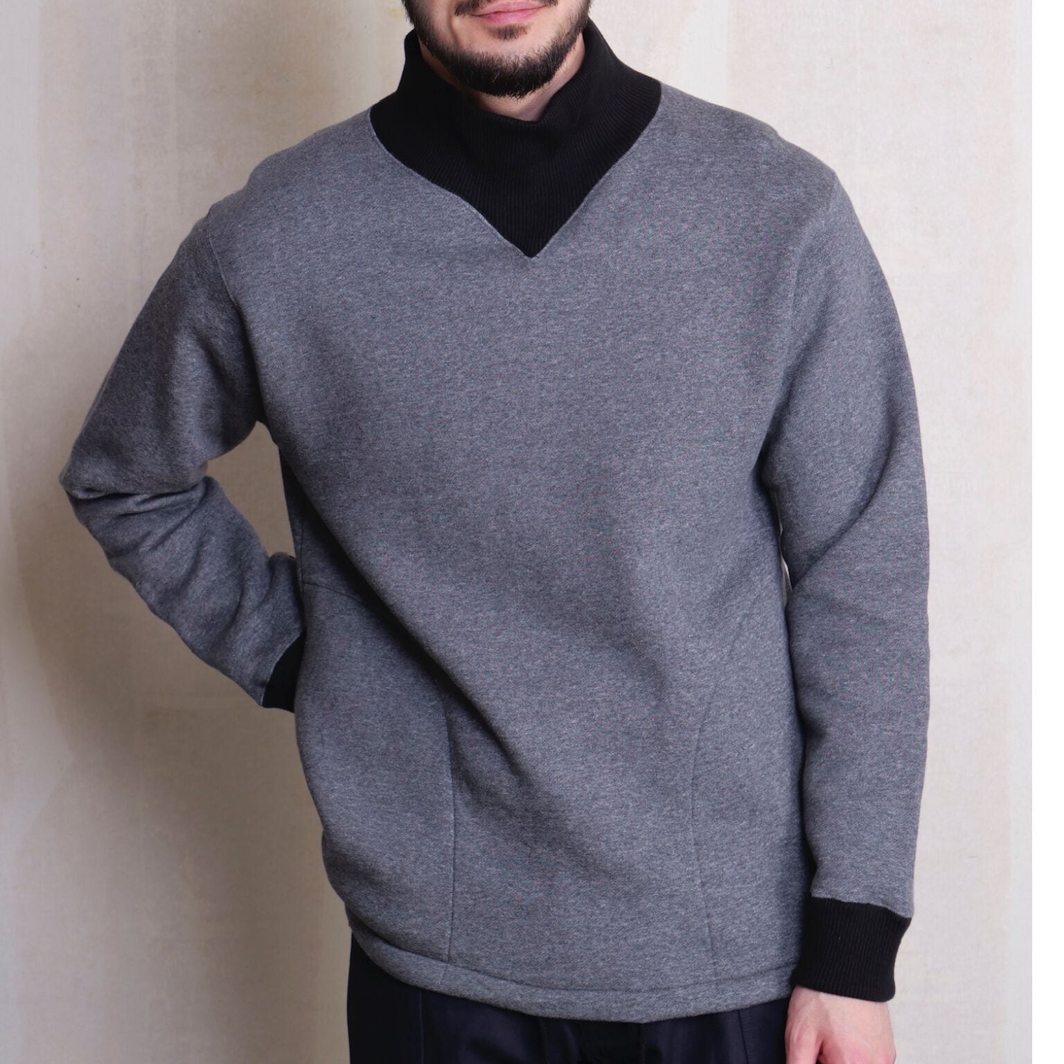 裏起毛の裏毛に置き換えた タートルネックプルオーバー。