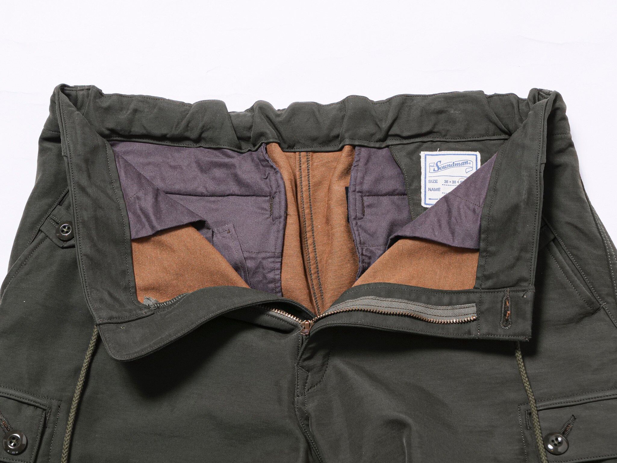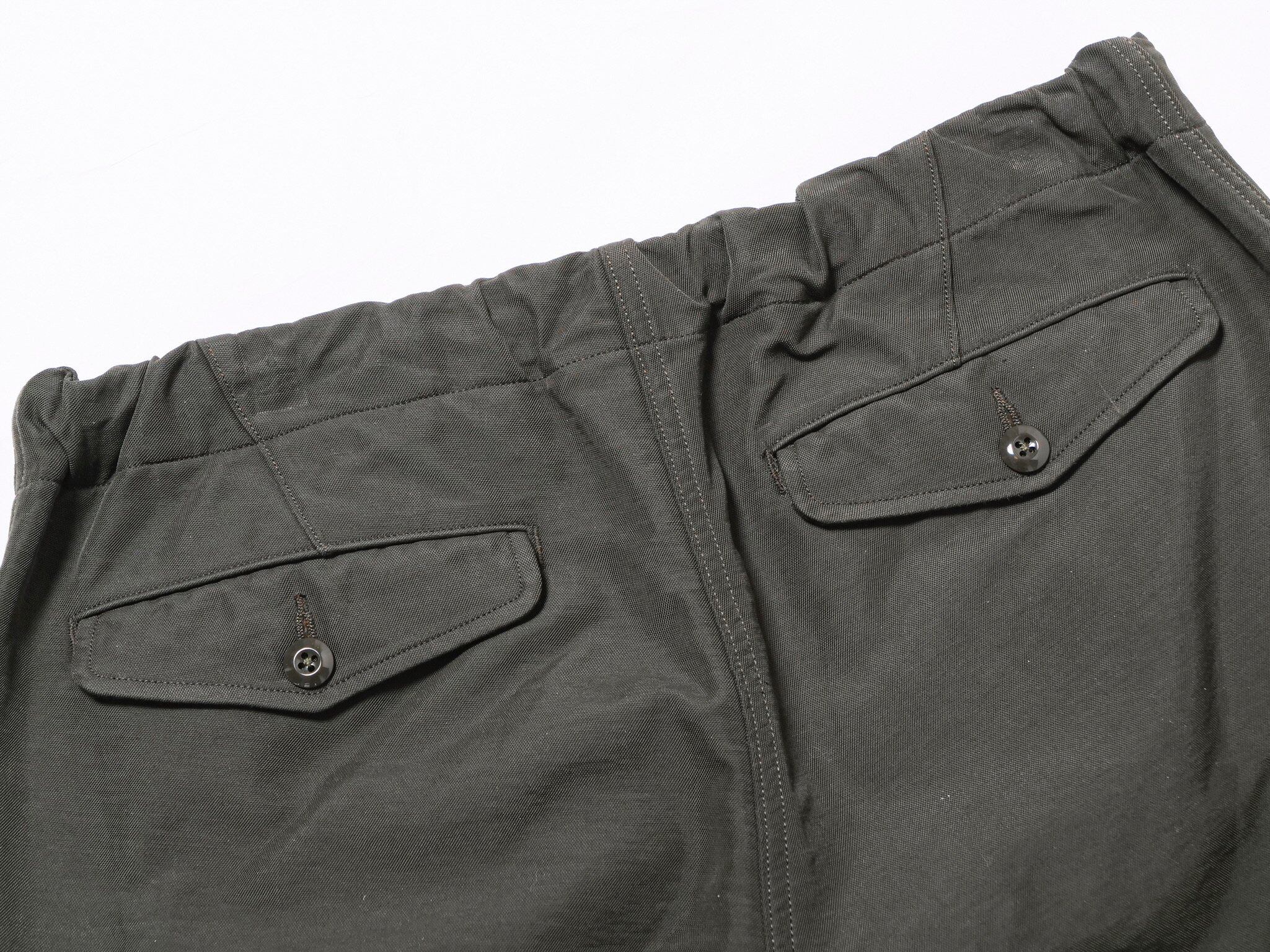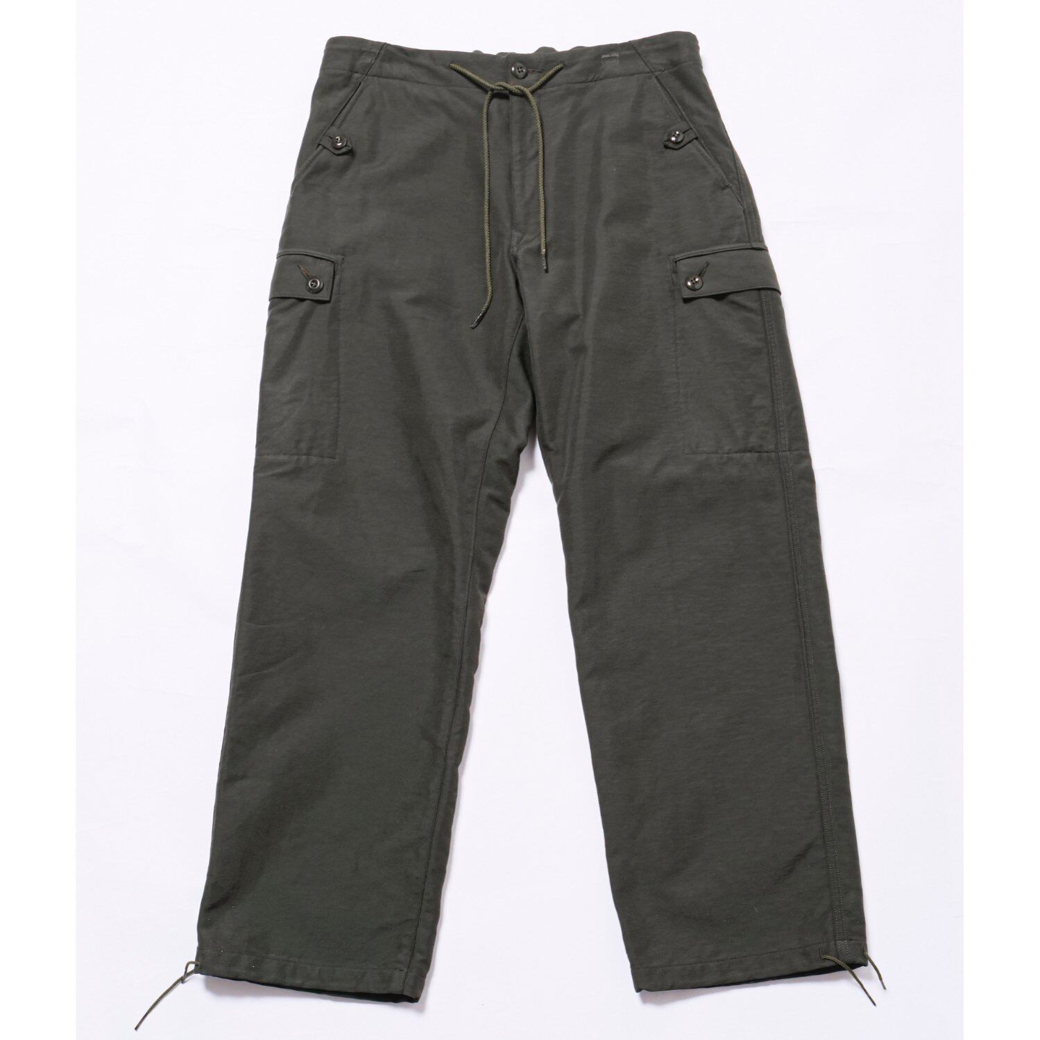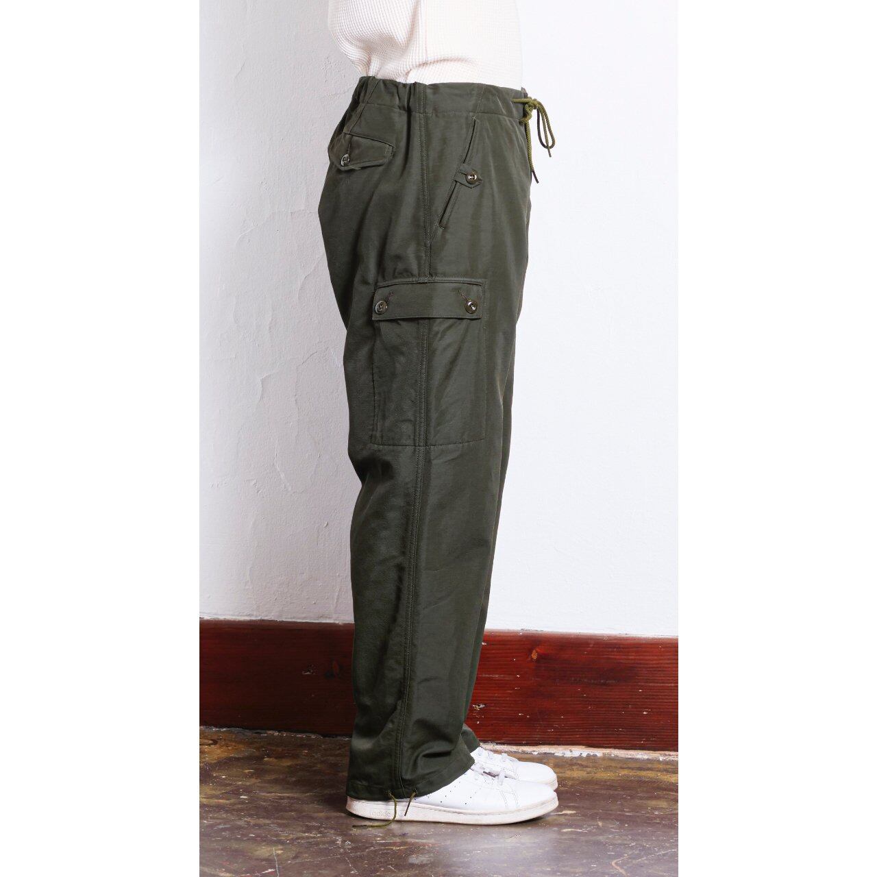 西ドイツ軍のオーバーカーゴパンツをイメージソースとし後身をゴム入りとした'イージーパンツ。カーゴポケットは内側から袋をたたきフラップのみが表に出る。