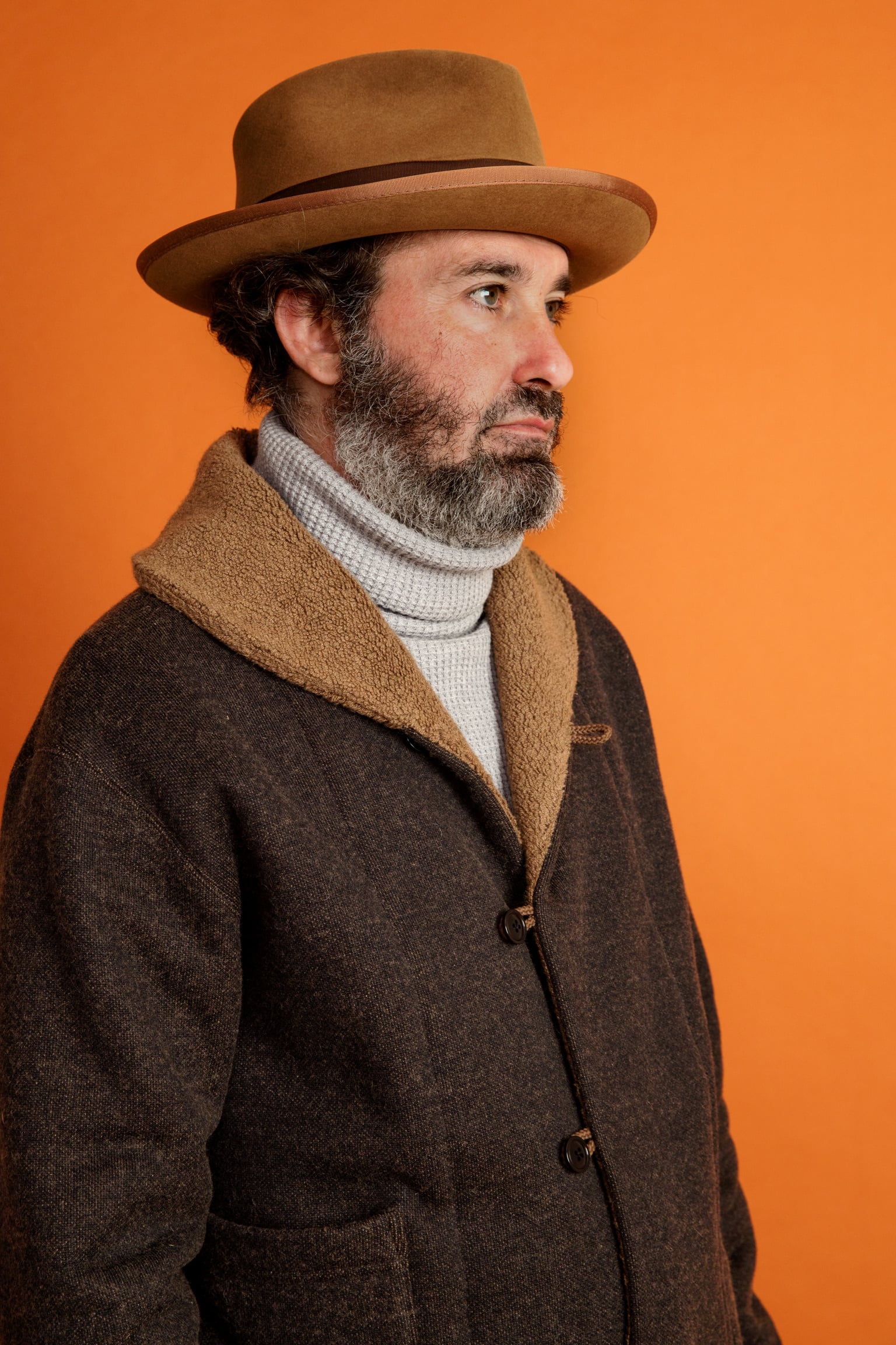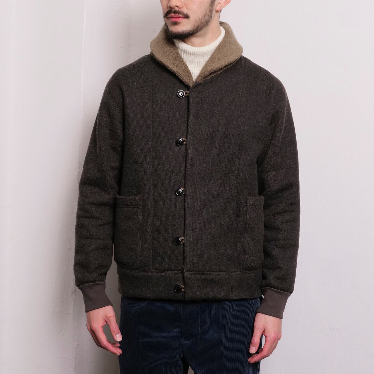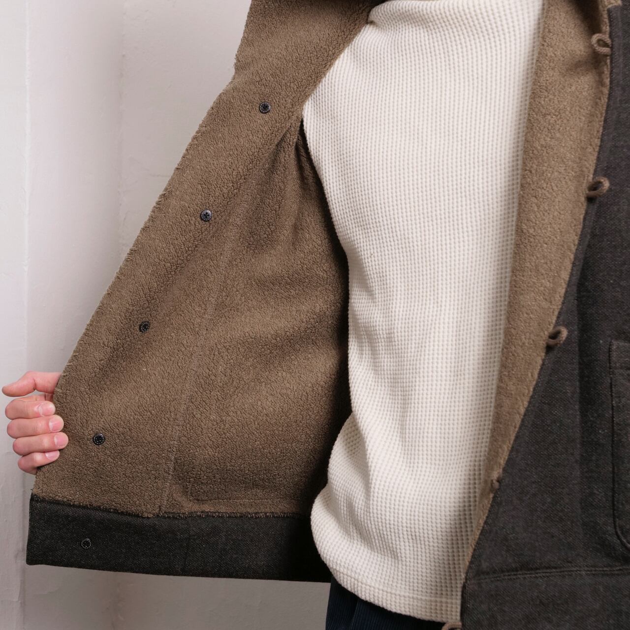 昨年作成のダブルブレストから打ち合いの深いシングルブレストに 、袖口もリブ仕様にすることより羽織りやすくリデザインした。