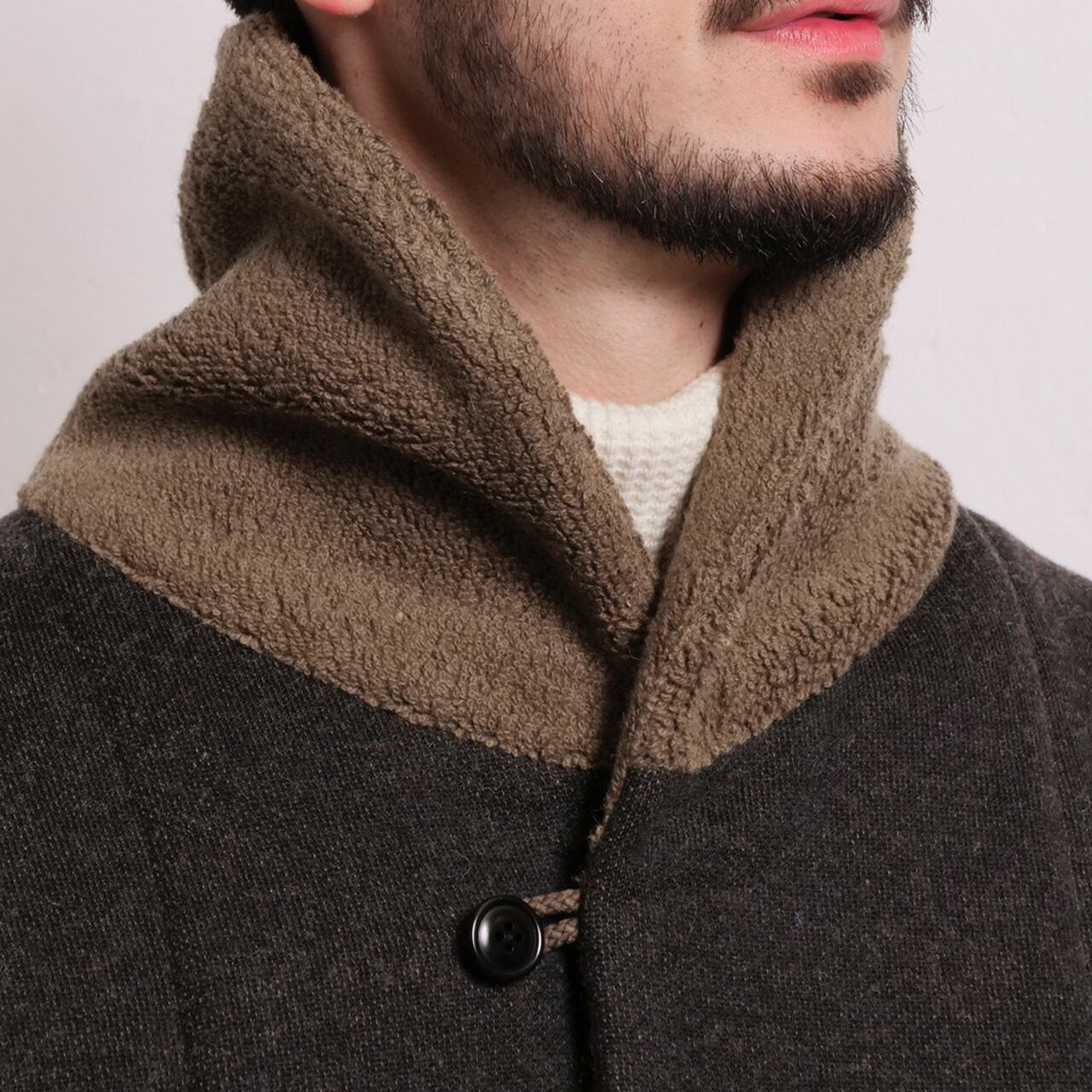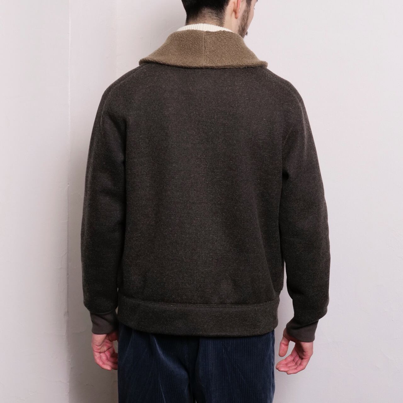ウールコットン混紡のボアを使用したショールカラーカーディガン。